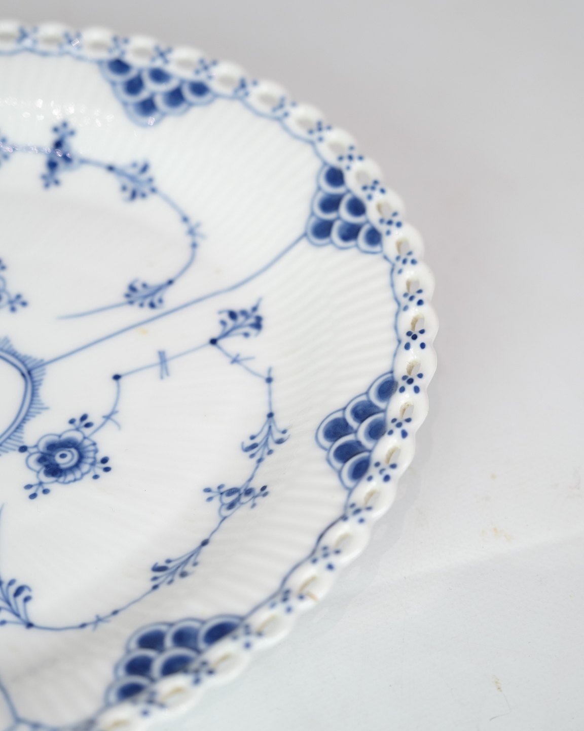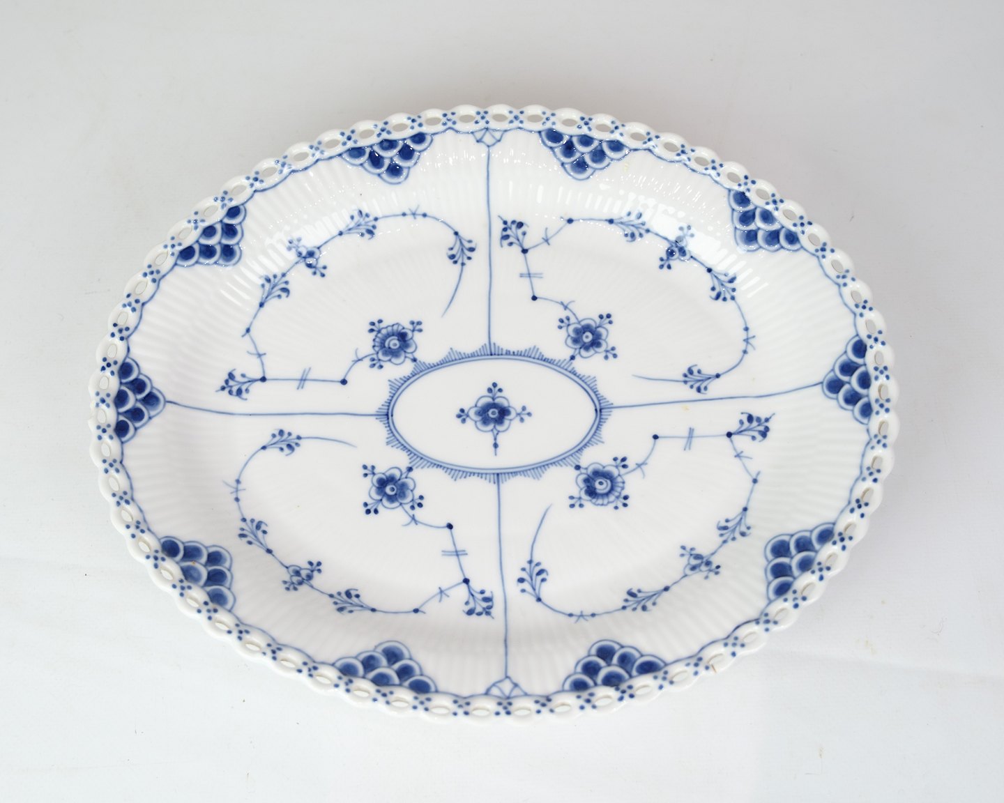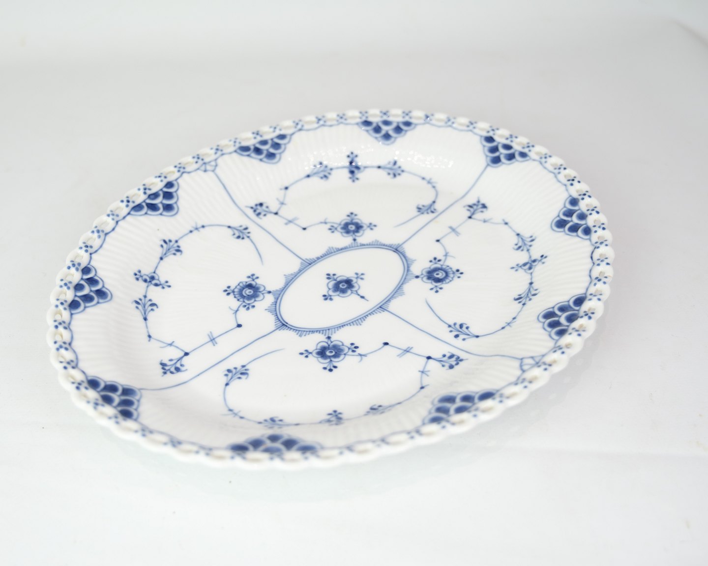 Large oblong serving dish of hand-painted Royal Copenhagen in the patterned blue fluting full lace no. 1058. In very good condition without any damage with a beautiful clear hand-painted blue color. 2 pcs. in stock