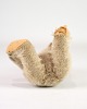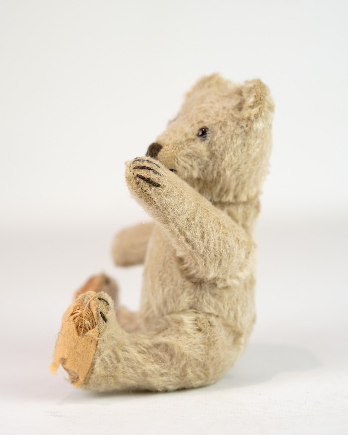 Old teddy bear in beige mohair. The teddy bear has black glass eyes, an embroidered nose and paws with sewn details. The feet show clear signs of use and patina. A nice little collector's teddy bear with an authentic expression.