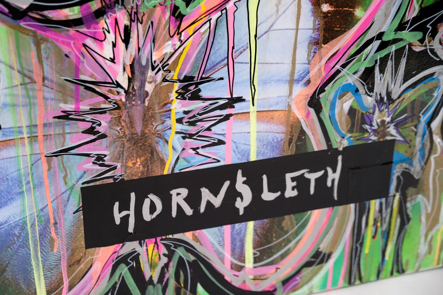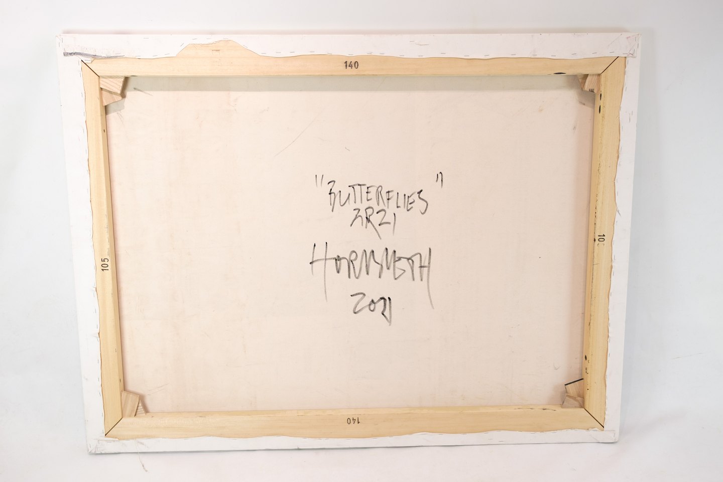 Originalt maleri af Kristian von Hornsleth i mixed media på lærred fra 2021 med titlen "Butterflies ART". Maleriet måler ca. 106 x 140 cm og er et karakteristisk eksempel på Hornsleths farverige og energiske stil. Værket er domineret af sommerfuglemotiver i lag på lag af kraftige penselstrøg, dryp og kontrastfulde farver, med det ikoniske "HORNSLETH"-navn centralt placeret.