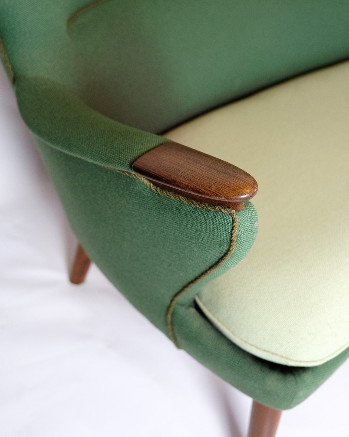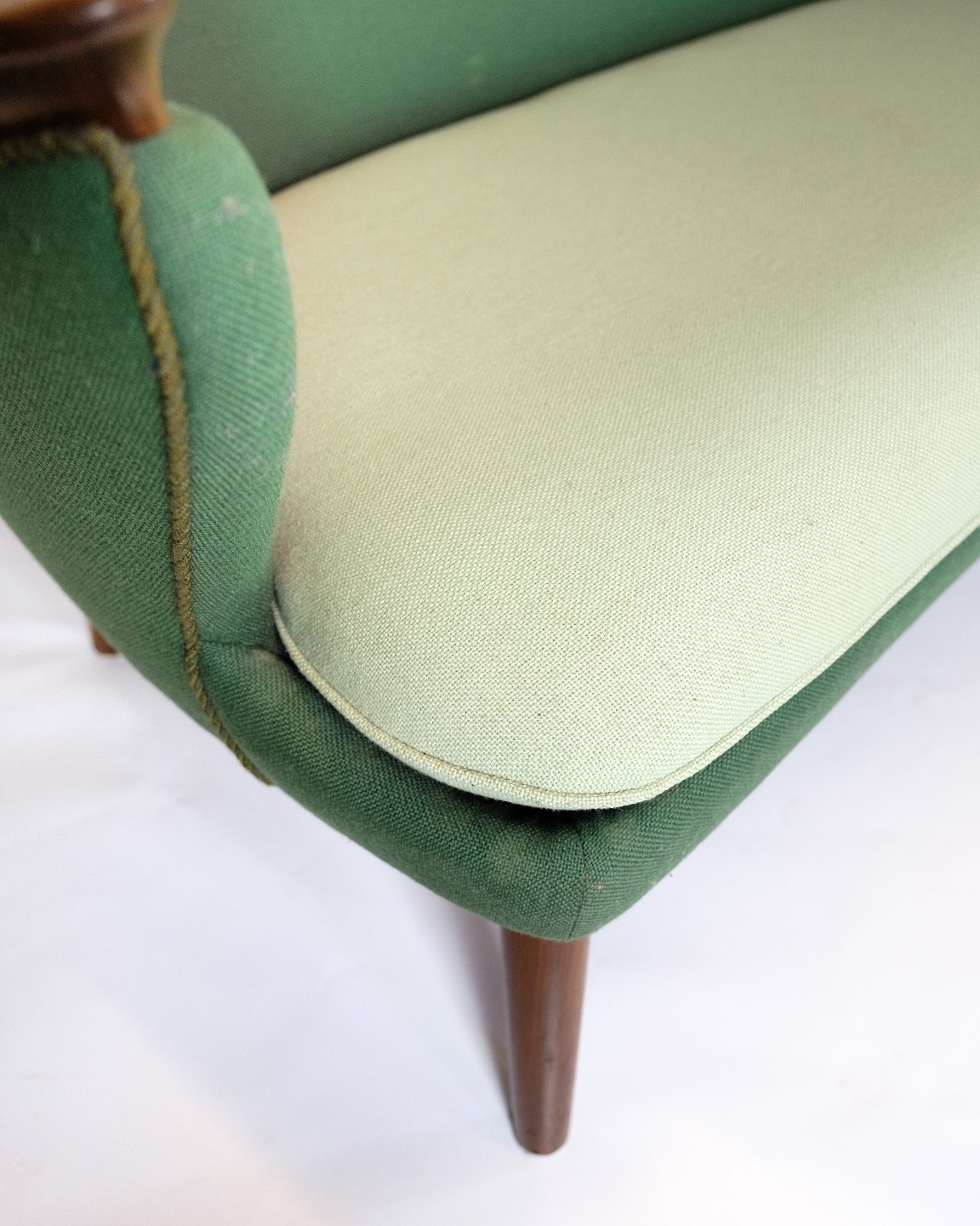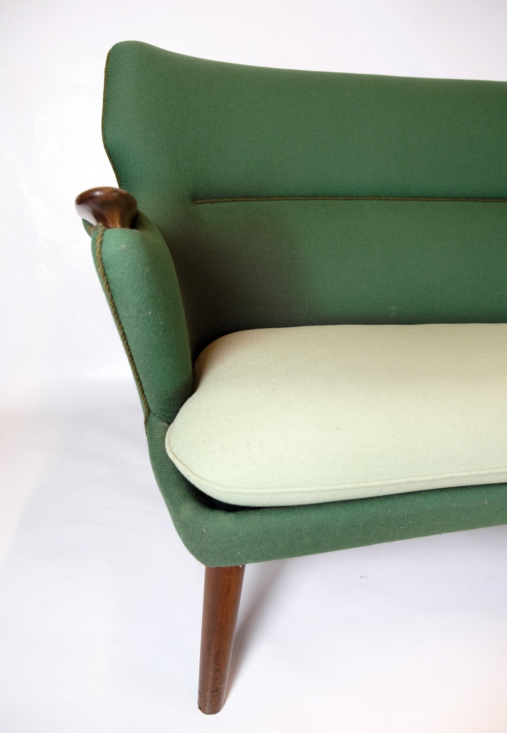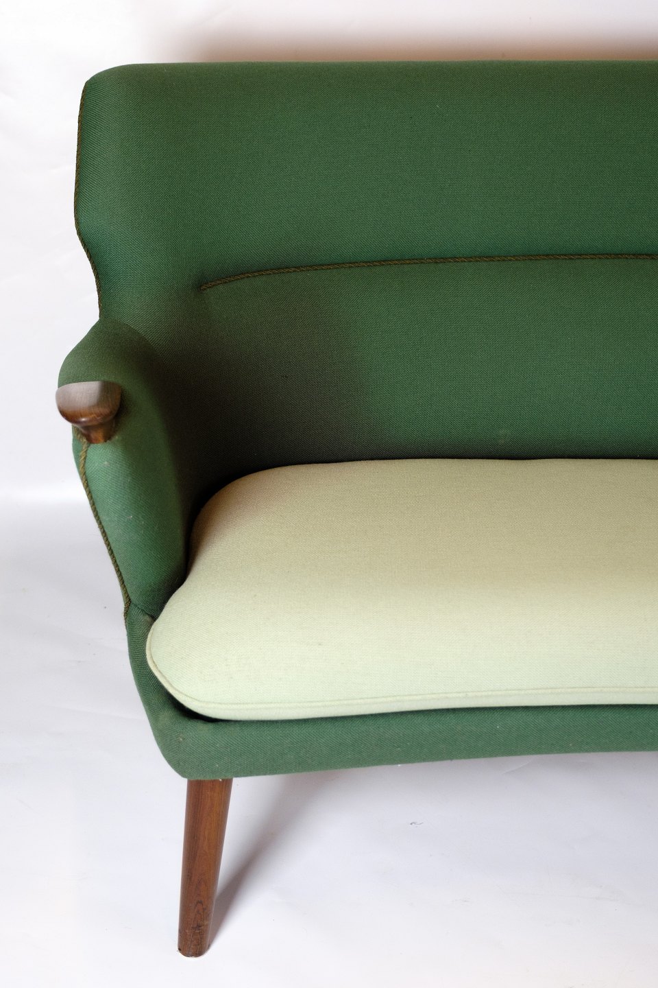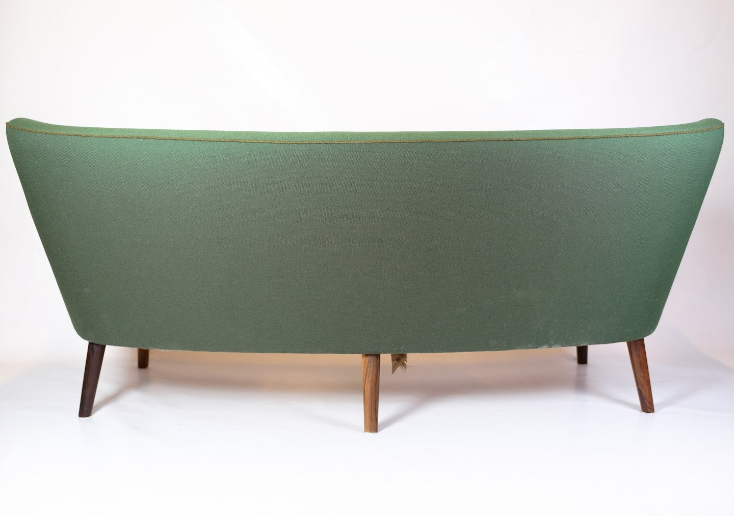 Green Sofa model 220, with light cushion cover by the Danish furniture architect Kurt Olsen. The sofa was made in the 1960s with high quality fabric with "nails" and legs of solid rosewood. The sofa appears in fine used condition with wear and tear.