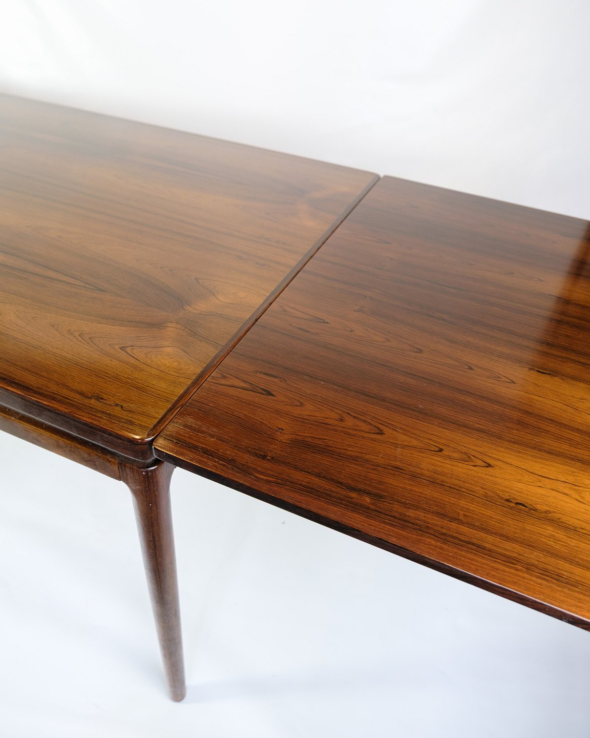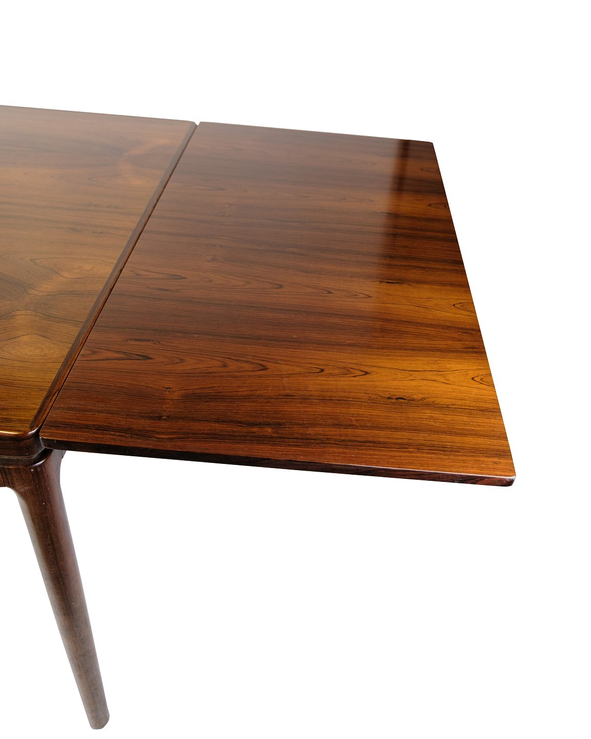Dining table with extension in rosewood, designed by Johannes Andersen and produced by Chr. Linnebergs Møbelfabrik in the 1960s. The table has an integrated extension hidden in the frame for an elegant and coherent expression. Johannes Andersen (1903–1991) is known for his organic design and use of noble materials. A classic example of Danish mid-century design.