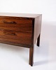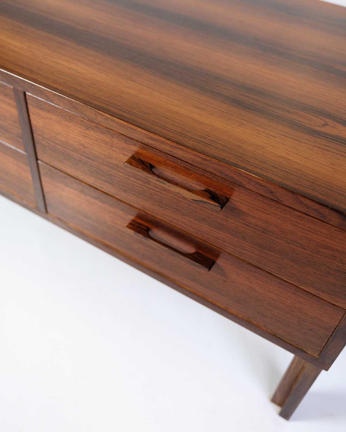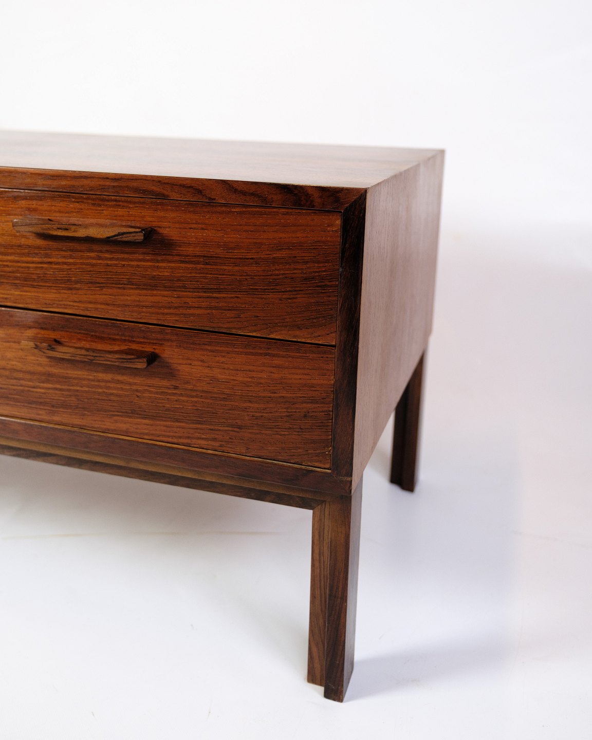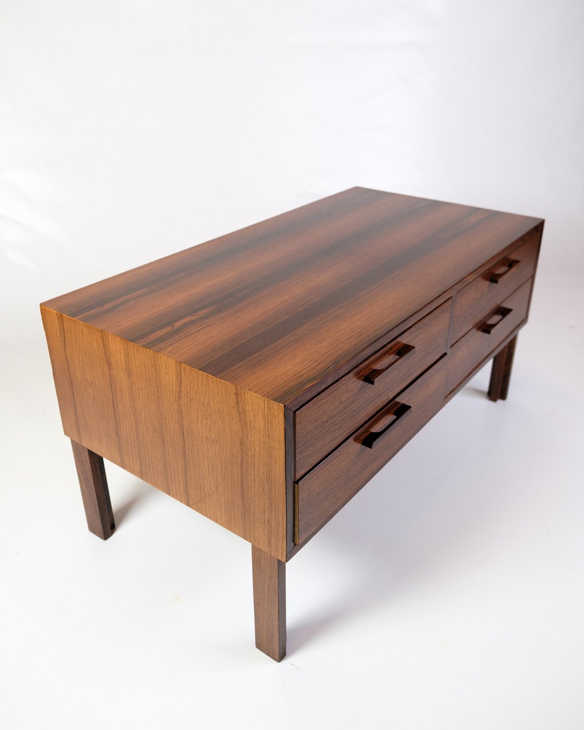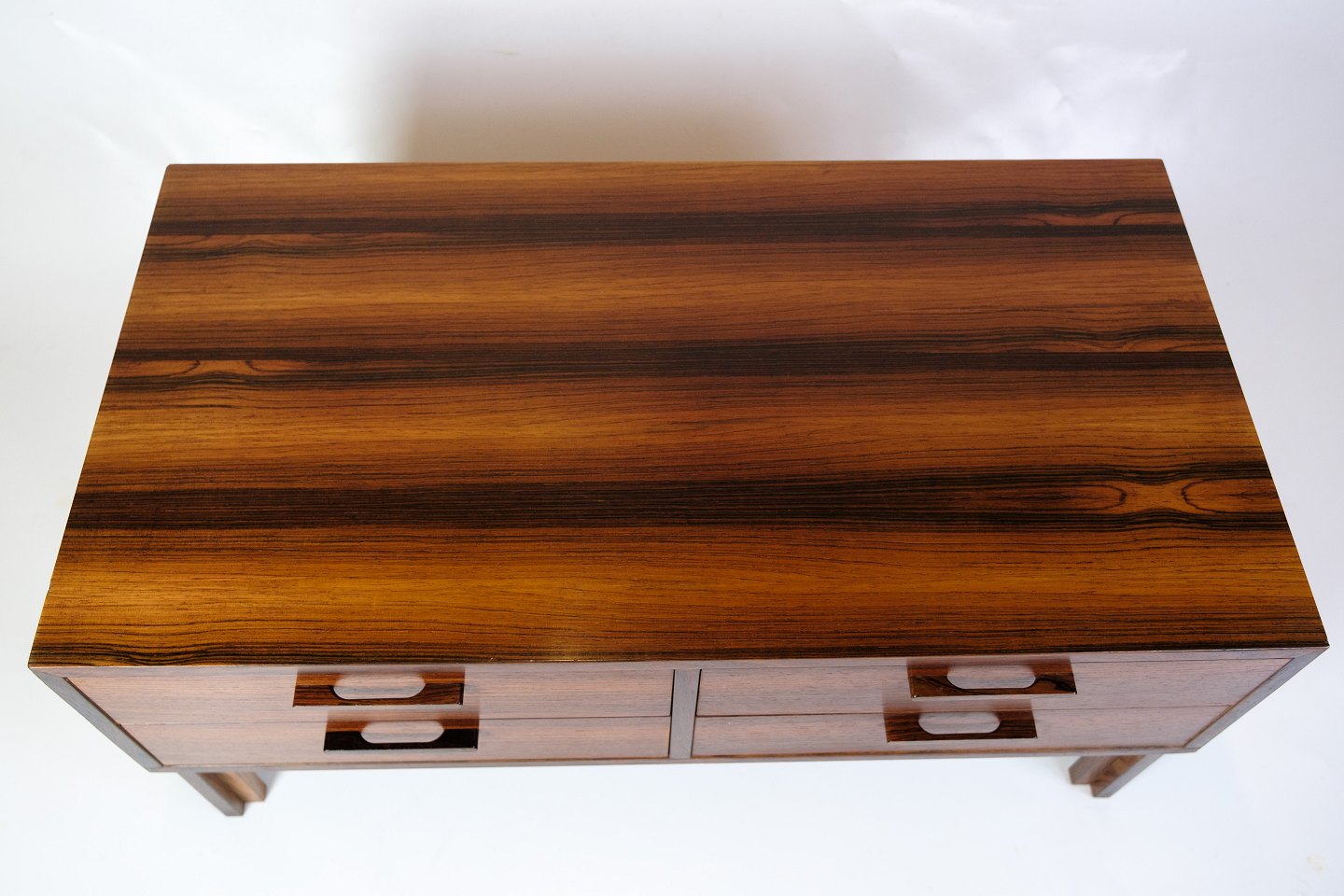SolgtLille kommode i palisander med fire skuffer, ideel til opbevaring i stue, soveværelse eller kontor. Kommoden er fra ca. 1960’erne og repræsenterer klassisk dansk design med fokus på funktionalitet og naturlige materialer.