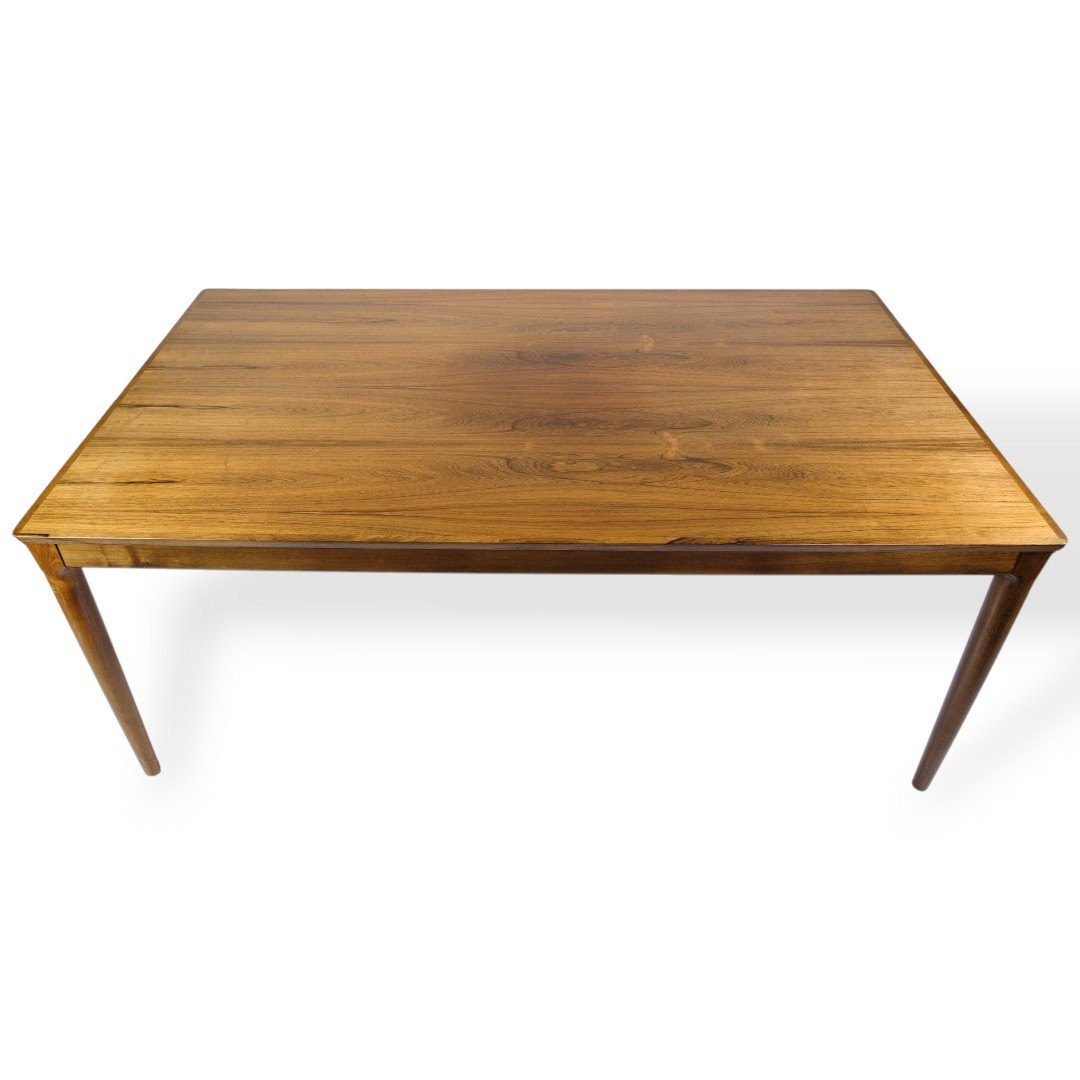 Extendable dining table, made of rosewood, manufactured by Sorø Møbelfabrik in the 1960s. The table has two extension leaves, each 52.5 cm, which provides flexible expansion options. Classic Danish design with a focus on functionality, craftsmanship and beautiful materials.
