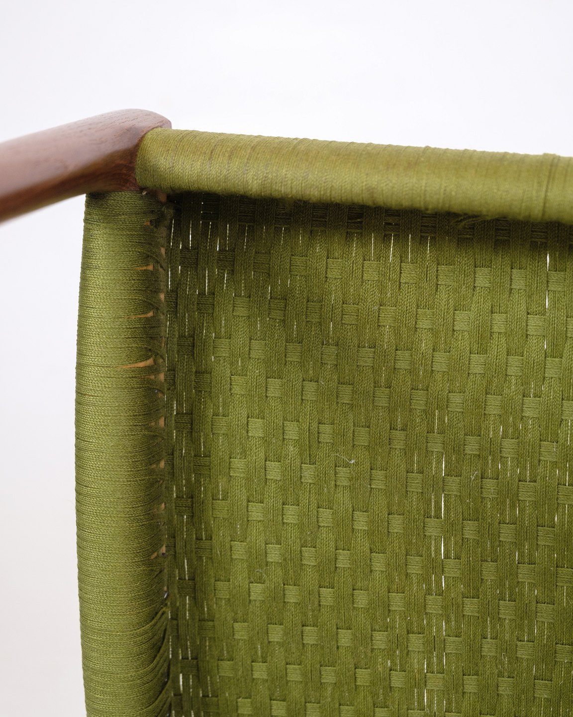 SoldSix dining chairs designed by Niels O. Møller in the 1960s. Model 77 is made of teak with seats in green paper wicker. The chair's simple lines and curved backrest provide good seating comfort and a clear design language that has made Møller's design a permanent part of Danish furniture history. A solid choice for both classic and modern interiors.