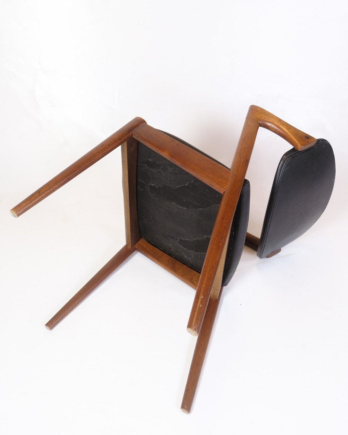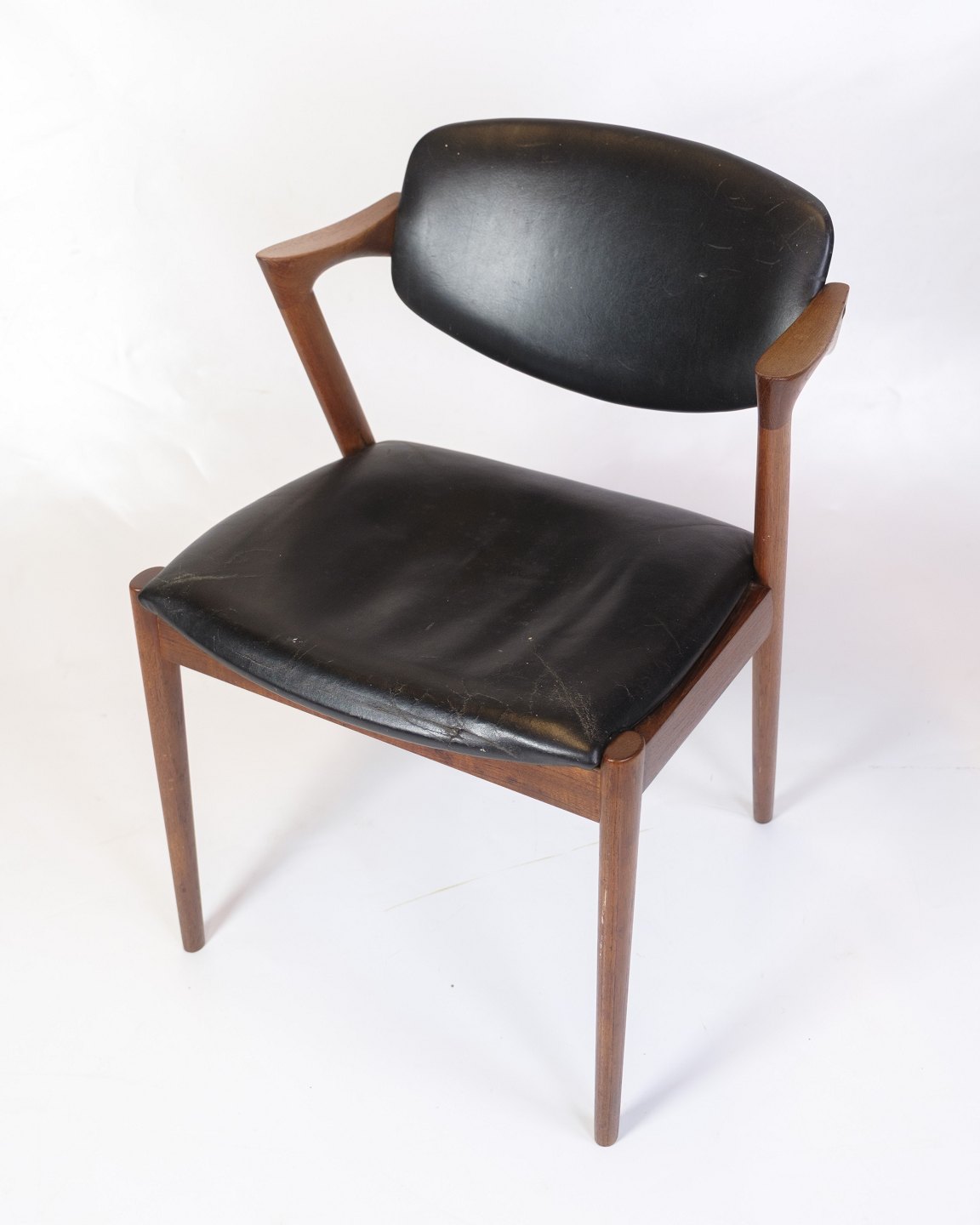 Model 42 is a dining chair designed by Kai Kristiansen and manufactured by Schou Andersen in the 1960s. The chair is made of solid teak with black aniline leather and has a characteristic tilting back that combines comfort with a sharp, light design. A beautiful example of Danish furniture art, where functionality and aesthetics go hand in hand.