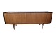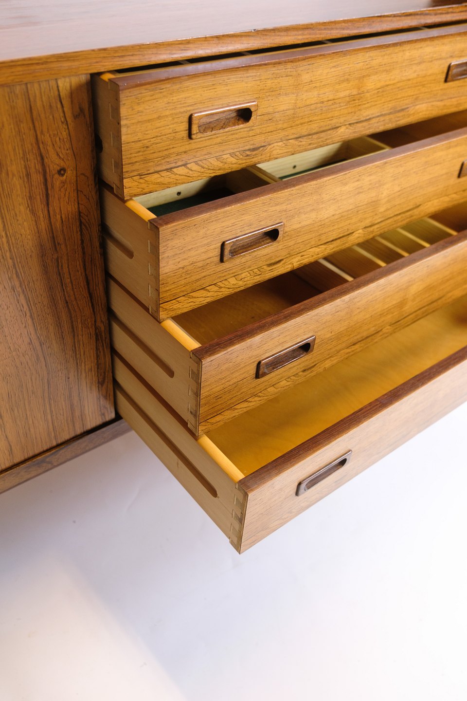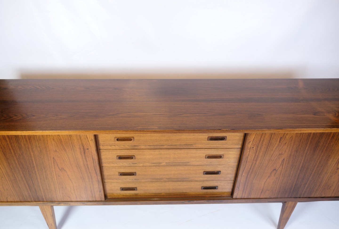 Large sideboard in rosewood with distinctive grain patterns, sliding doors and four centrally placed drawers with milled handles. The complete design and the slightly sloping legs give the furniture a floating lightness that characterizes Danish design from the 1960s.