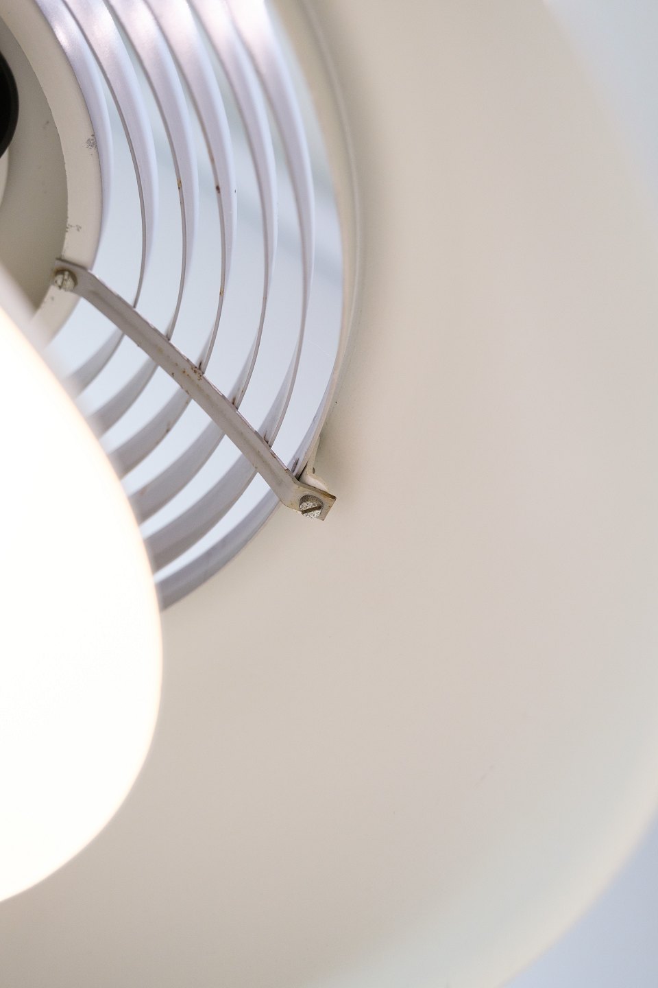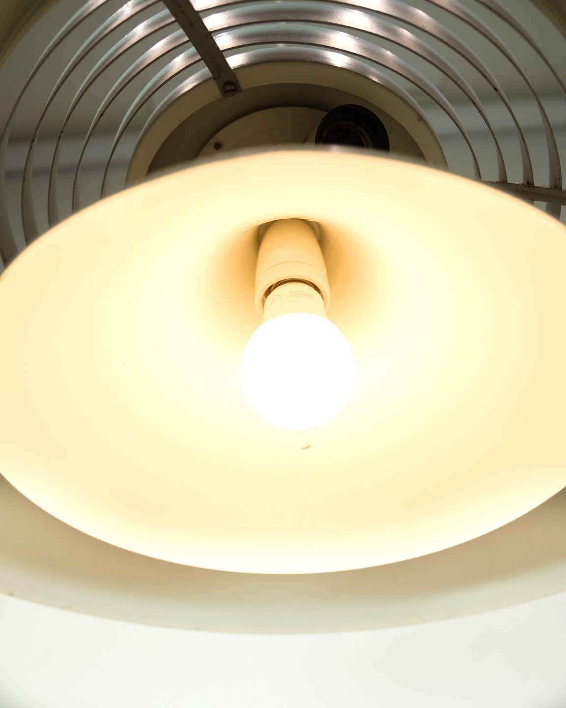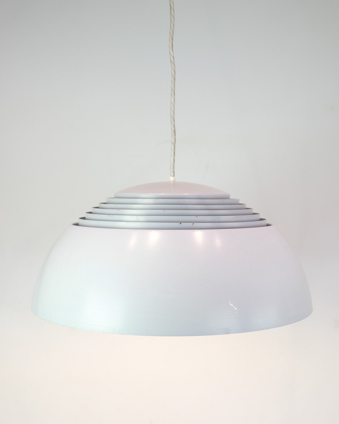 AJ Royal pendlen blev designet af Arne Jacobsen i 1957 som en del af det samlede designkoncept til det daværende SAS Royal Hotel i København. Produktionen blev kort efter sat i gang af Louis Poulsen, som fortsat fremstiller lampen i dag. Denne udgave er i grå med hvid ledning.