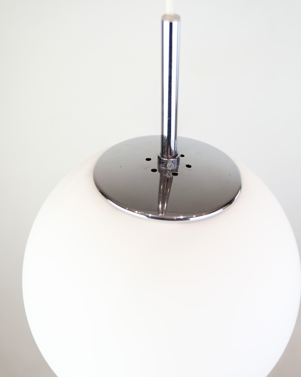 Pendel i kugleformet matteret glas med forkromet ophæng og hvid ledning. Lampen giver et blødt, diffust lys og passer perfekt over spisebord eller til entré. Et minimalistisk stykke skandinavisk design, hvor funktion og form mødes i en rolig helhed.