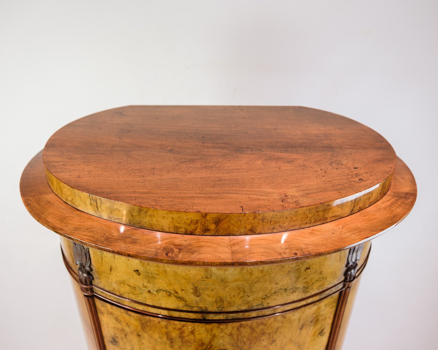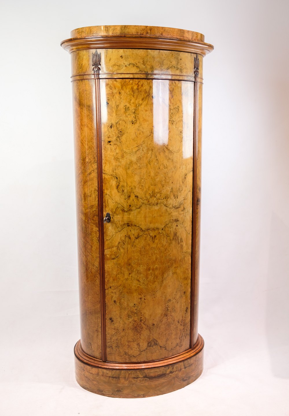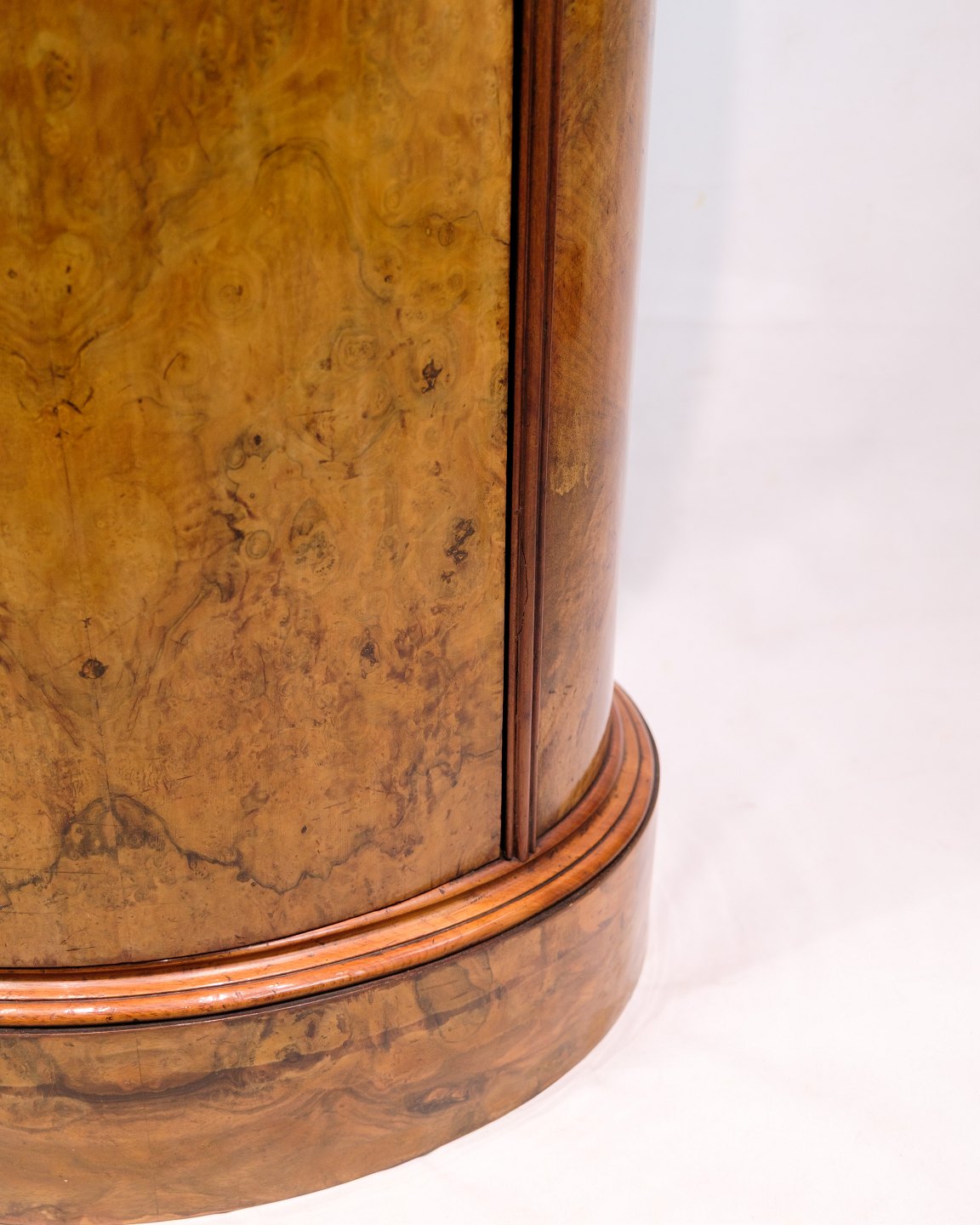 Ovalt piedestalskab fra omkring 1840’erne, udført i valnød og med håndpoleret overflade.