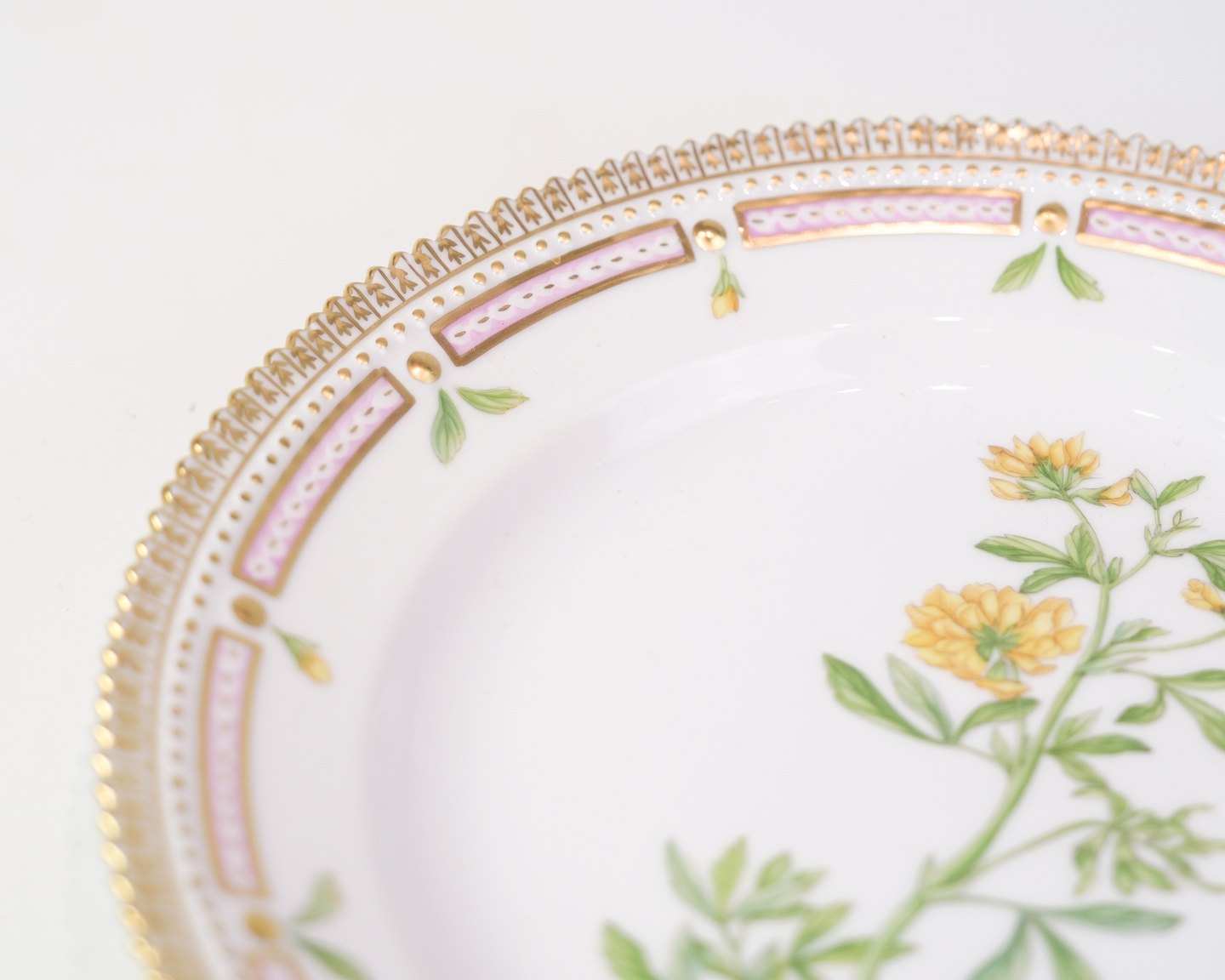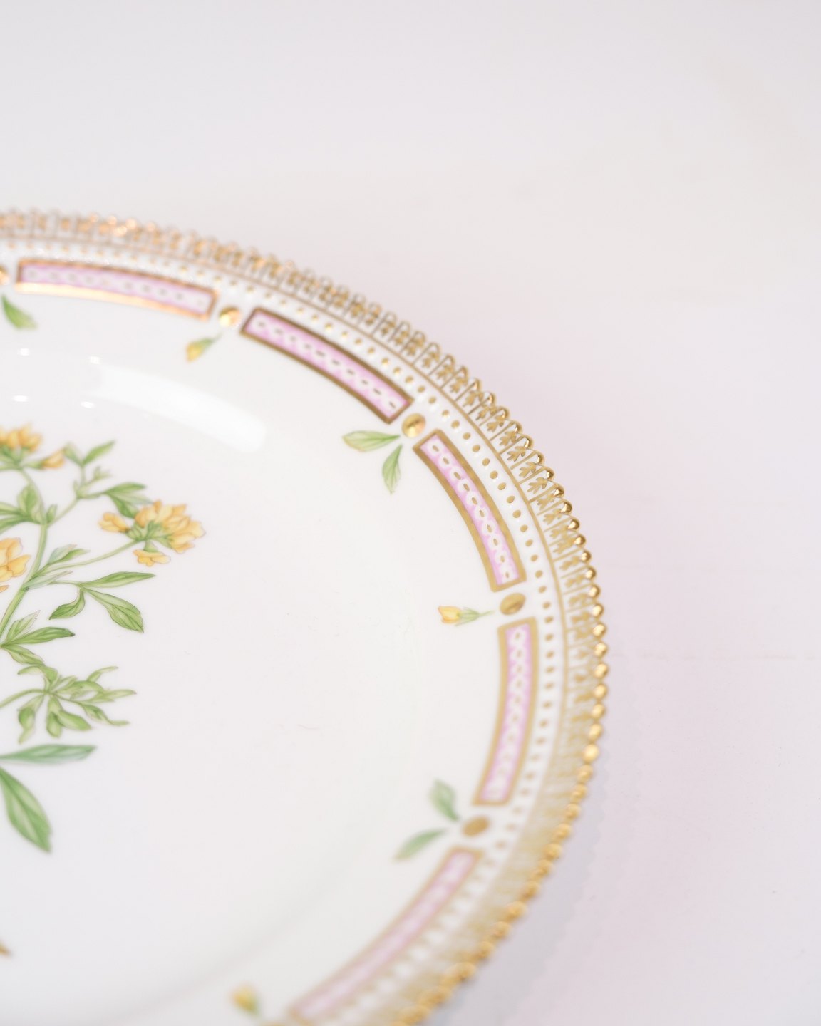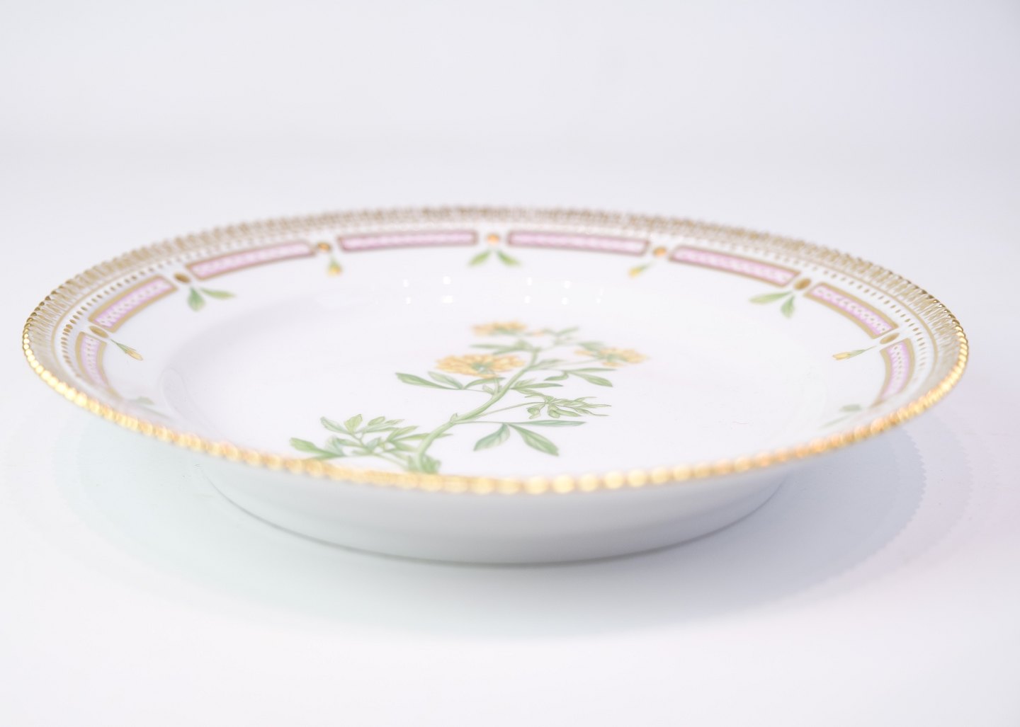 En frokosttallerken fra Royal Copenhagens serie "Flora Danica", dekoreret med håndmalet blomst og guldkant. Denne tallerken bærer dek. nr. 20/3550 og er fremstillet i 1960’erne.