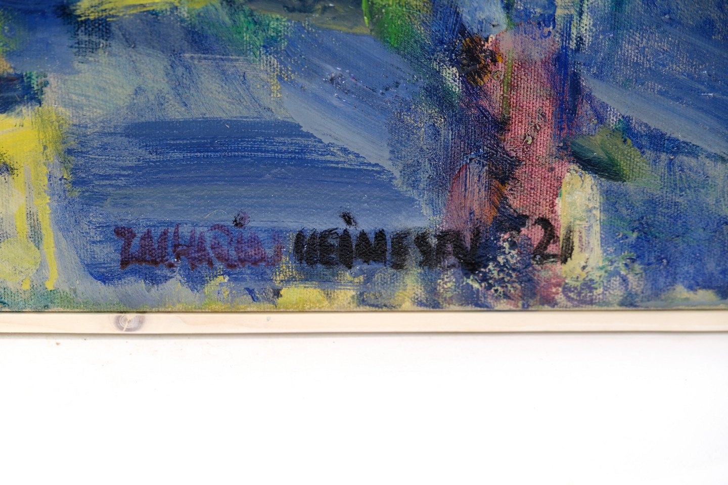 Kontakt os vedrørende prisFarverigt maleri udført af den færøske kunstner Zakarias Heinesen (f. 1936), malet med oliemaling på lærred. Motivet viser udsigt over Tórshavn i karakteristisk ekspressiv stil, hvor lys og farver smelter sammen i et atmosfærisk helhedsbillede. Signeret nederst til højre og dateret 2021.