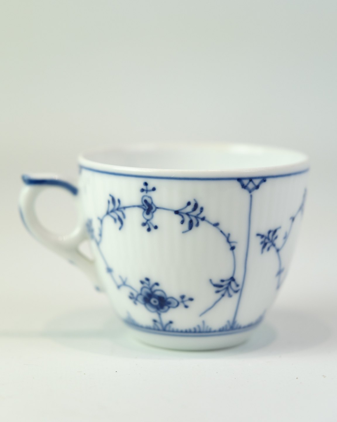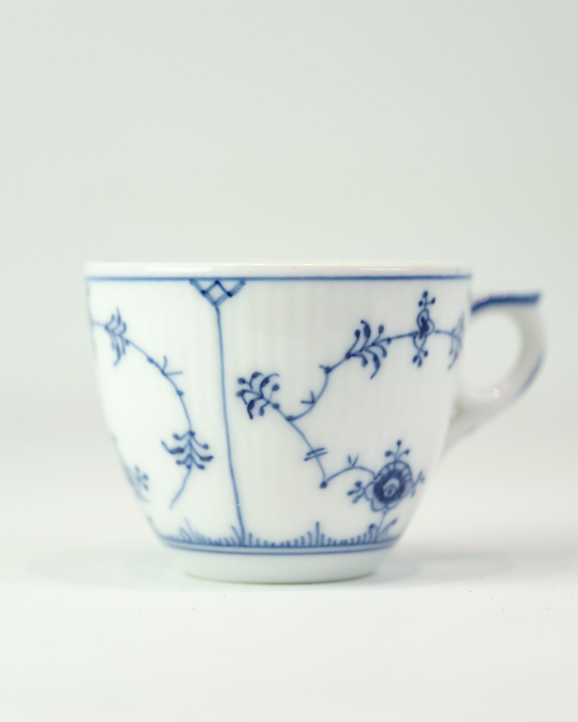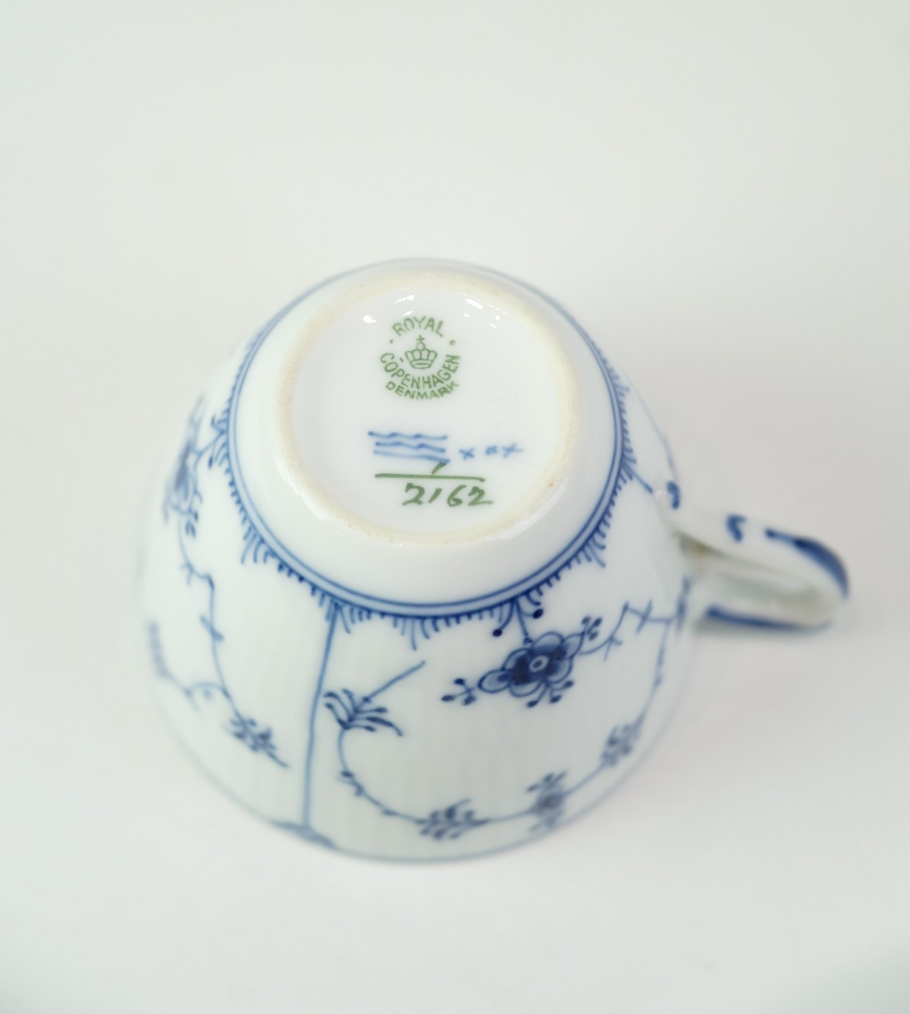 Håndmalet kaffekop fra Royal Copenhagens klassiske musselmalede riflet-serie. Modellen er No. 2162 og udført i porcelæn med den ikoniske koboltblå dekoration og den karakteristiske riflede overflade.