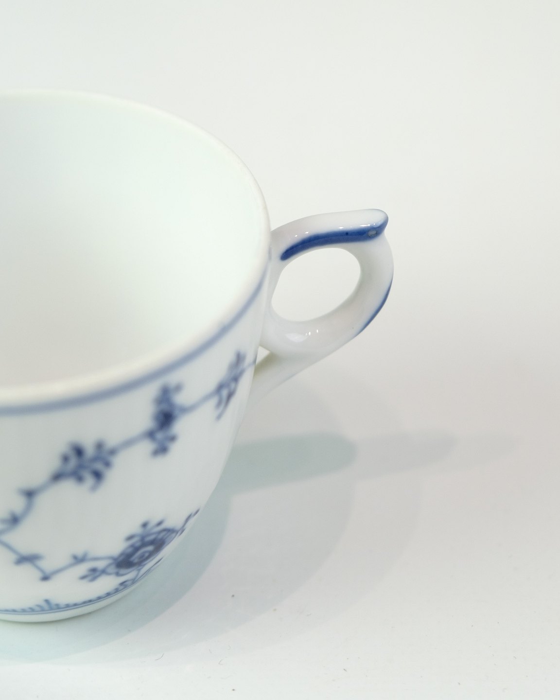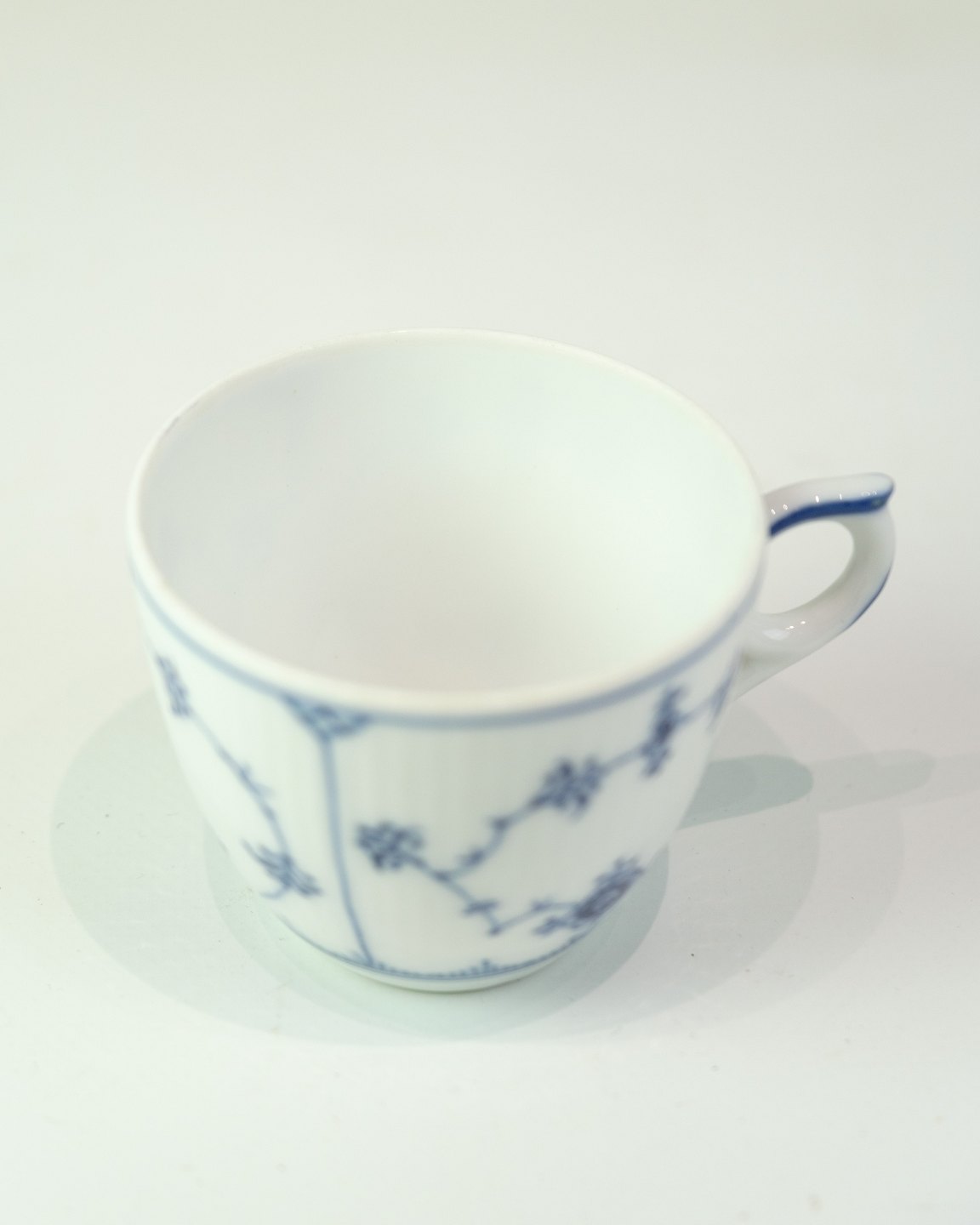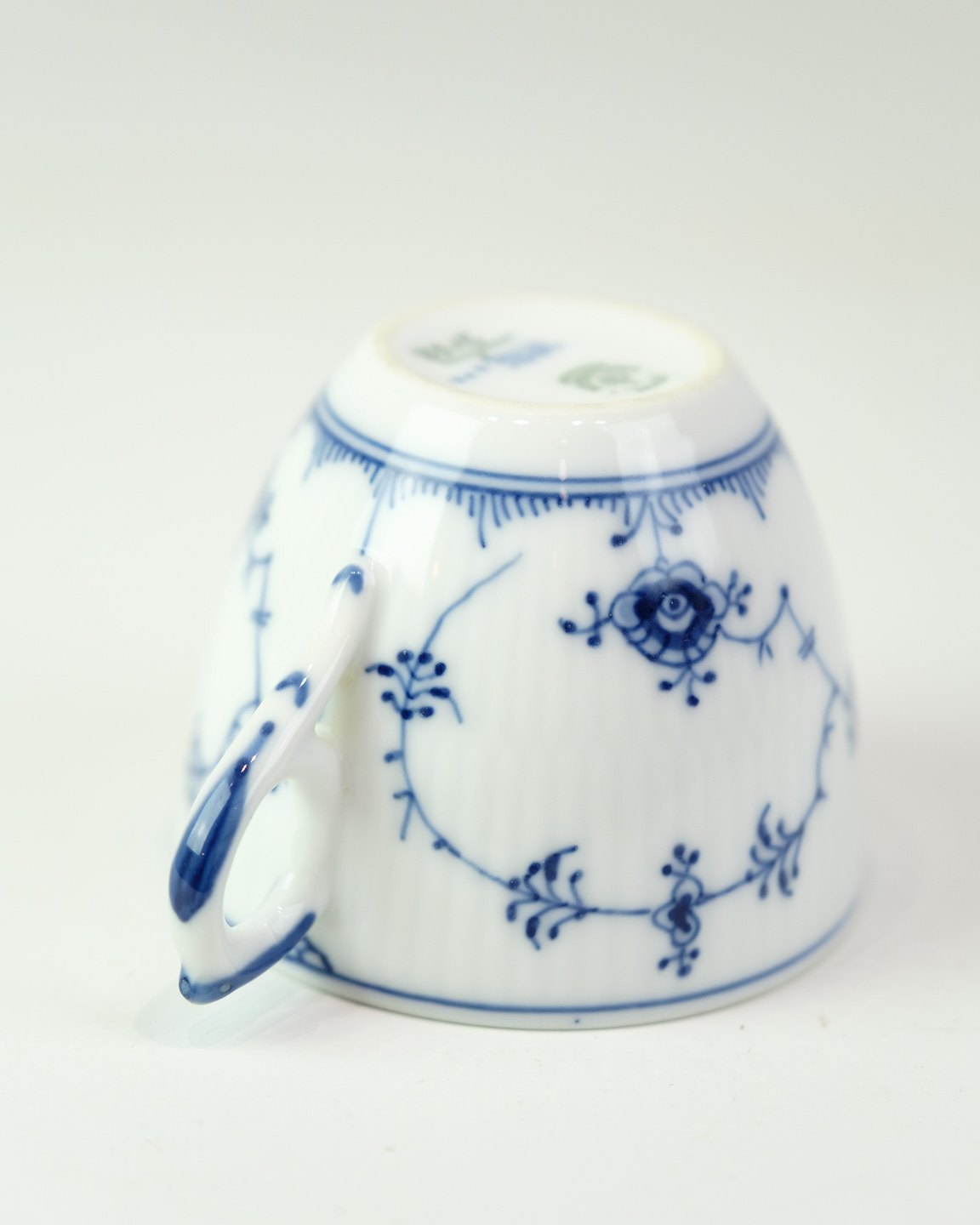 Håndmalet kaffekop fra Royal Copenhagens klassiske musselmalede riflet-serie. Modellen er No. 2162 og udført i porcelæn med den ikoniske koboltblå dekoration og den karakteristiske riflede overflade.