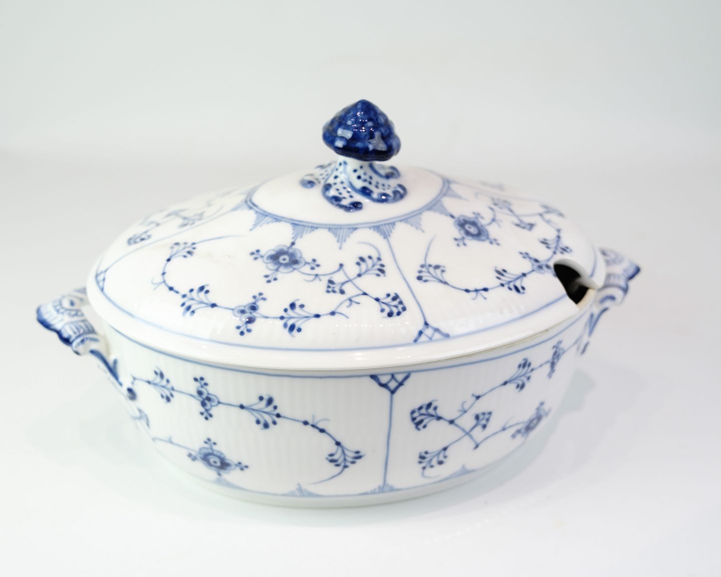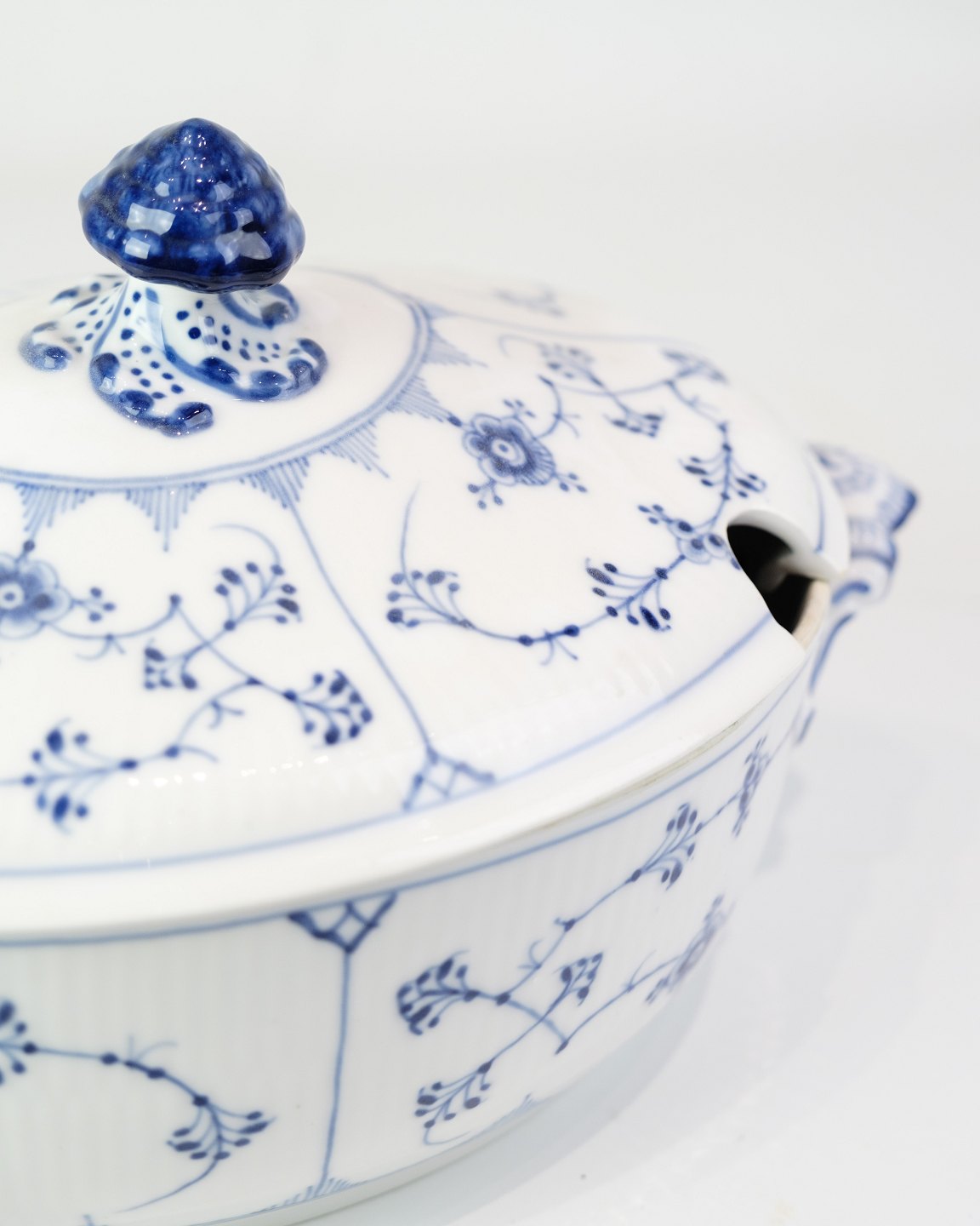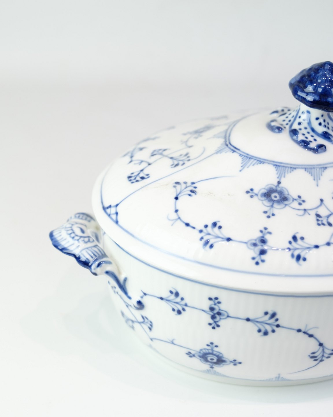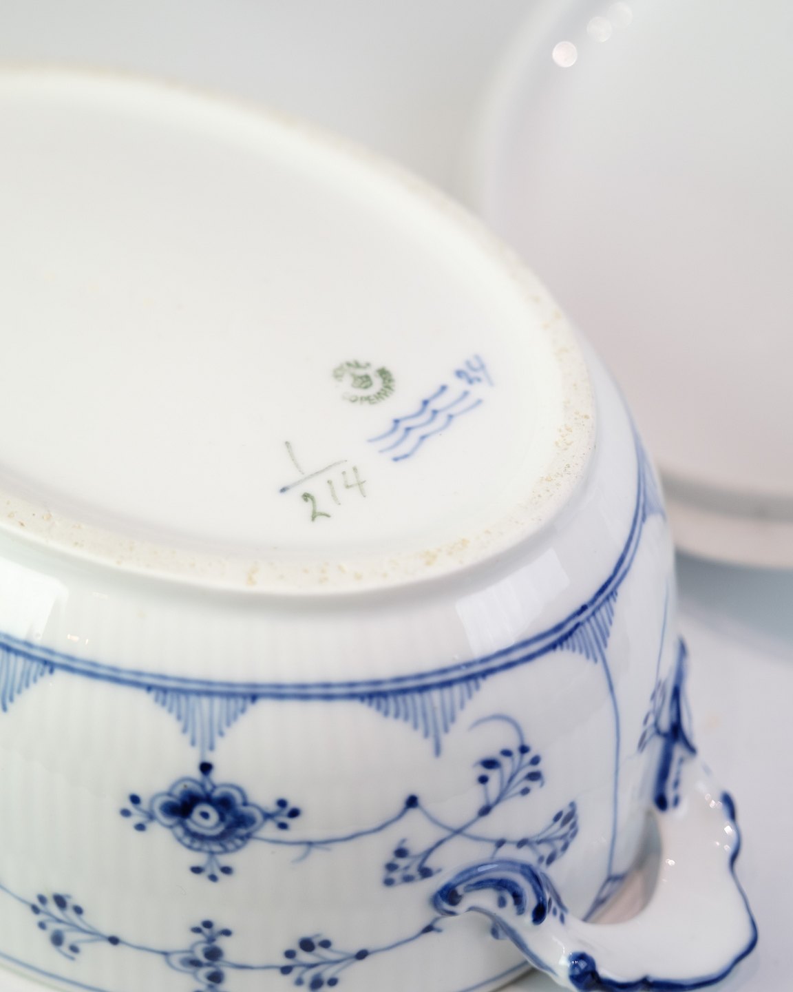 Klassisk terrin fra Royal Copenhagen i det tidløse musselmalede riflet mønster. Modellen er No. 214 og dateres til omkring 1950.