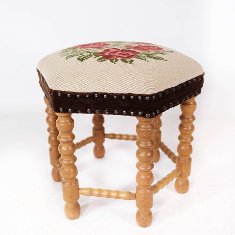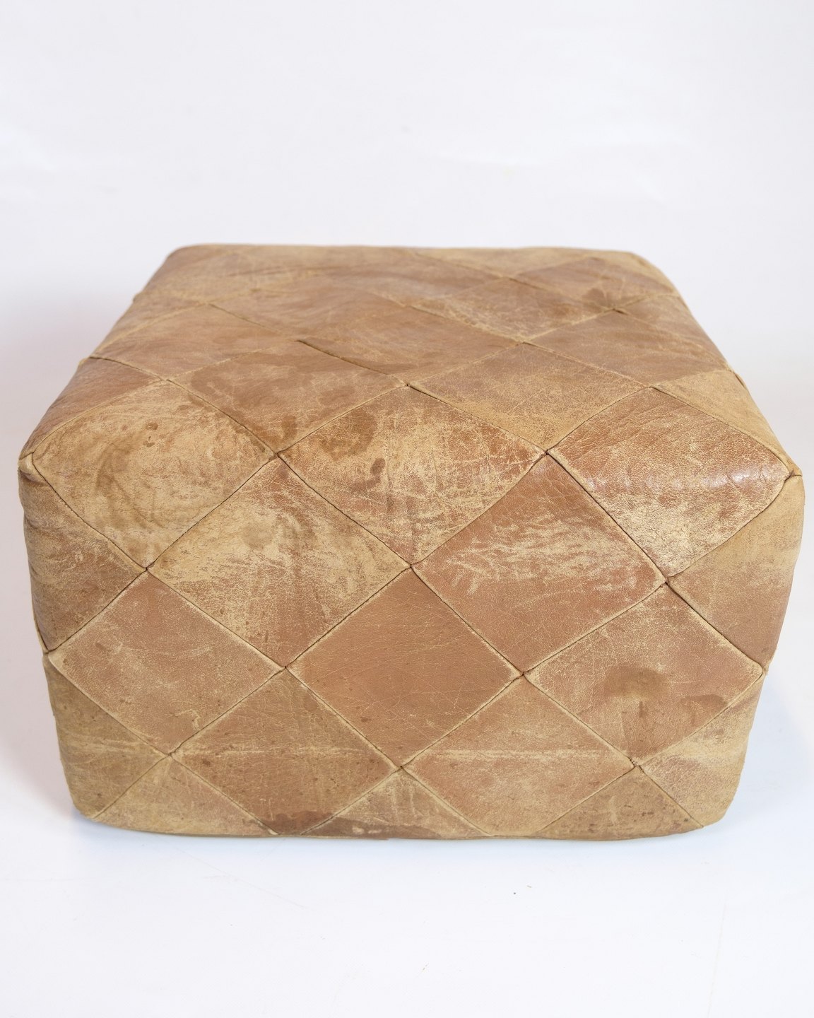 Vintage square leather pouf from the 1970s in natural leather with a beautiful patina. Hand-stitched surface in a geometric pattern.