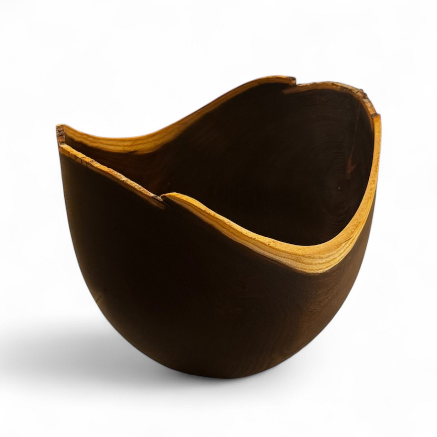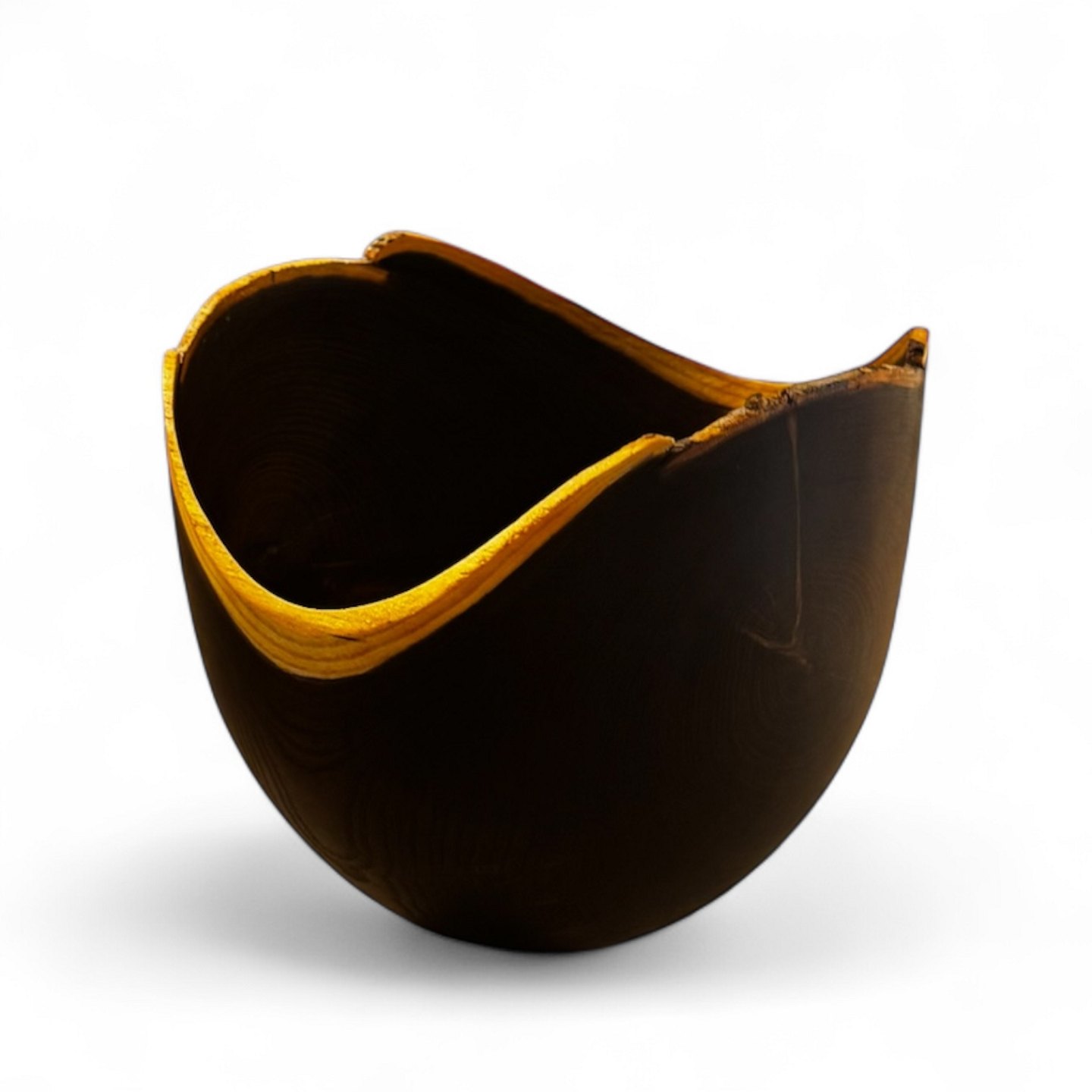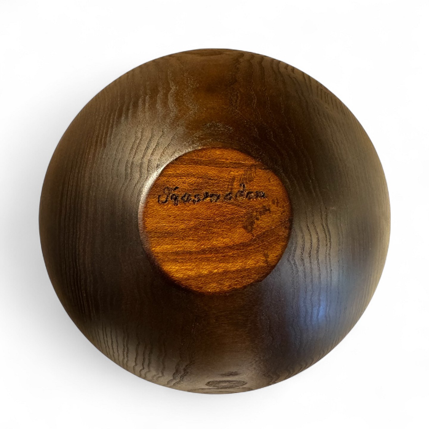 Hånddrejet skål i guldregn, udført af den bornholmske trædrejer Hans Henning Pedersen, signeret i bunden. Skålen har en organisk form med flot åretegning og naturligt afbarket kant.
