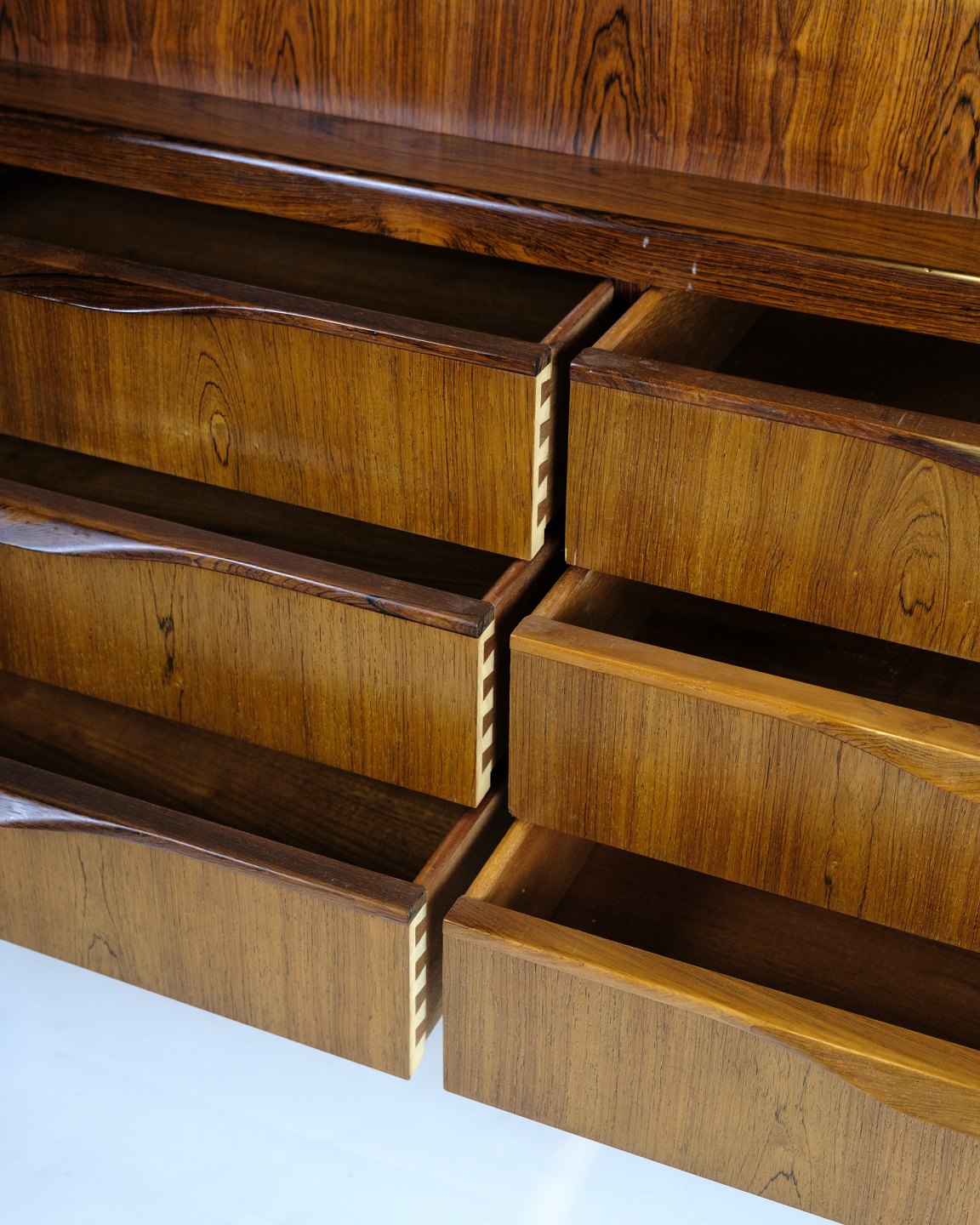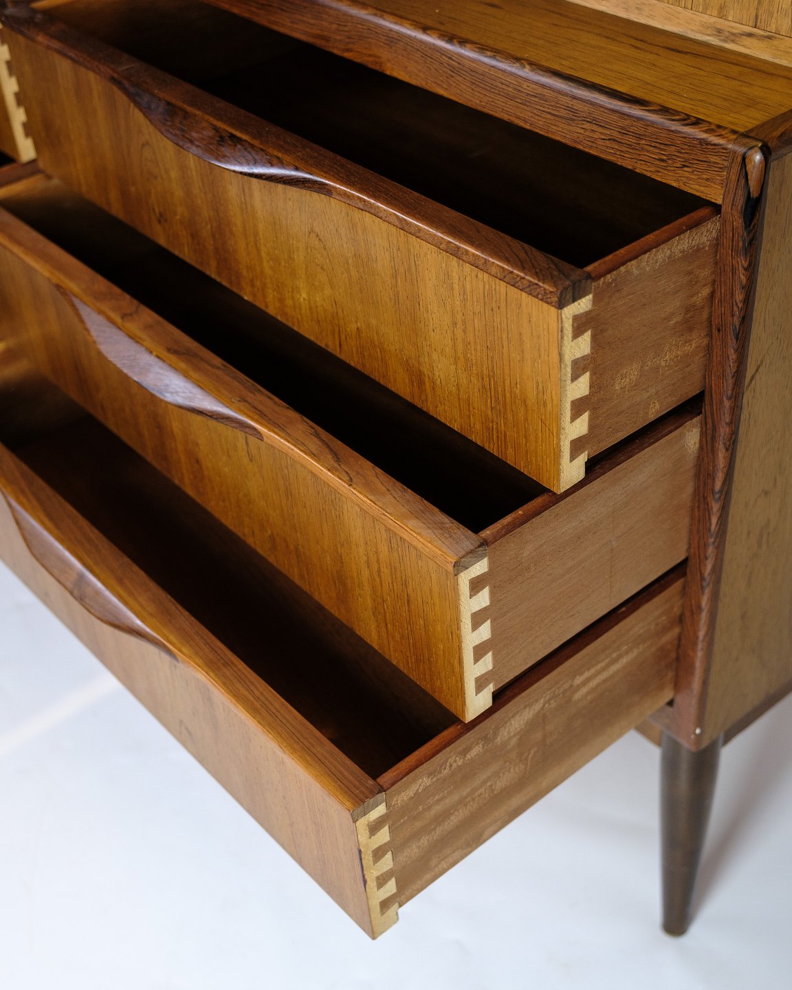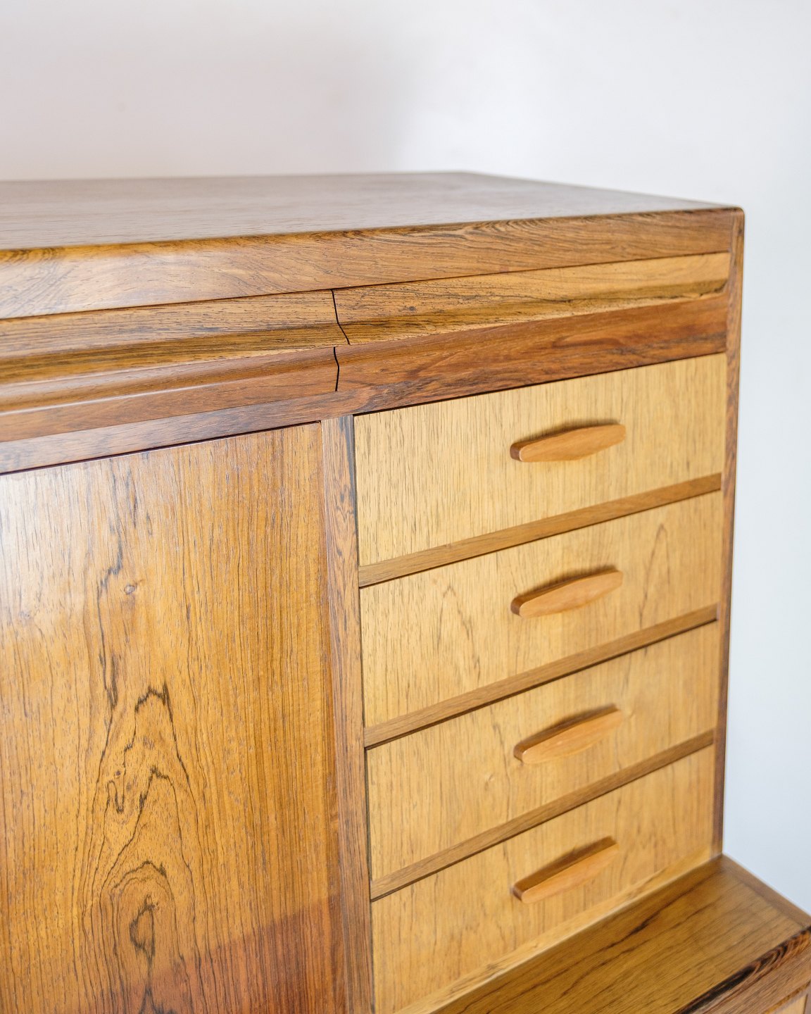Chatol designed by Erling Torvits and made of rosewood. The upper part opens with a hinged door and has built-in drawers, open compartments, letter shelves and three integrated “secret” drawers in the top section. At the bottom, six spacious drawers with molded handles.