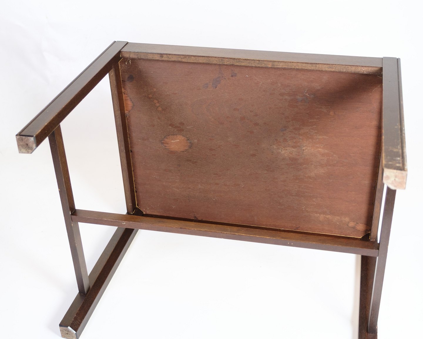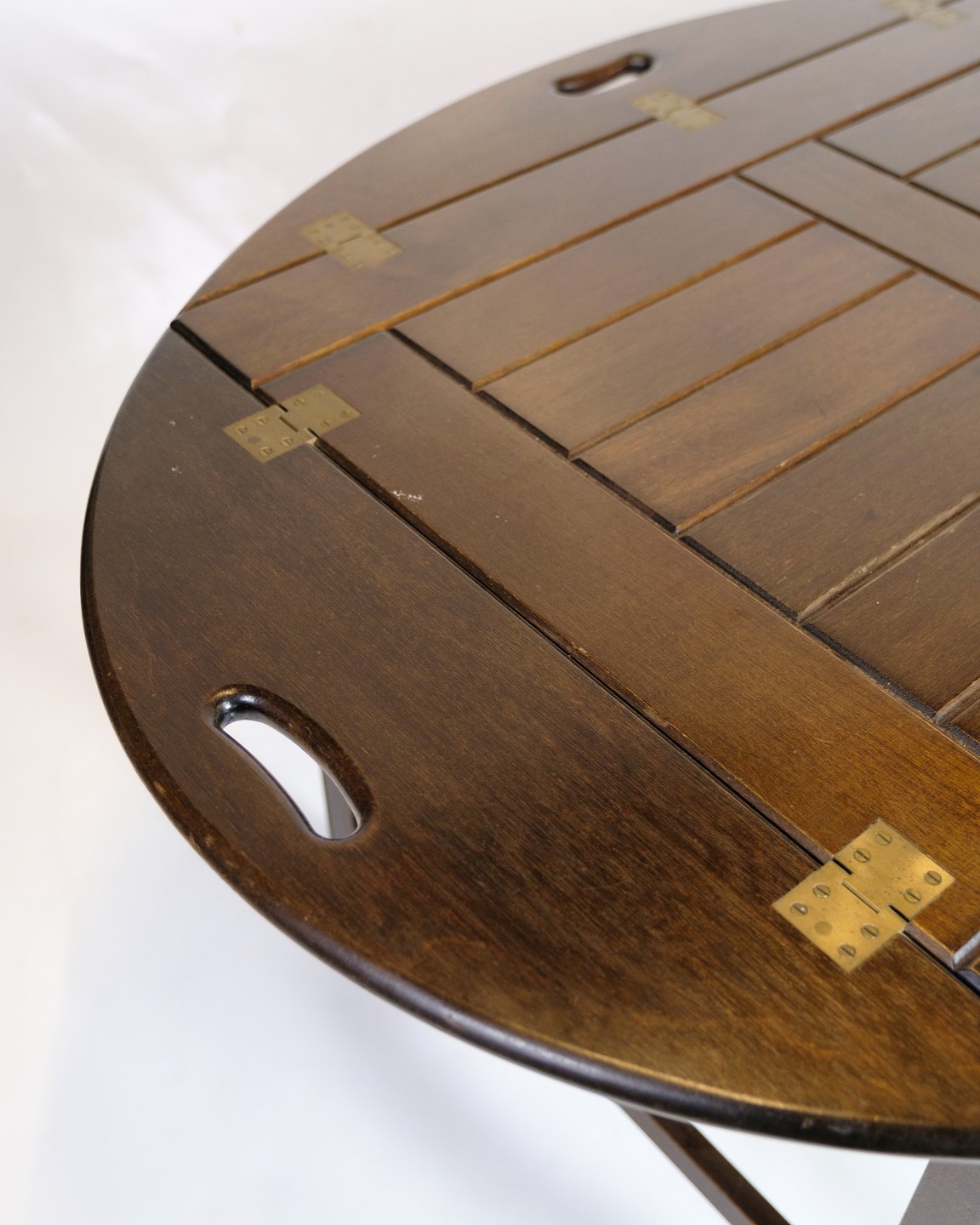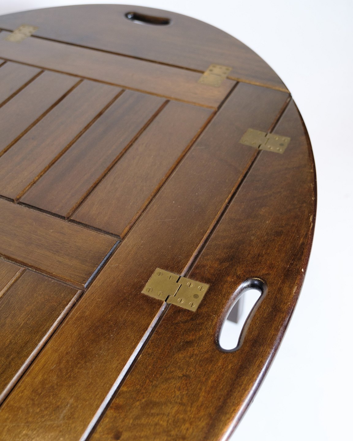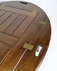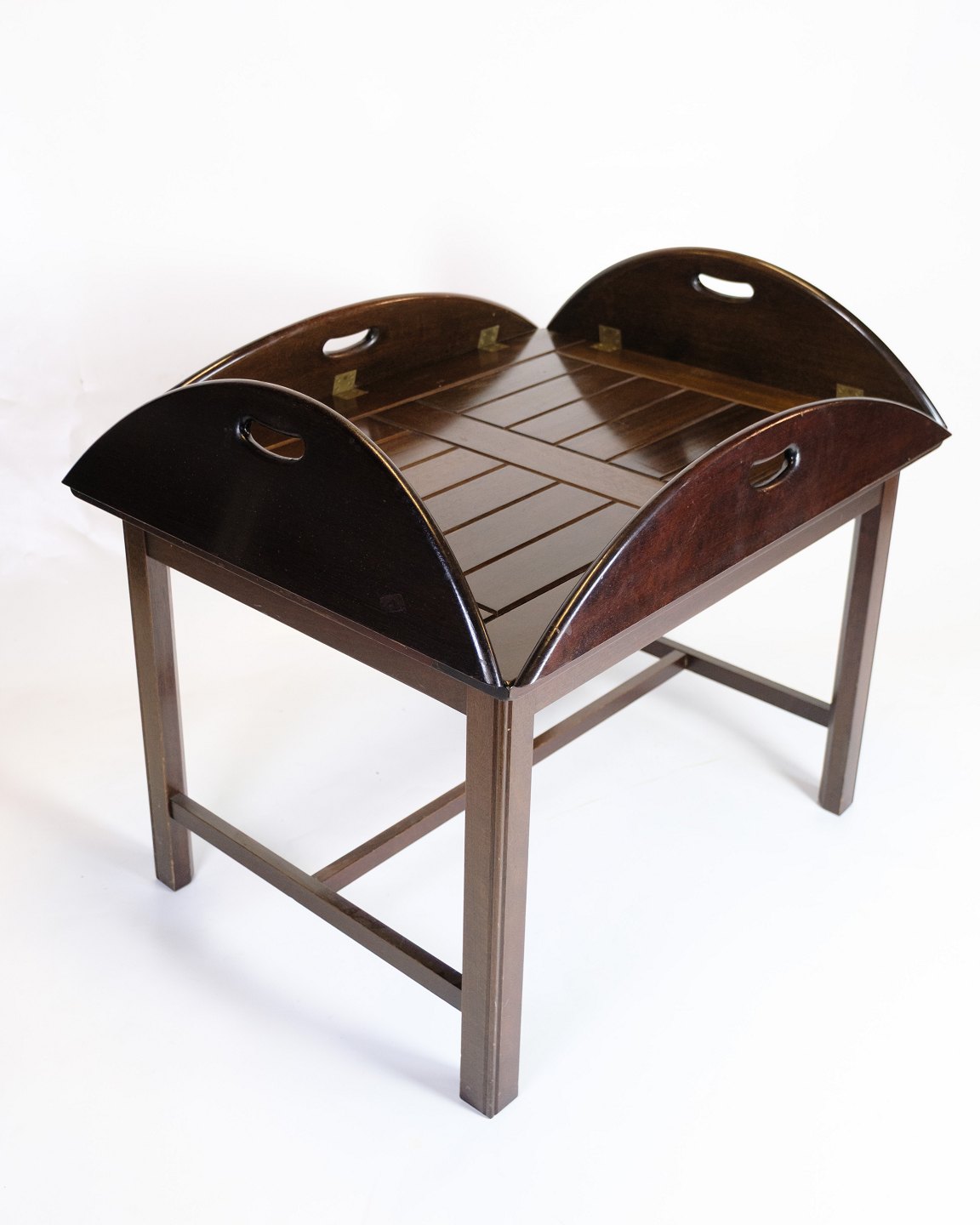 Klassisk butlerbord udført i mahogni med aftagelig bakke og foldbare ben, typisk for dansk design i 1960’erne. Bordet kombinerer funktionalitet med enkelt formsprog og passer perfekt som serveringsbord eller sidebord.