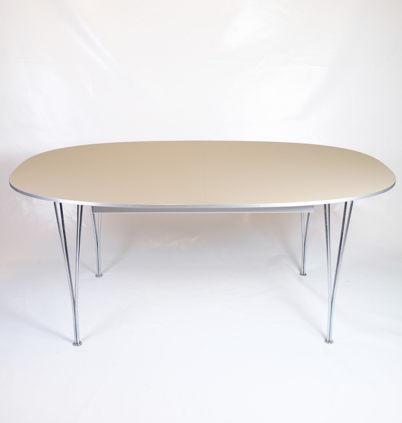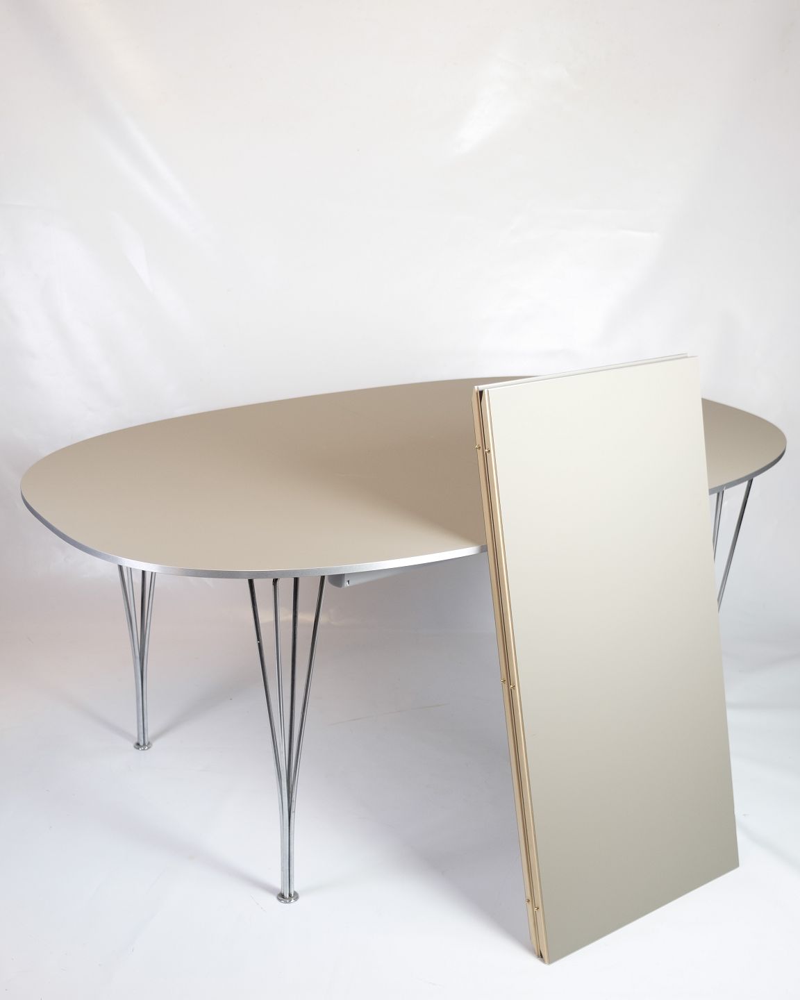 Superellipse spisebord, model B616, designet af Piet Hein i samarbejde med Bruno Mathsson og Arne Jacobsen for Fritz Hansen. Bordet har et minimalistisk udtryk med grå laminatplade og forkromede stålben i det ikoniske spændben-design. Den superelliptiske form gør bordet ideelt til både hverdag og gæstemiddage, og to medfølgende tillægsplader giver mulighed for fleksibel udvidelse.