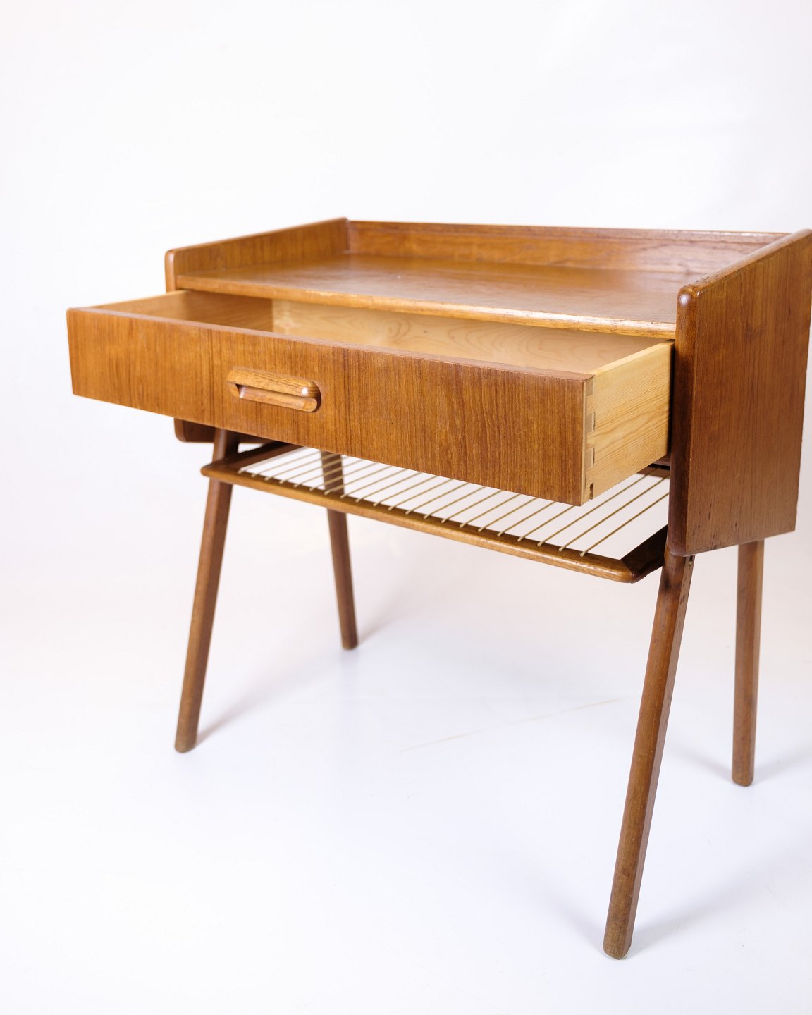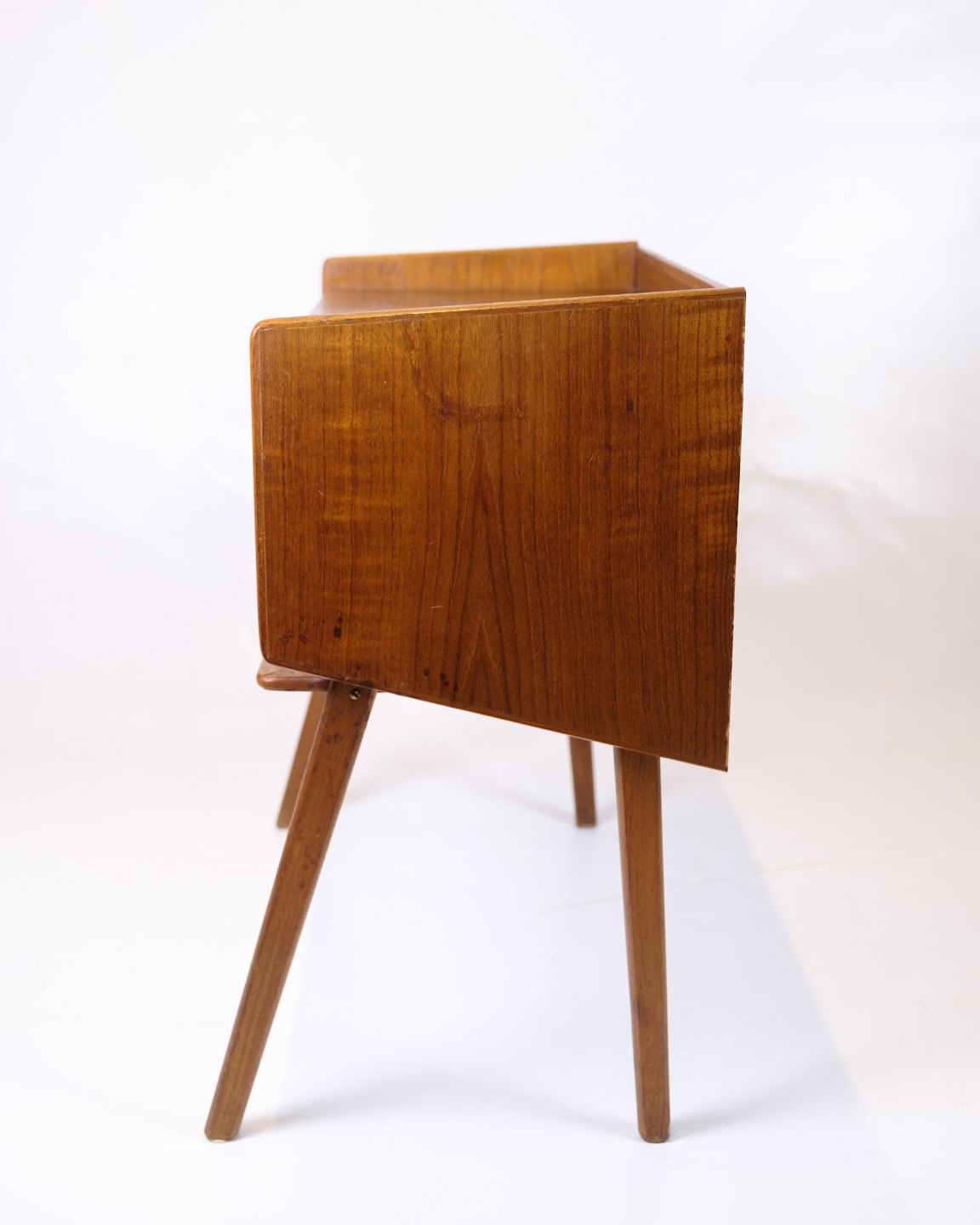 Side table/nightstand in teak with drawer and wicker shelf. Danish design from the 1960s. Elegant and functional furniture in great condition.