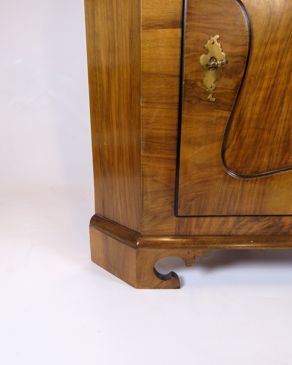Antikt vitrineskab i barokstil fra ca. 1900. Udført i nøddetræ med glaslåge og sprosser. Elegant hjørneskab med klassisk udtryk.