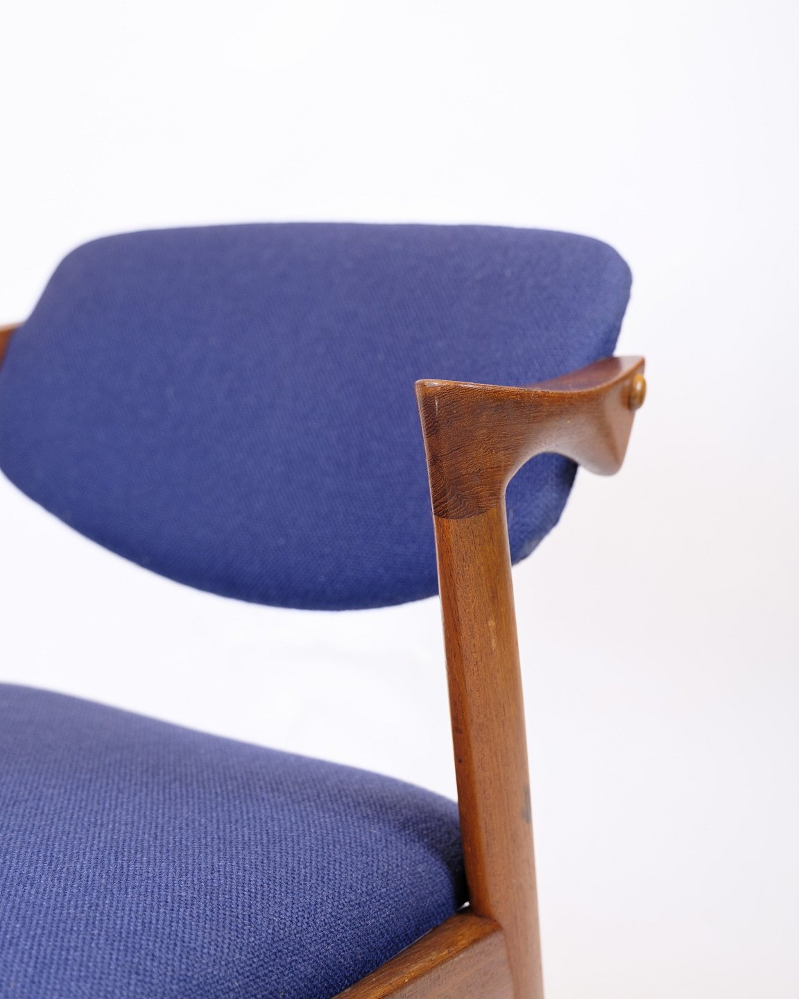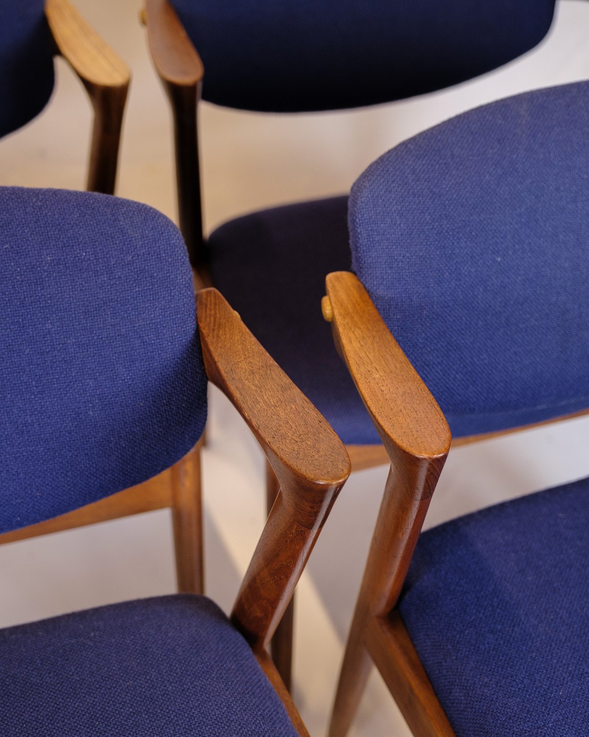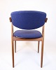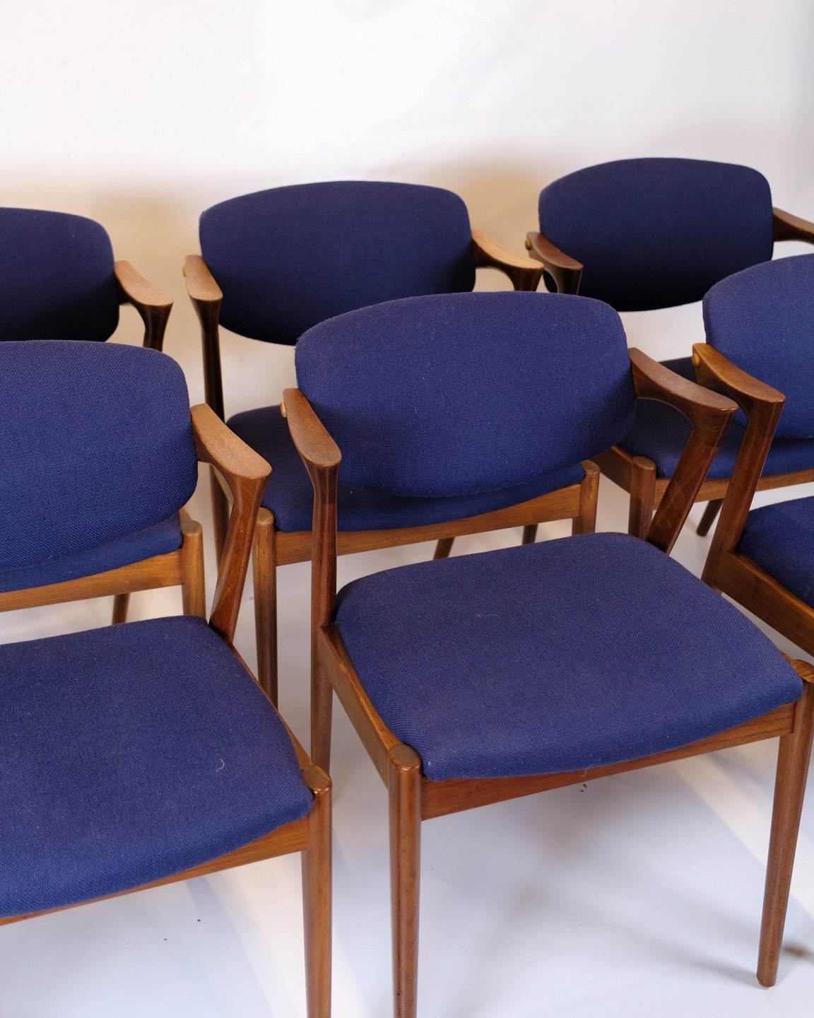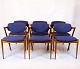 Sæt af seks spisebordsstole, model 42, designet af Kai Kristiansen og produceret af Schou Andersen i 1960’erne. Stolene er udført i teak med det karakteristiske elegante og organiske formsprog, som kendetegner Kristiansens design. Sæderne er polstret med blåt stof.