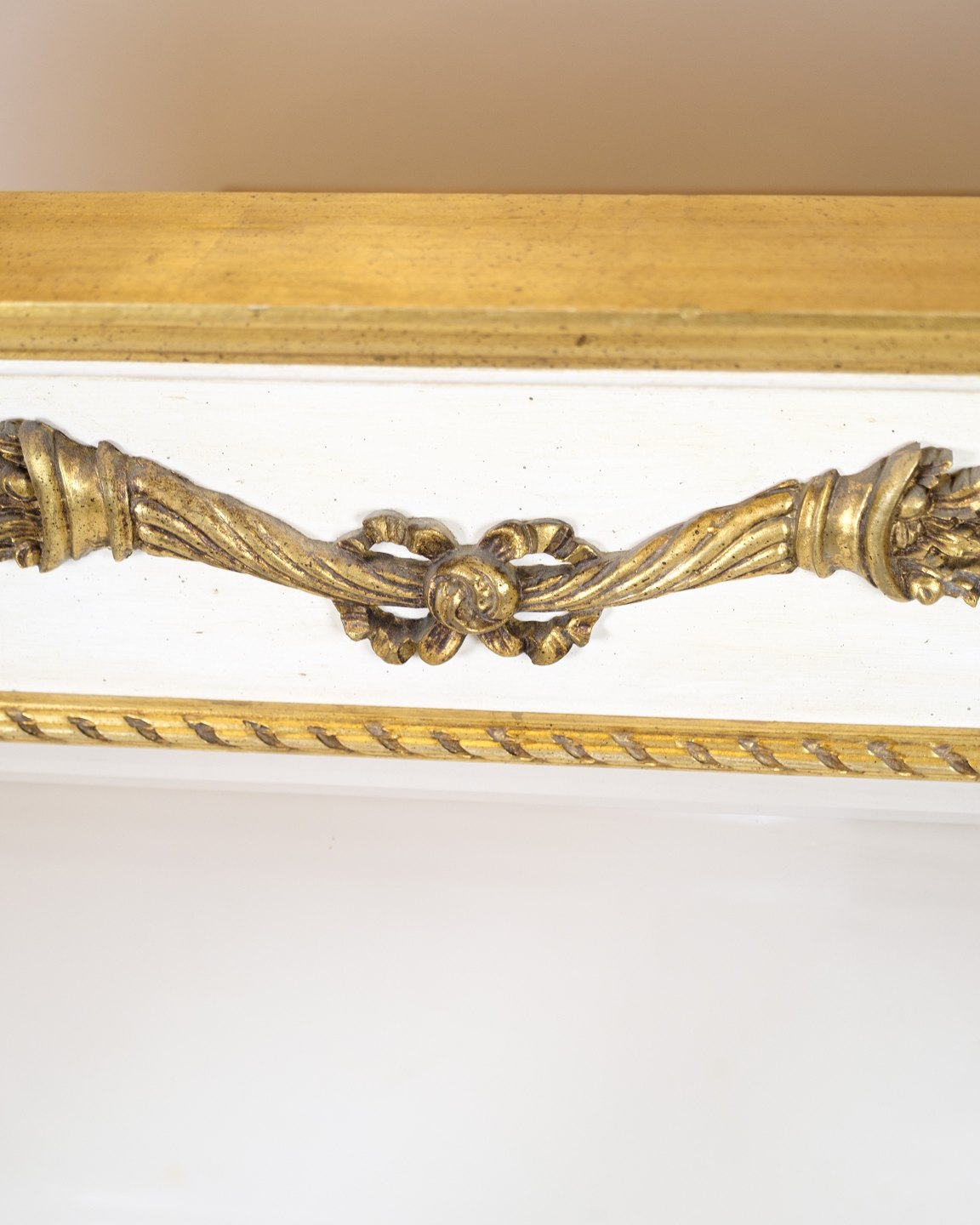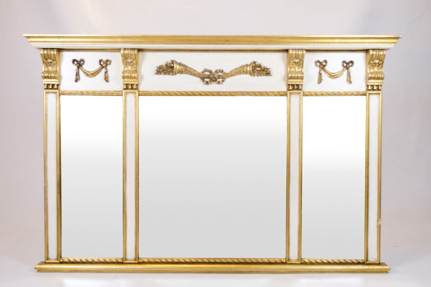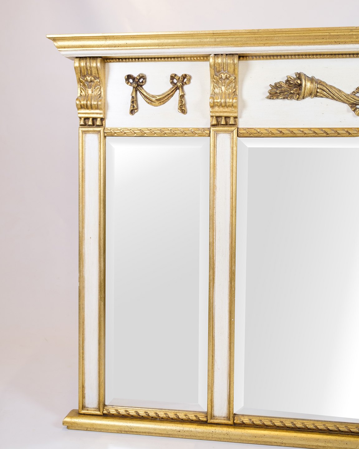 Large wall mirror in empire style with gilded frame in white and gold. The mirror is decorated with decorative ornaments that give a classic and elegant expression.