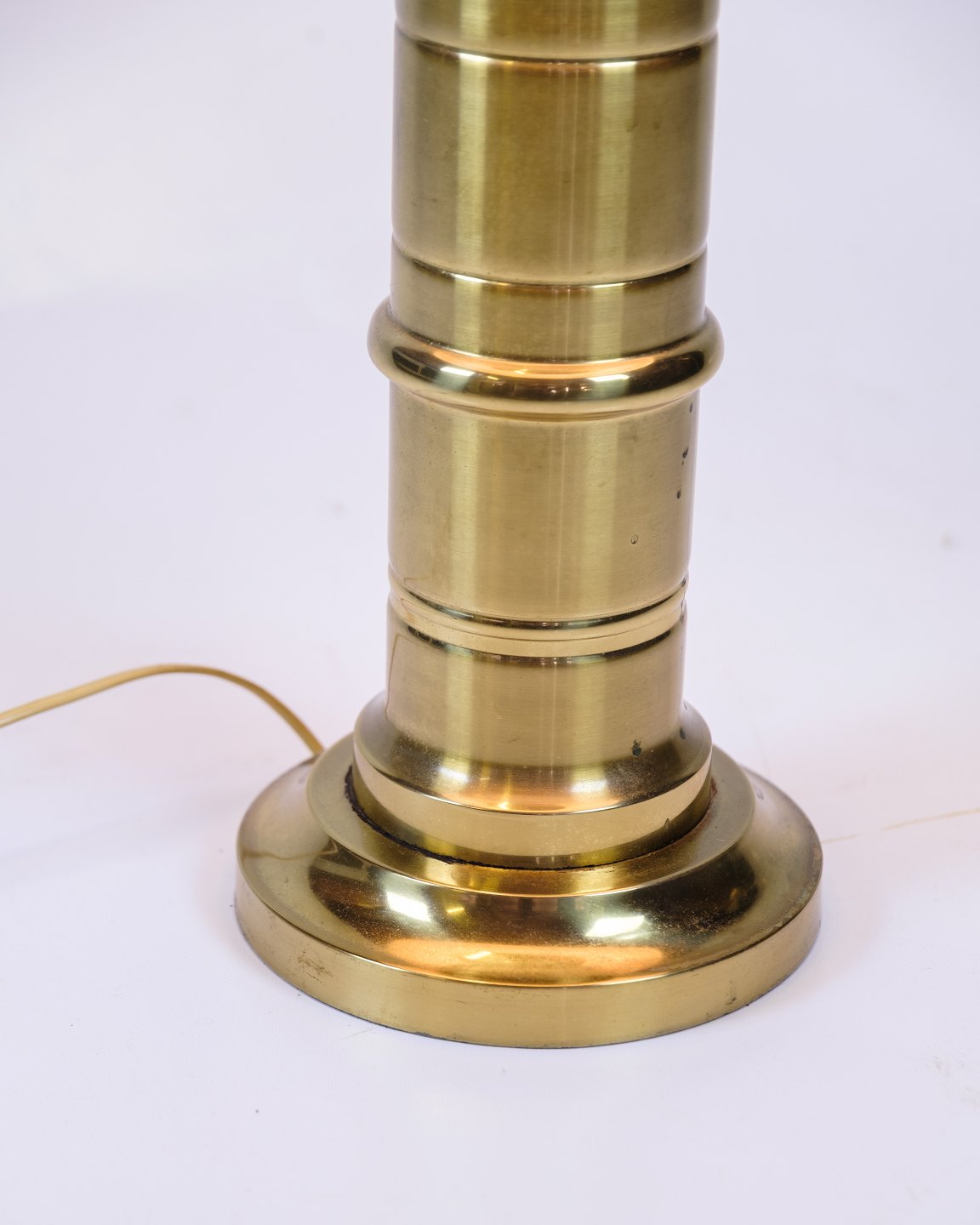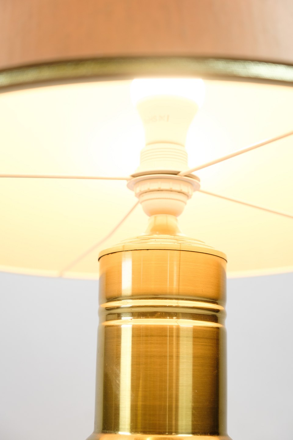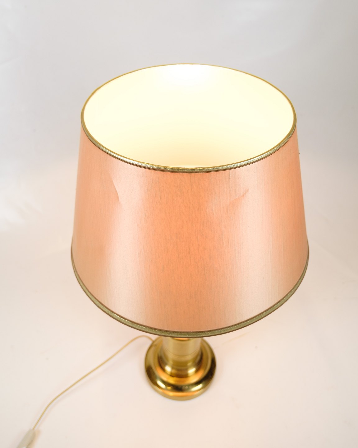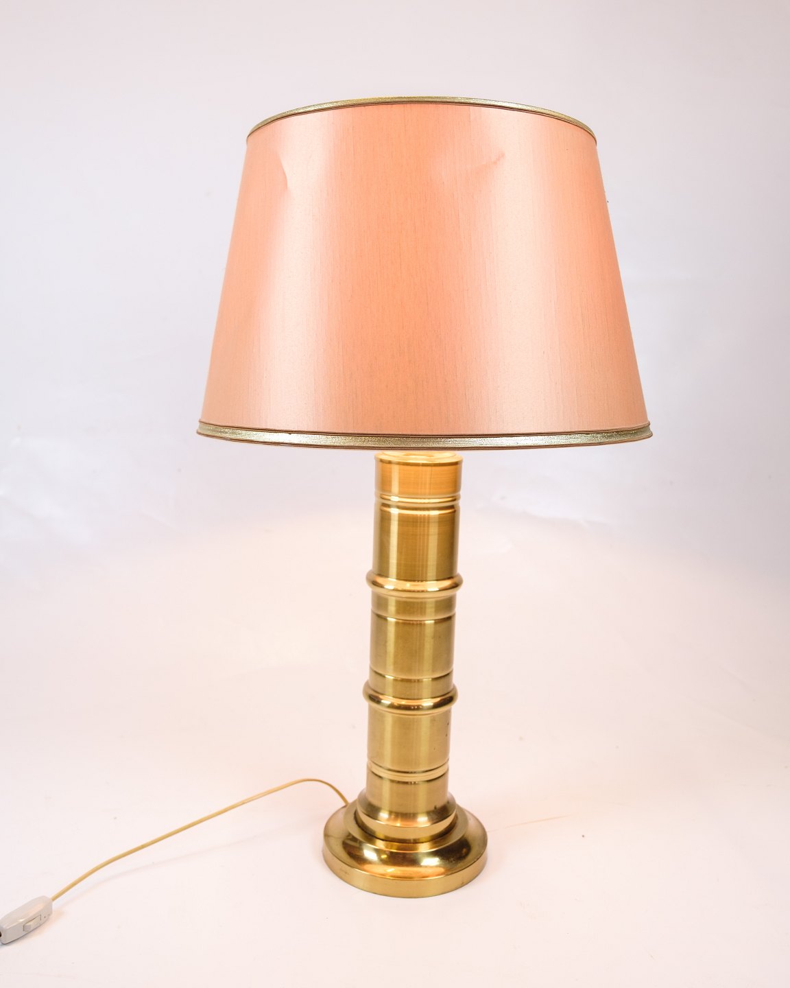 SoldSet of 2 vintage table lamps from the 1970s with brass feet and pink lampshades. Classic retro design.