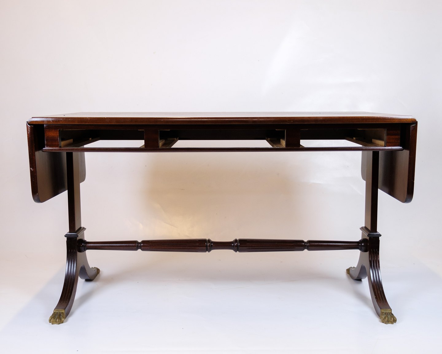 Mahogany coffee table from the 1960s, made in the style of Hepplewhite. The table has flaps on both sides, which can be folded up to expand the tabletop, providing both flexibility and functionality.