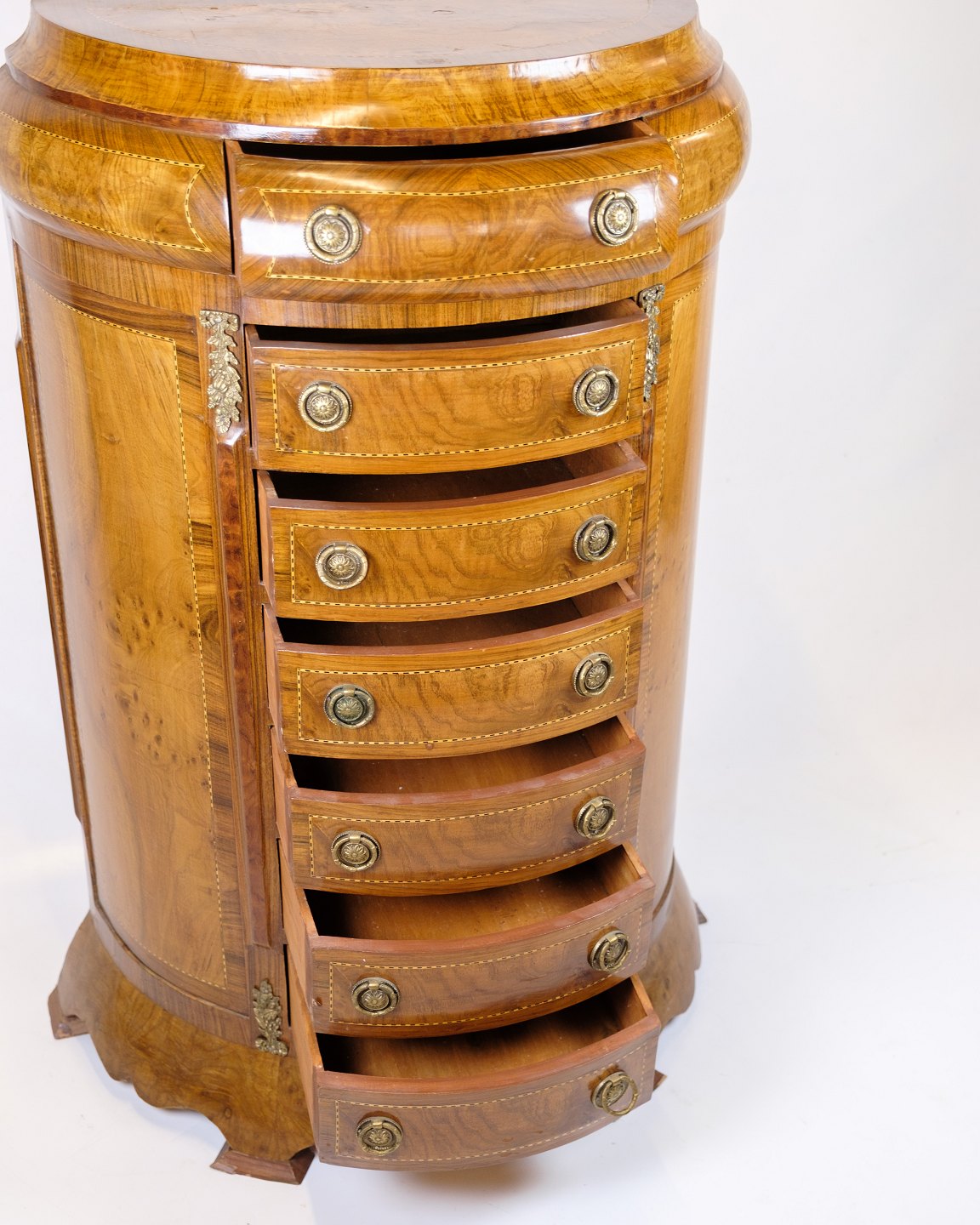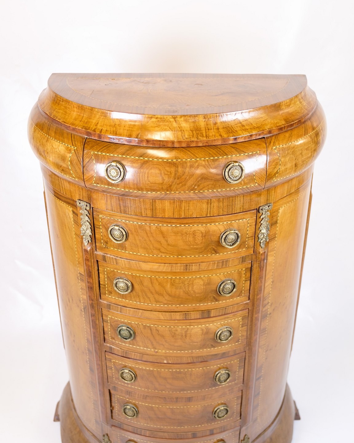 Antik høj kommode fra 1890’erne udført i klunkestil. Kommoden er fremstillet i rosentræ med smuk buet front og originale messinggreb.