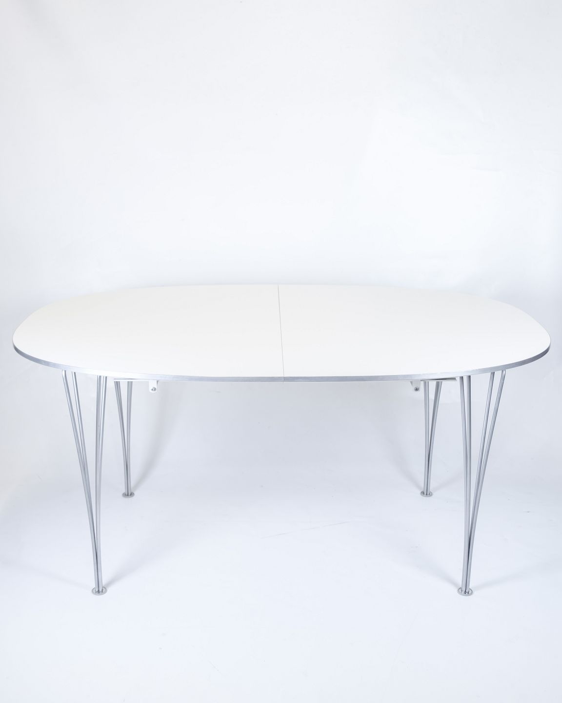 Superellipse dining table by Piet Hein & Arne Jacobsen for Fritz Hansen. White laminate with 2 extension leaves. Produced in 2005