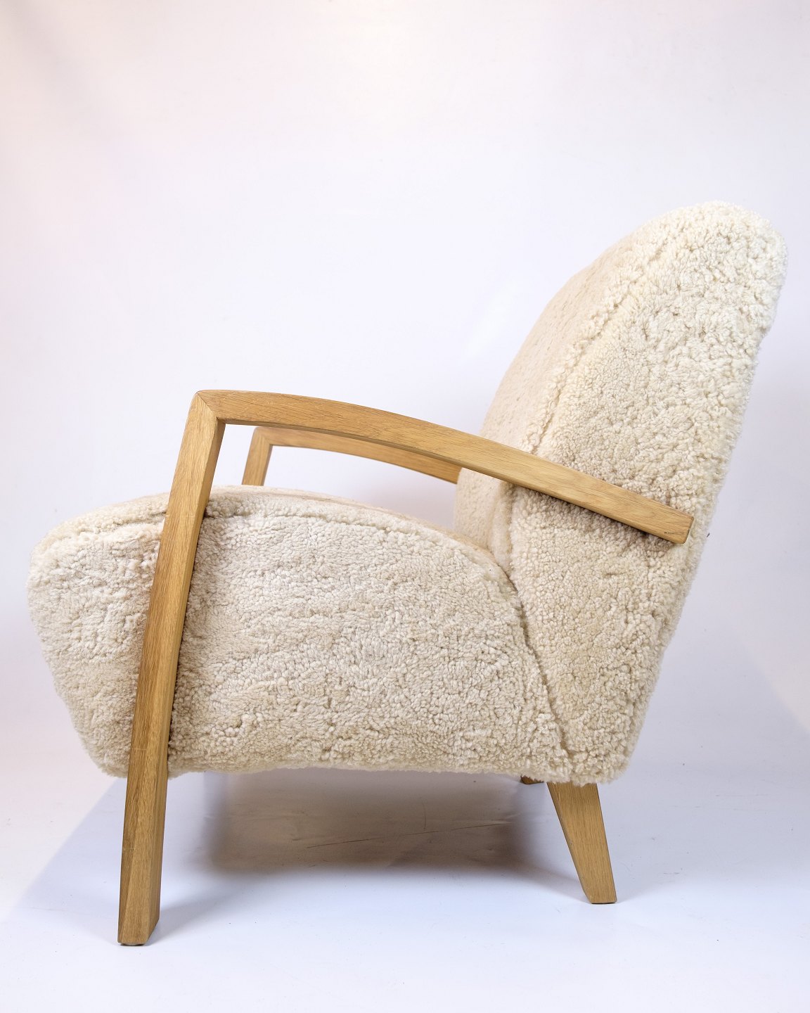 Lænestol i fåruld og egetræ. Komfortabel og dekorativ stol med tidløst design og varme materialer.