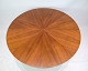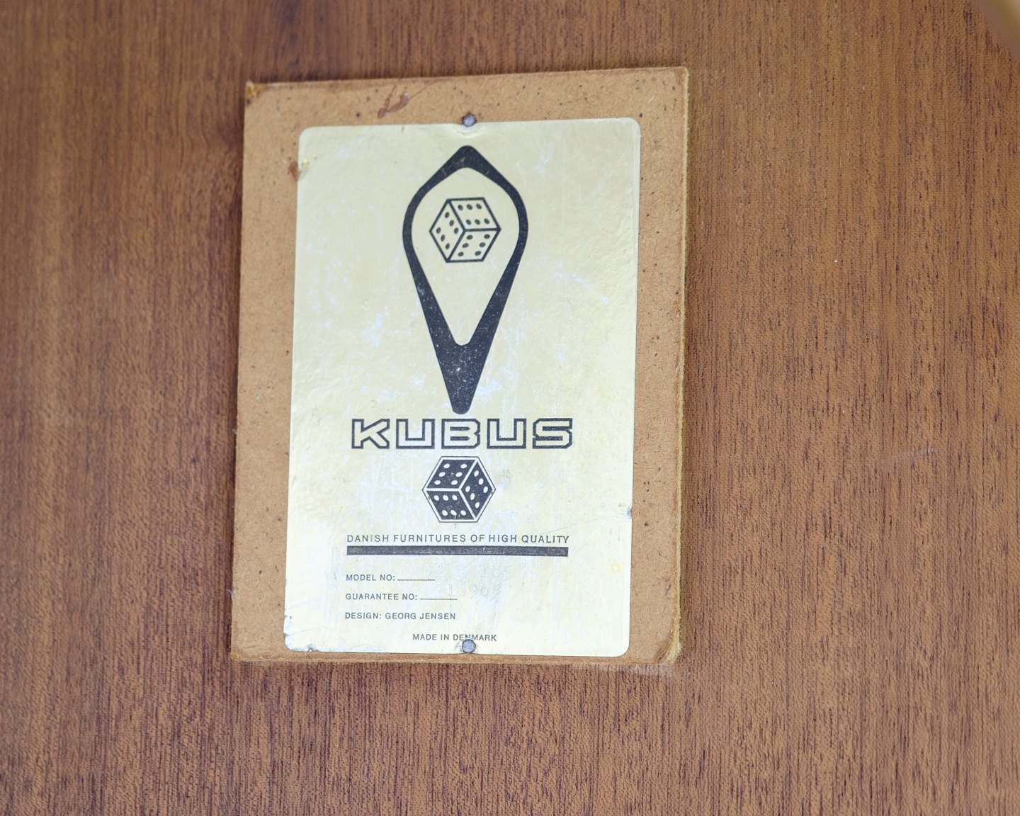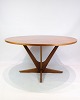 Round teak coffee table, designed by Holger Georg Jensen and produced by Kubus in the 1960s. The tabletop is made of teak veneer with a beautiful star-patterned grain, which gives the table an exclusive and vibrant expression. The base has a distinctive design that both emphasizes the sculptural character of the table and provides a solid construction.