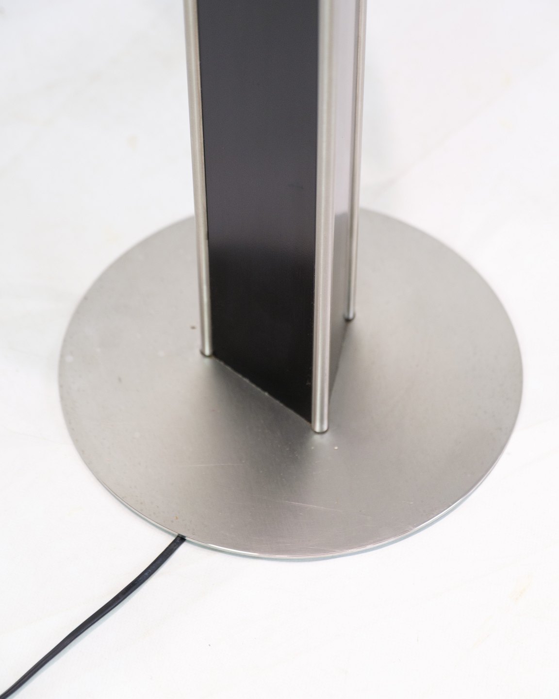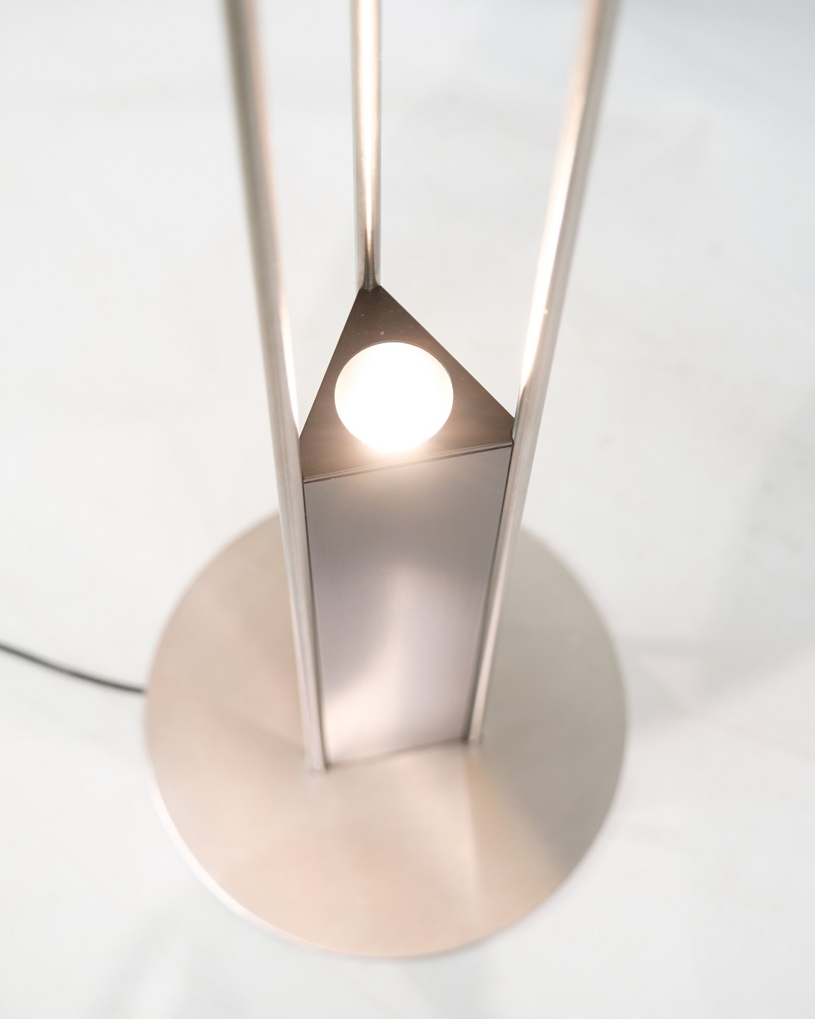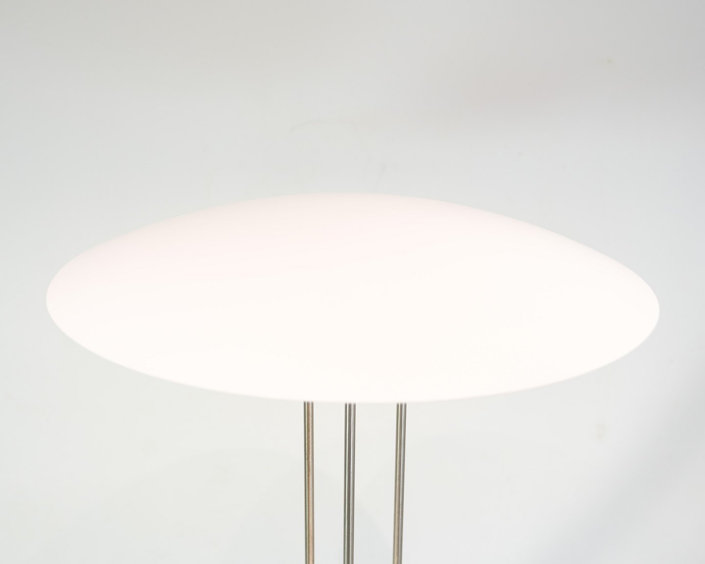 Gino gulvlampe, model Gino, designet af Bjarne Frost og Ole Jespersen i 1980’erne og produceret af Nordisk Solar Compagni. Stellet er forkromet metal og top skærmen er lavet af hvidlakeret metal.