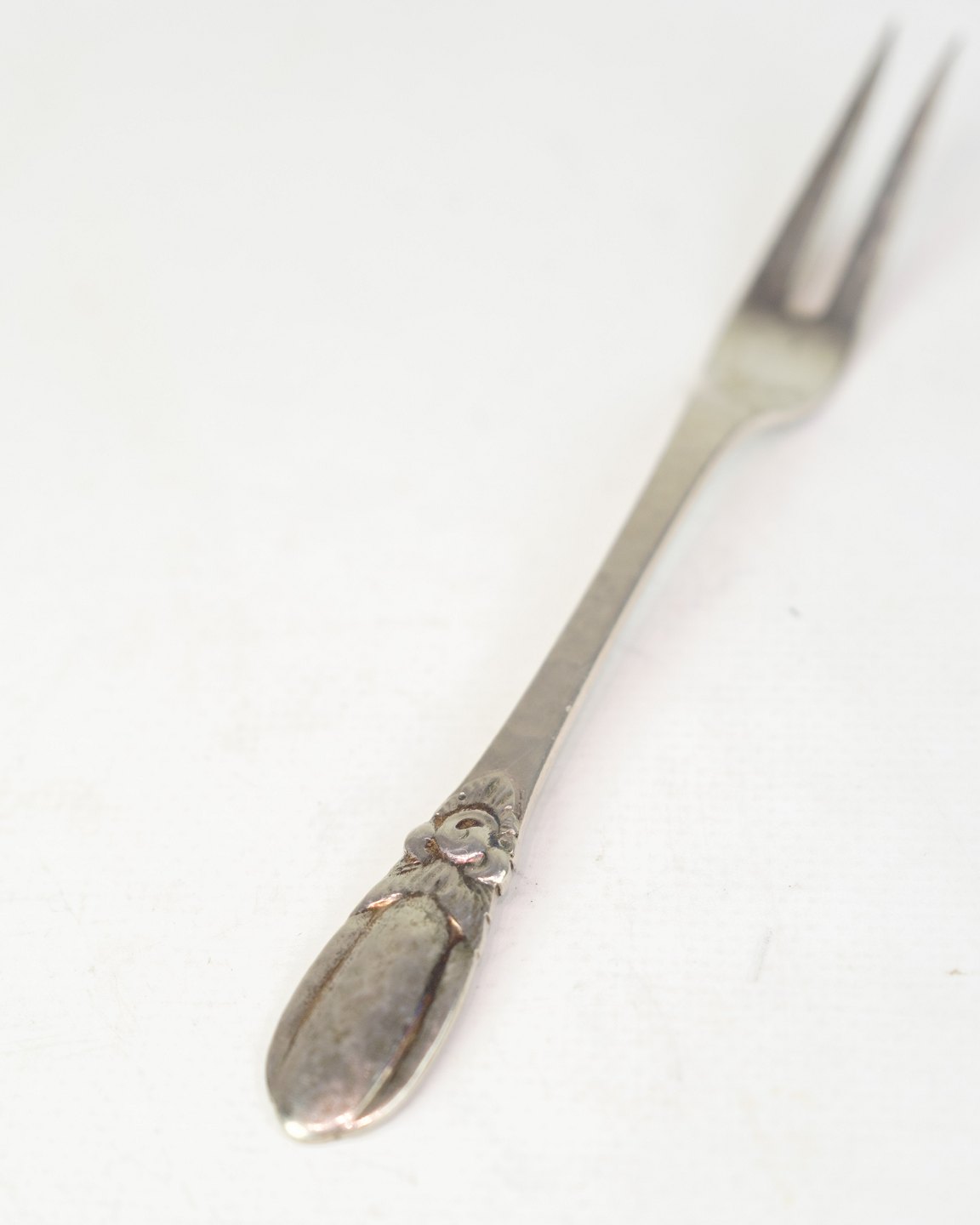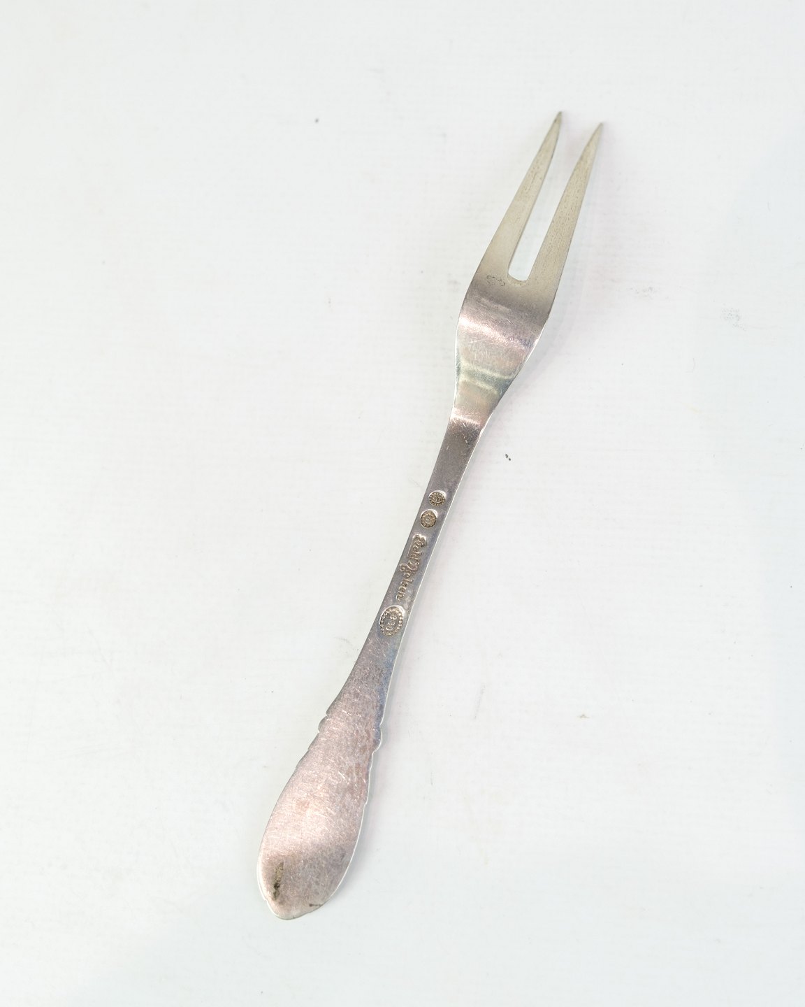 Evald Nielsen cold cuts fork in genuine silver. Hammered pattern, Model No. 16. Length 15 cm. Classic Danish silverwork.