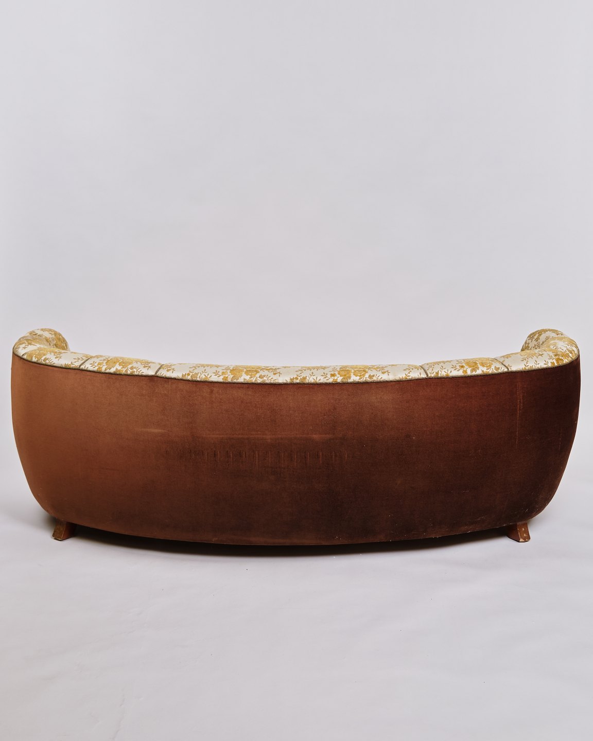 Danish banana sofa from the 1930s-40s. Floral upholstery and oak legs. H: 67 cm, W: 200 cm, D: 69 cm, SH: 36 cm. Classic Danish furniture craftsmanship