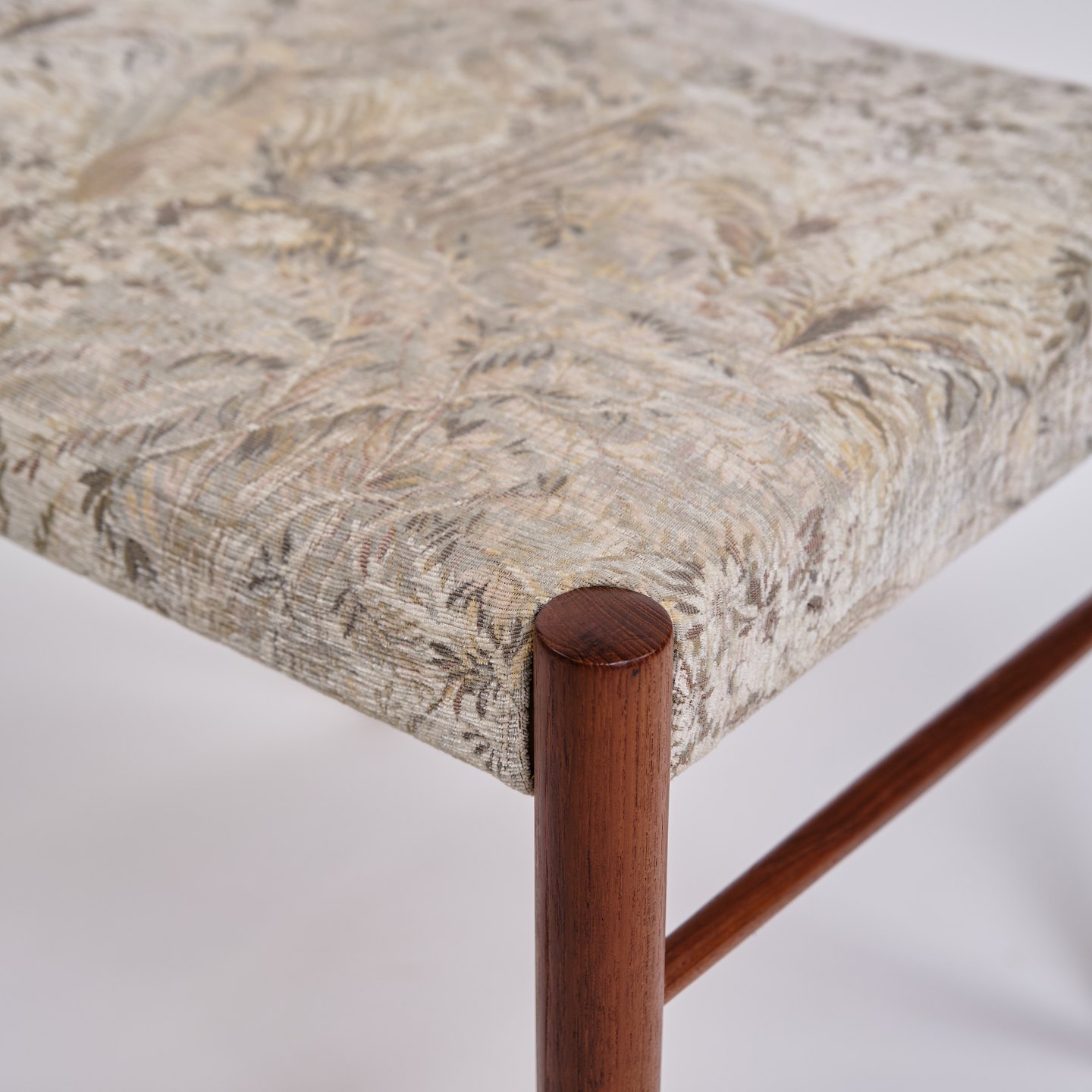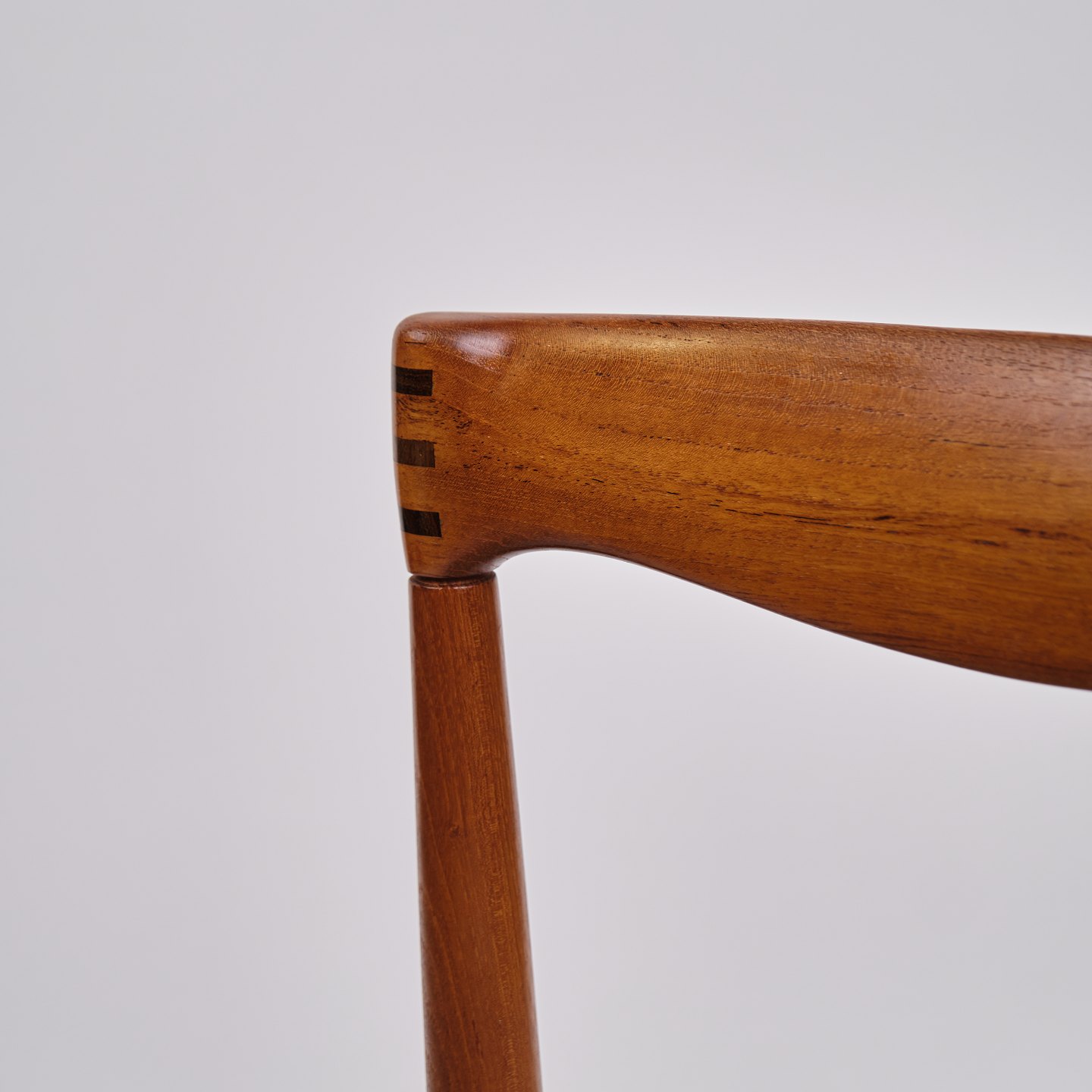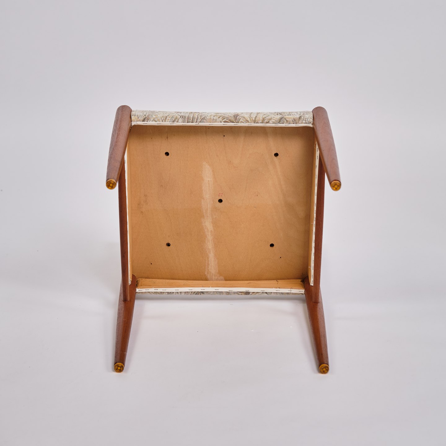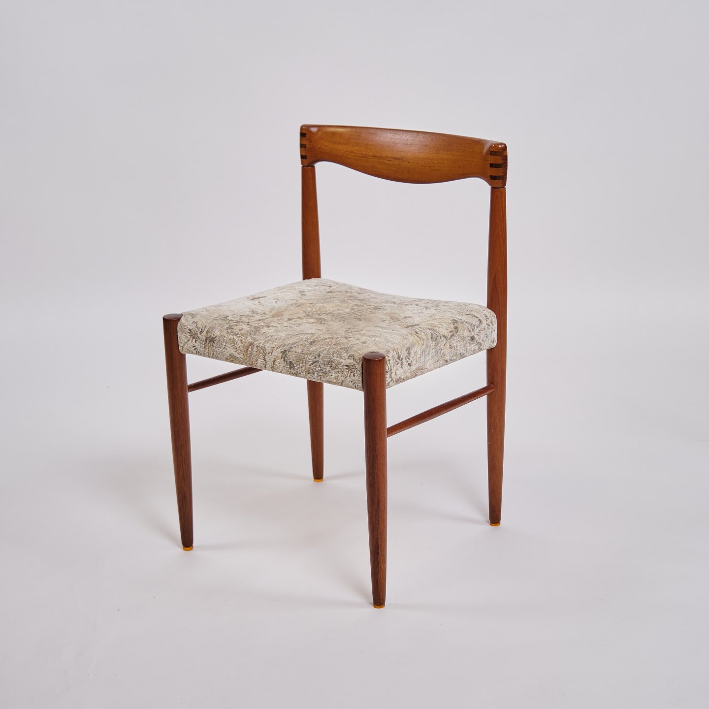 Sæt af seks spisebordsstole af Henry W. Klein for Bramin. Teaktræ og lys polstring. Danmark, 1960’erne. H: 75 cm, B: 48 cm, D: 43 cm, SH: 45 cm.