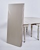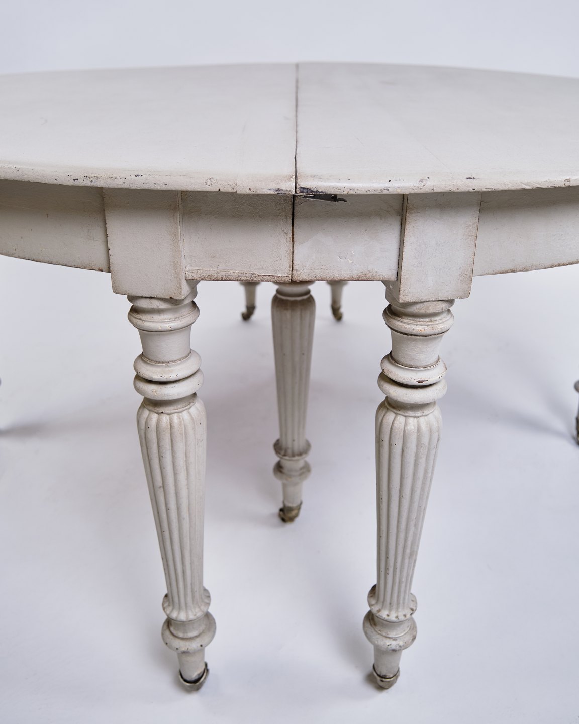 Gustaviansk rundt spisebord fra 1780’erne. Gråmalet med messinghjul. Med 1 plade á 30 cm og 4 á 60 cm.
