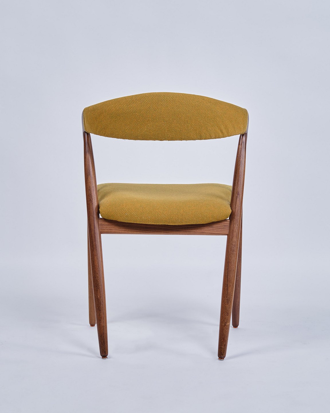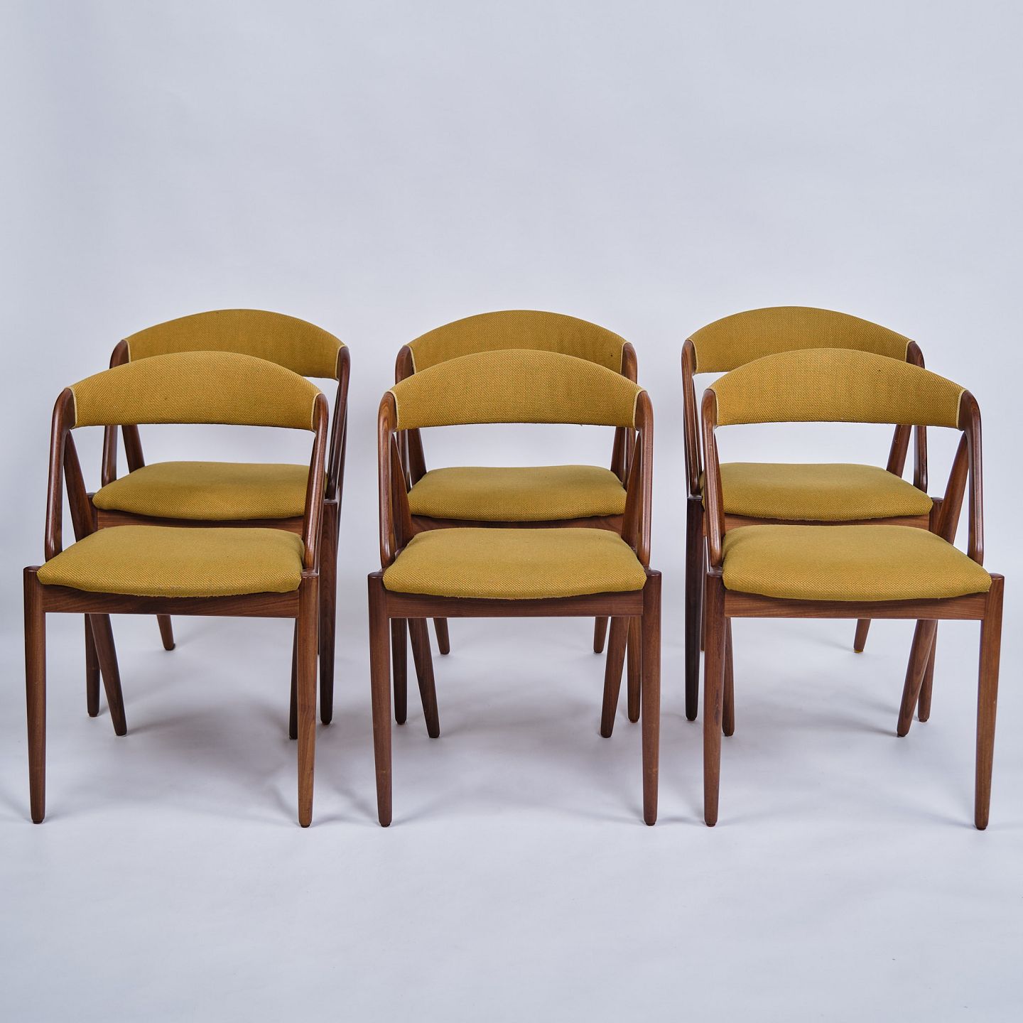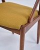 Sæt af seks spisebordsstole, model 31 af Kai Kristiansen. Teak med karry gul hallingdal polstring. Dansk design fra 1960.
