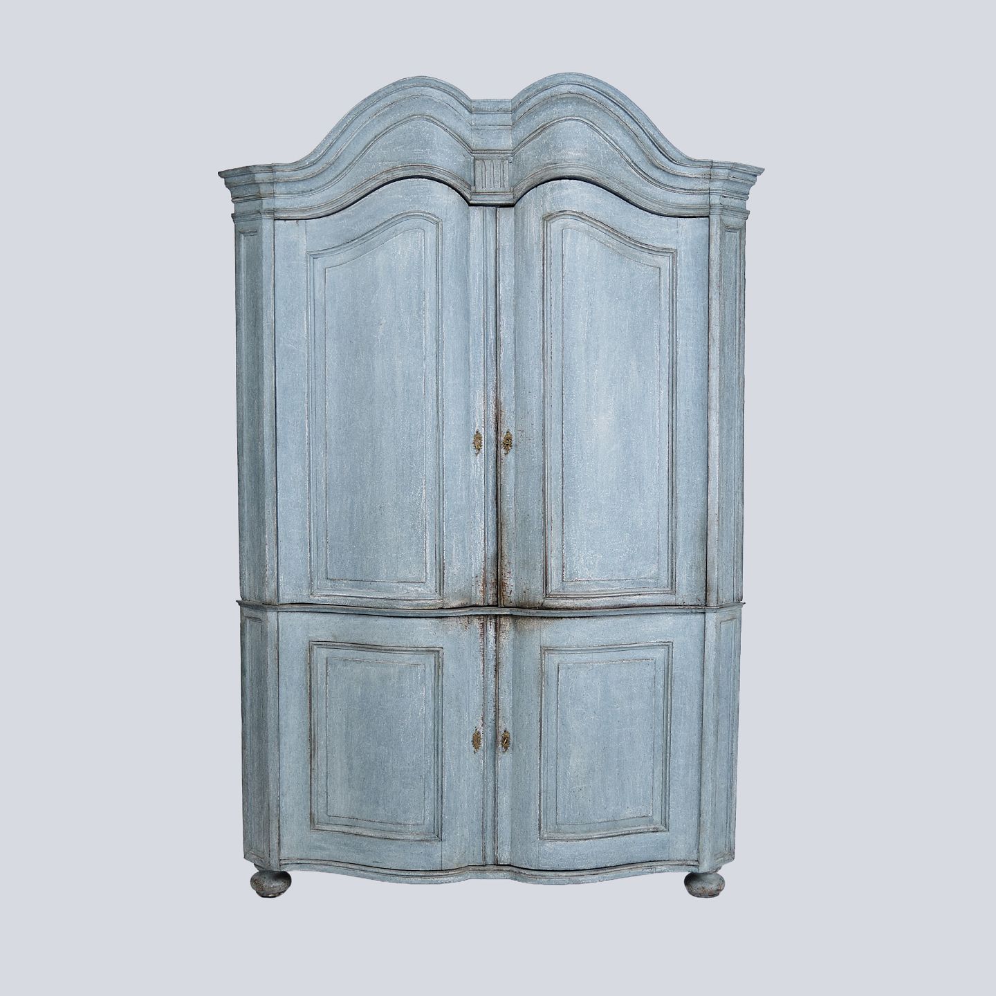 Grand meuble d’angle baroque datant des années 1780. Peinture bleue d’origine, portes courbées et garnitures en laiton. Meuble ancien rare et authentique.