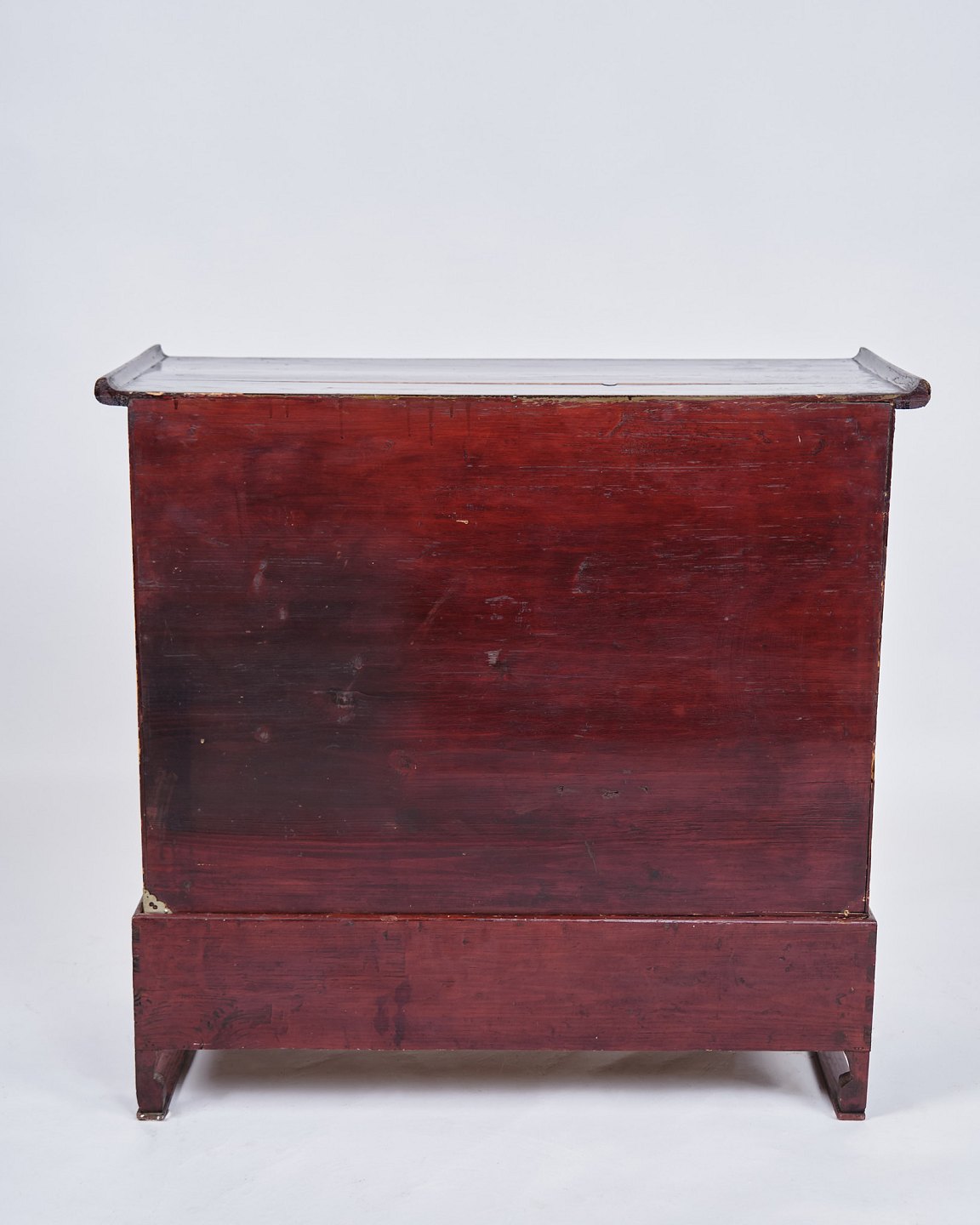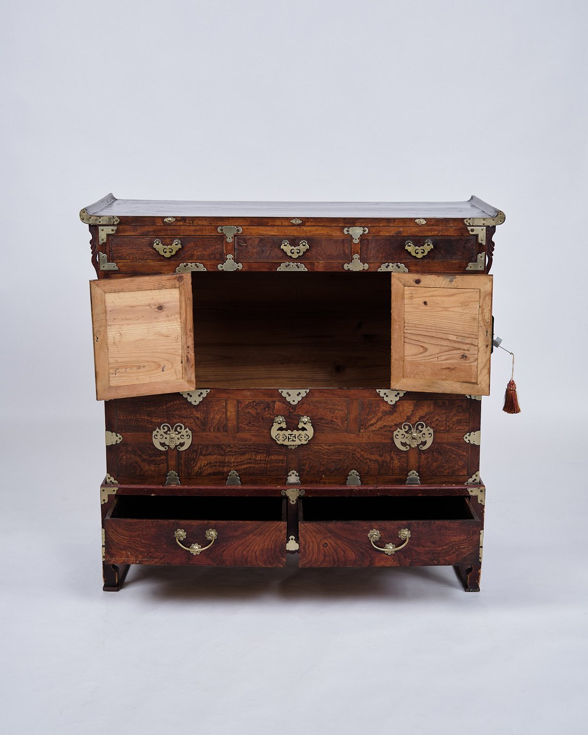 Antique Korean Bandaji chest/dresser from the 1900s, traditionally used as a wedding chest. Made of dark wood with decorative brass fittings, which highlight the craftsmanship and the rich cultural history of the chest.