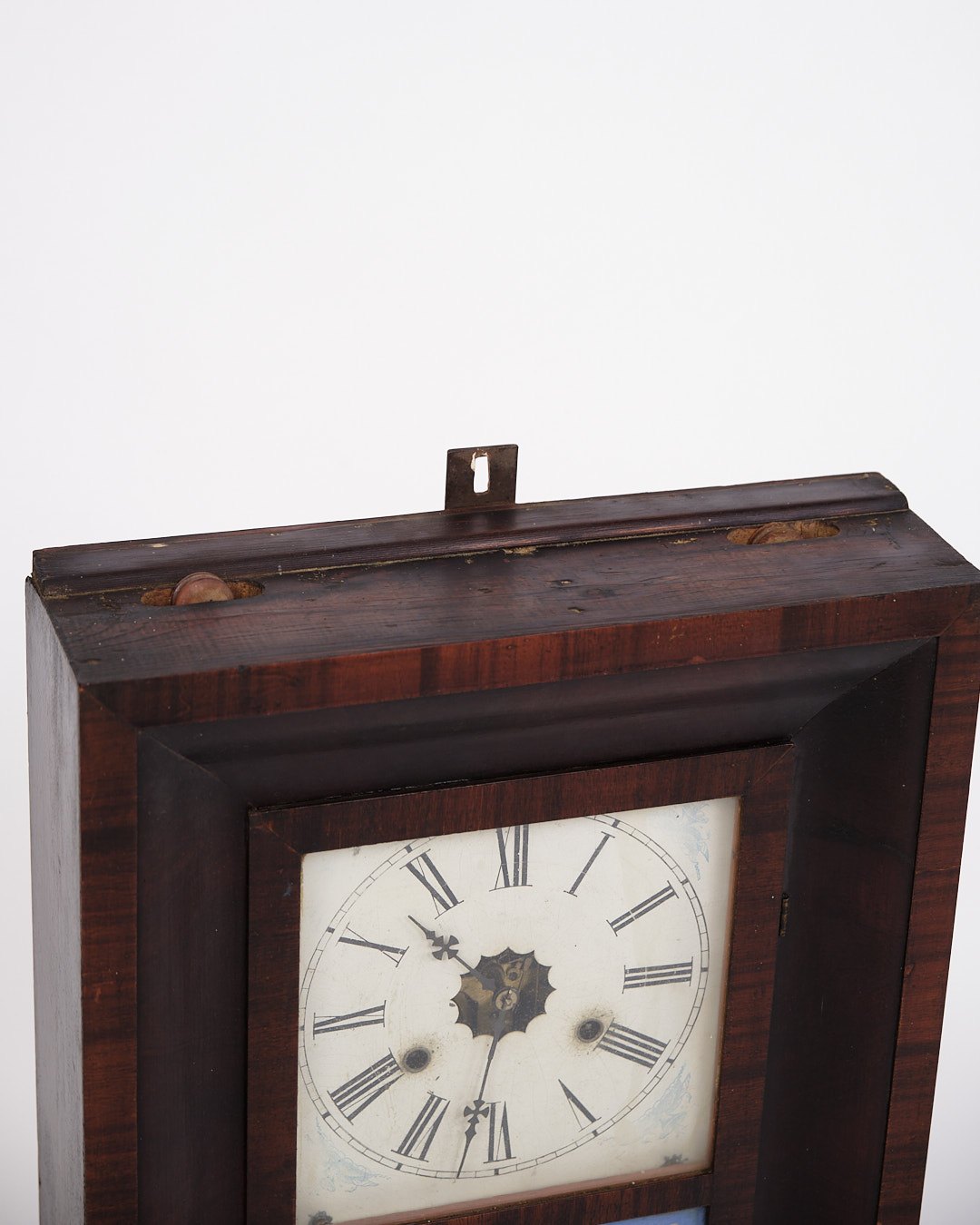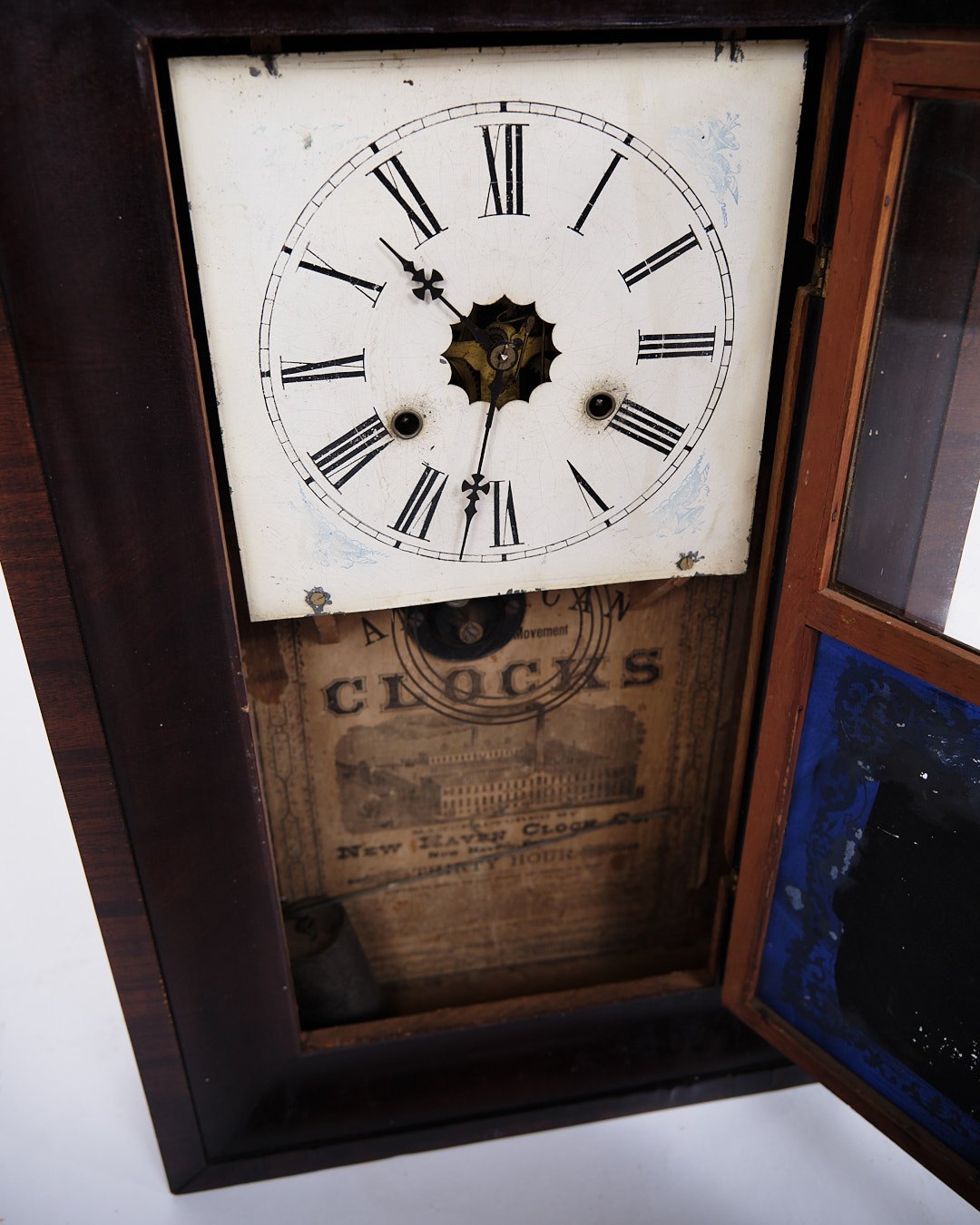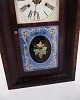 Dekorativt amerikanerur fra 1800-tallet, udført i mørkt træ. Uret har en klassisk urskive med romertal og en bemalet glasrude, der giver et charmerende og tidstypisk udtryk.