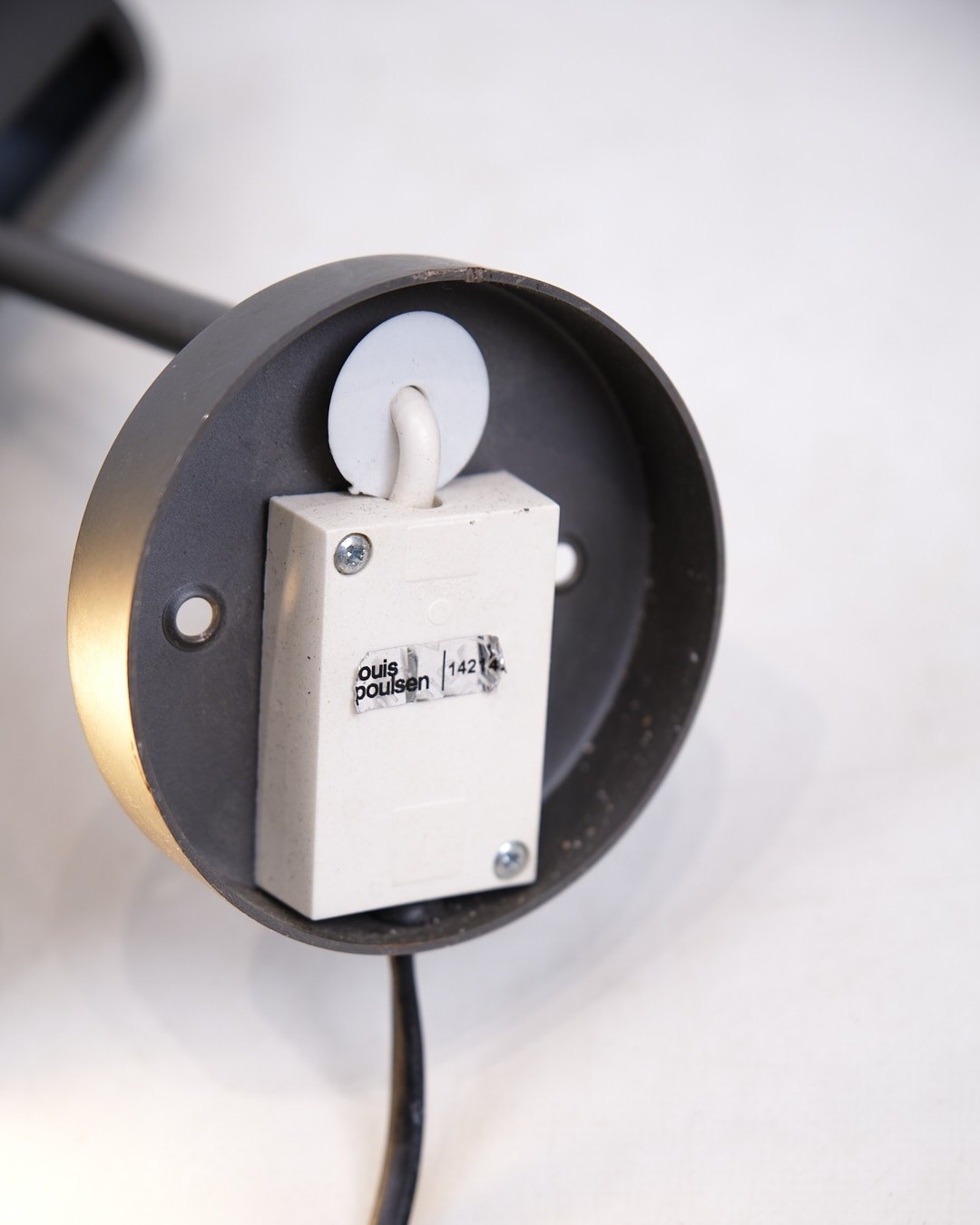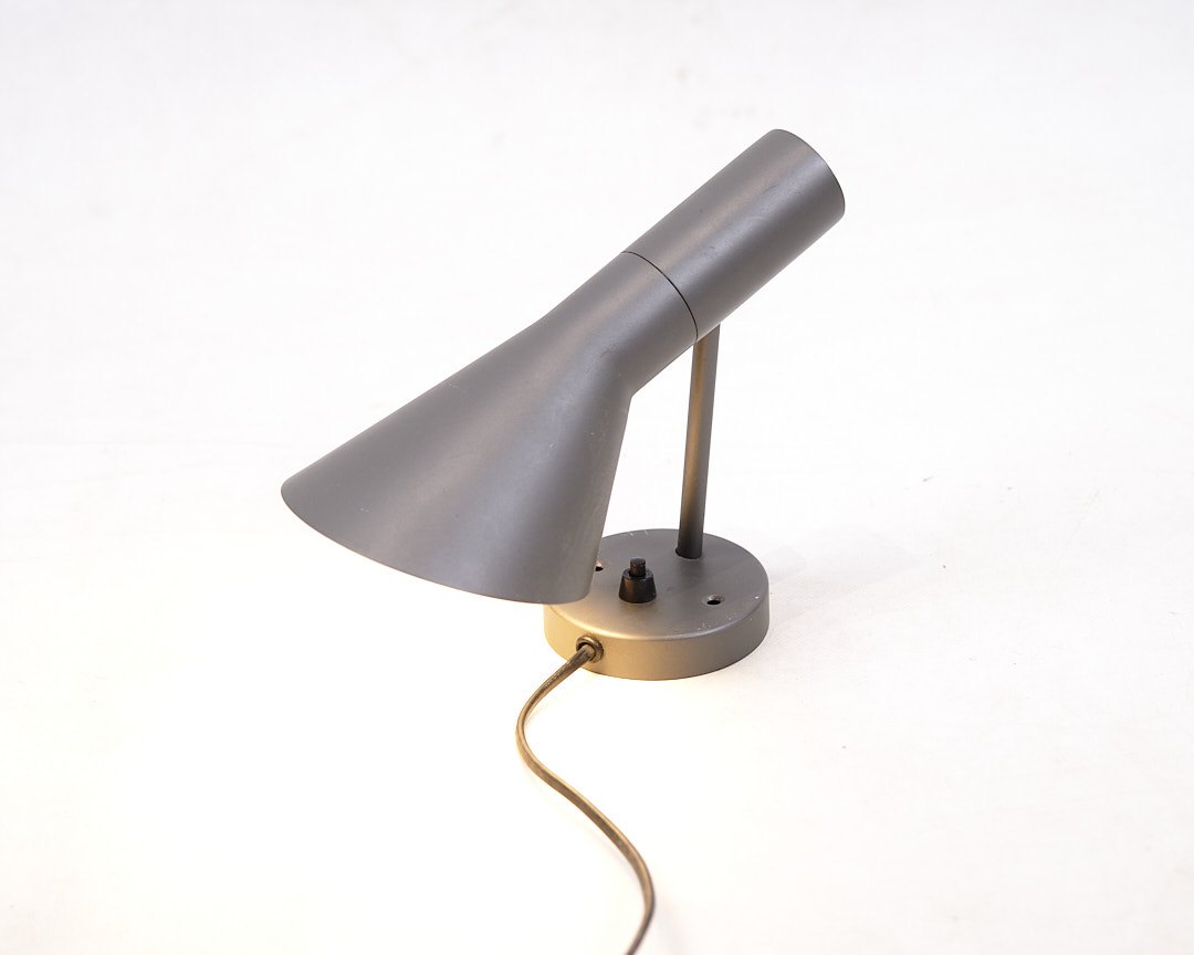 Set of two AJ wall lamps in light grey, designed by Arne Jacobsen in the 1960s and produced by Louis Poulsen. The lamps are made of powder-coated steel and have the characteristic shade-shaped design that provides both direct and directional light.
