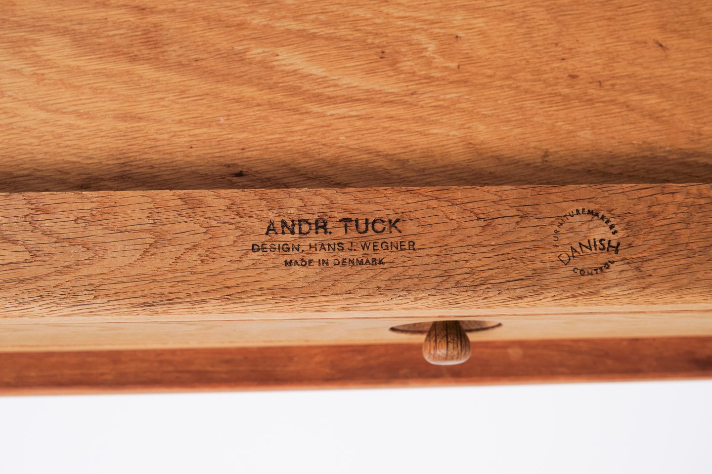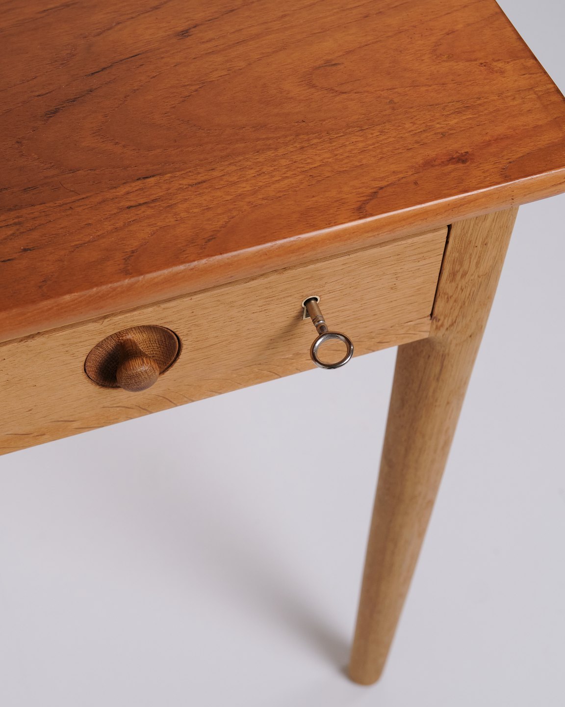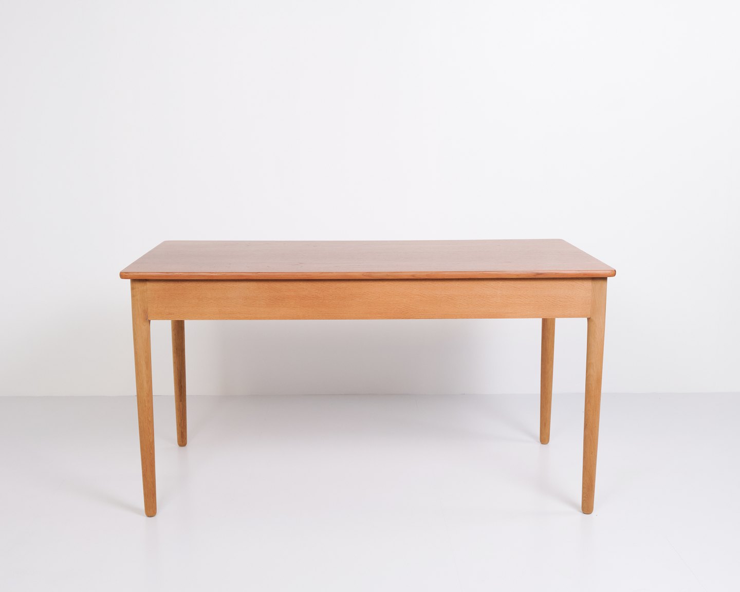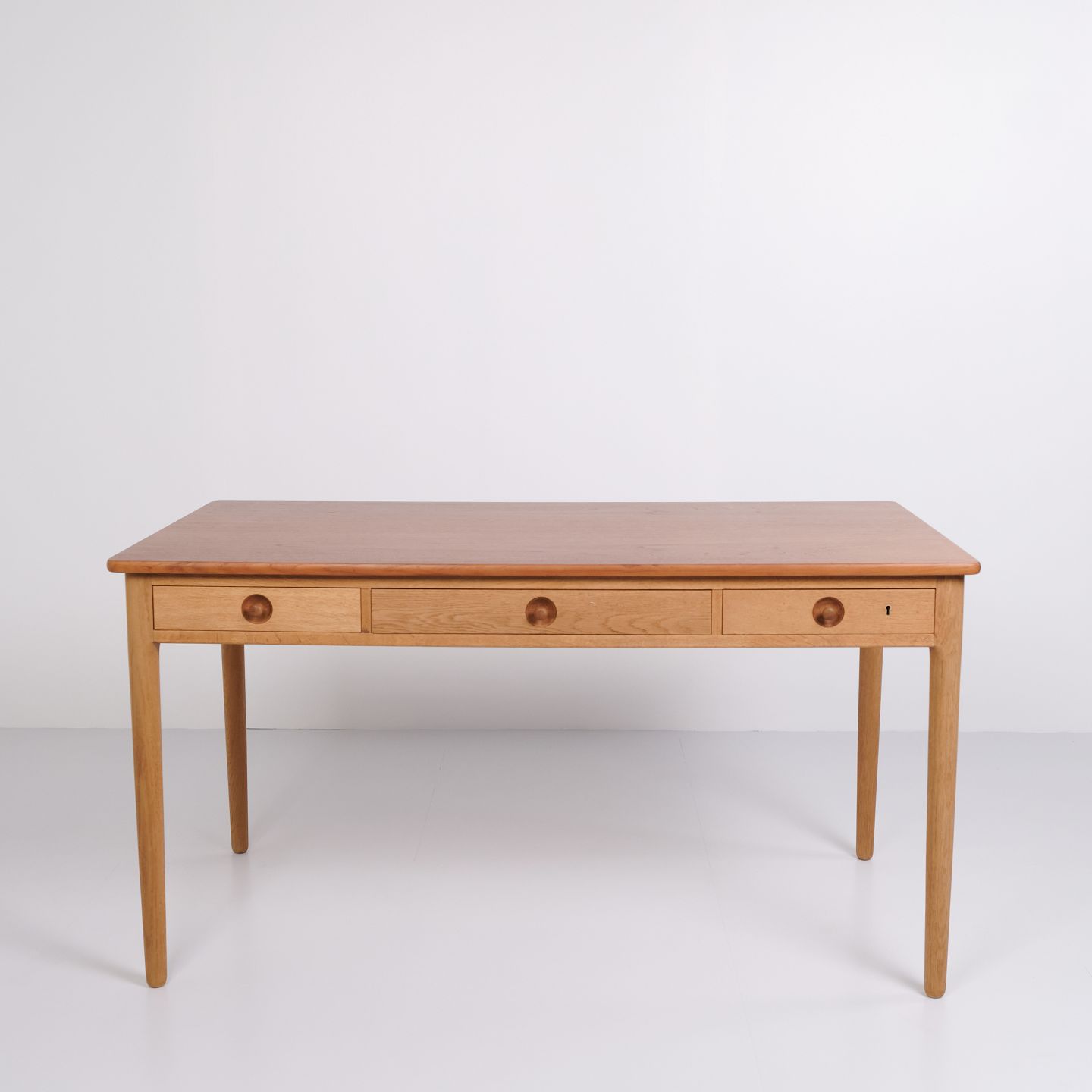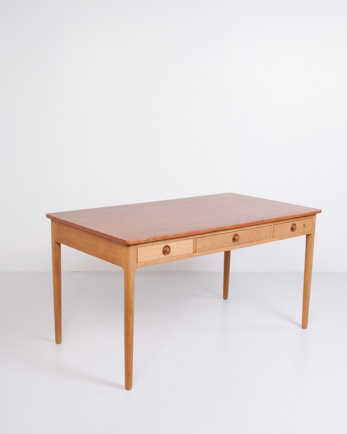 Skrivebord designet af Hans J. Wegner og produceret af Andreas Tuck i 1960’erne. Bordet er udført i teak med benkonstruktion i eg – en klassisk materialekombination, der fremhæver Wegners sans for proportioner og naturlig balance. Bordet har skuffer i fronten.