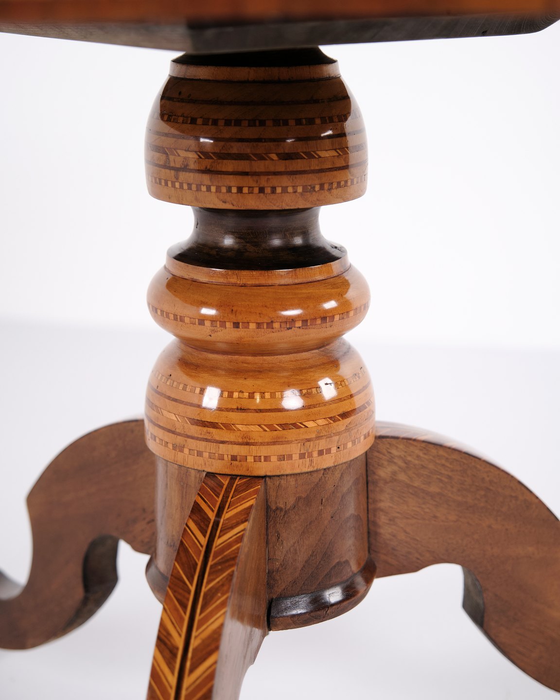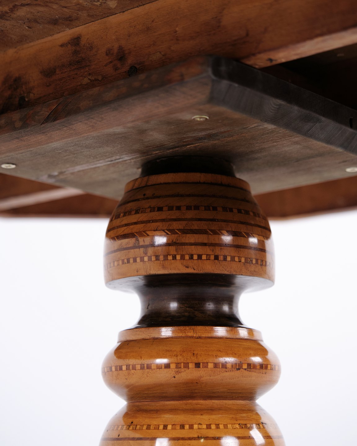 Octagonal column table from Italy, dated to the 1850s. The table is richly decorated with hand-laid intarsia, which emphasizes the geometric shapes and the overall decorative expression.
