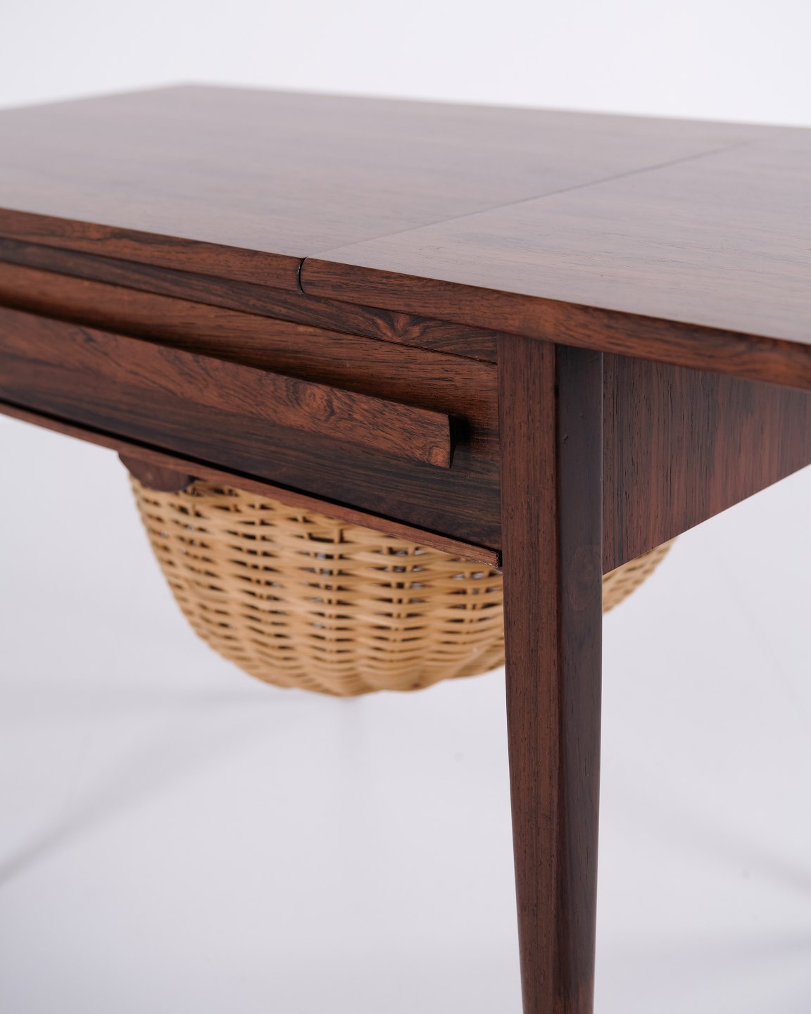 Foldbart sybord designet af Johannes Andersen og fremstillet af Silkeborg Møbelfabrik i 1960’erne. Bordet er udført i palisander og har både skuffe og udklappelig bordplade, hvilket gør det særligt funktionelt til opbevaring og arbejde.
