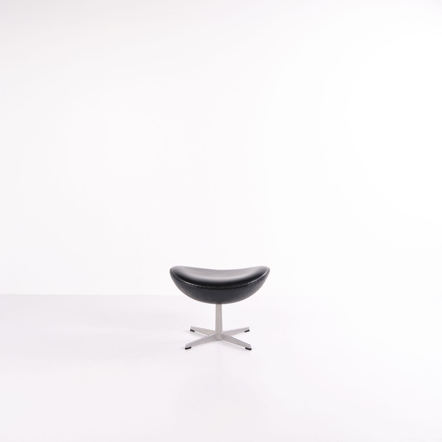 Stool for the Egg Chair, designed by Arne Jacobsen and produced by Fritz Hansen in 2006. Upholstered in black Elegance leather and fitted with an aluminium star base. High-quality materials and craftsmanship consistent with Fritz Hansen’s production standards.