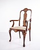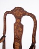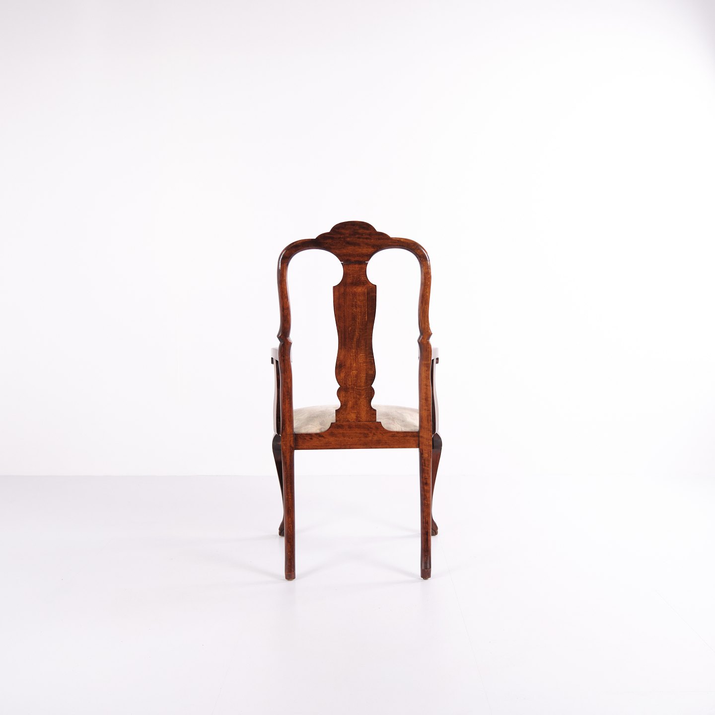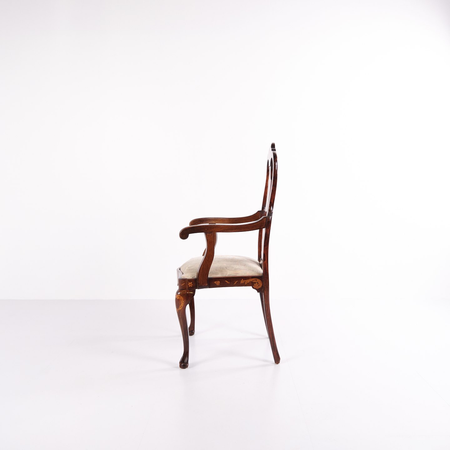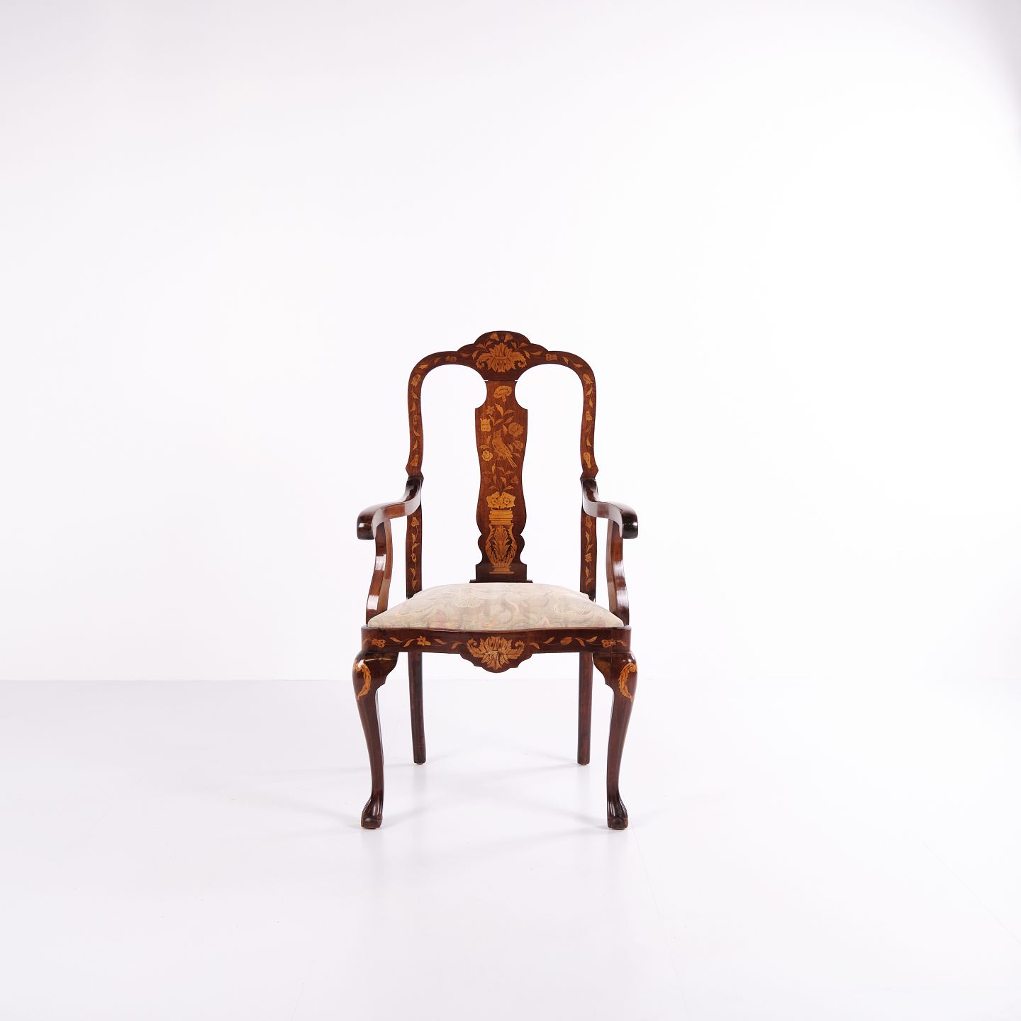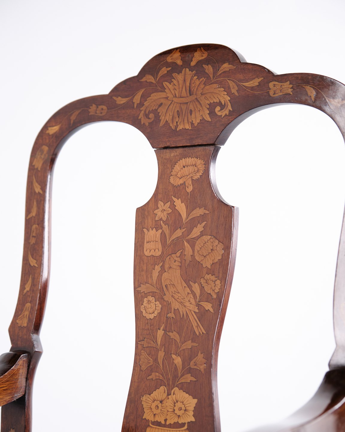 Mid-18th century armchair in Queen Anne style, crafted in walnut with detailed fruitwood inlay. The decoration features floral, bird and butterfly motifs. Finished with hand-polished shellac, enhancing the warm tone of the wood and the refined craftsmanship.