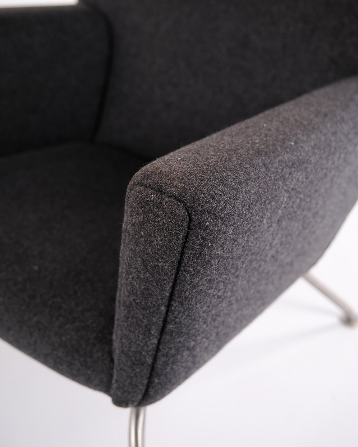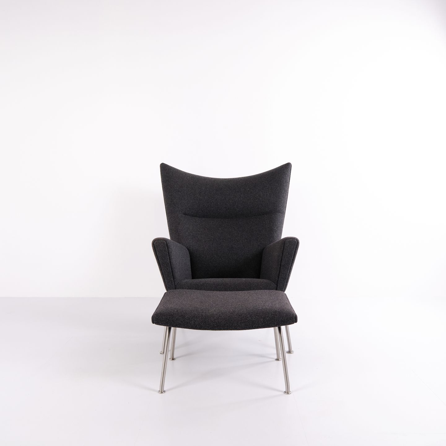 CH445 Wingchair designed by Hans J. Wegner and produced by Carl Hansen & Søn. Upholstered in grey Hallingdal fabric with matching footstool. A classic high-back Wegner model with distinctive wings and excellent seating comfort. A well-known Danish design icon.