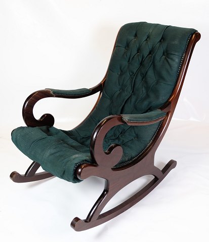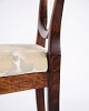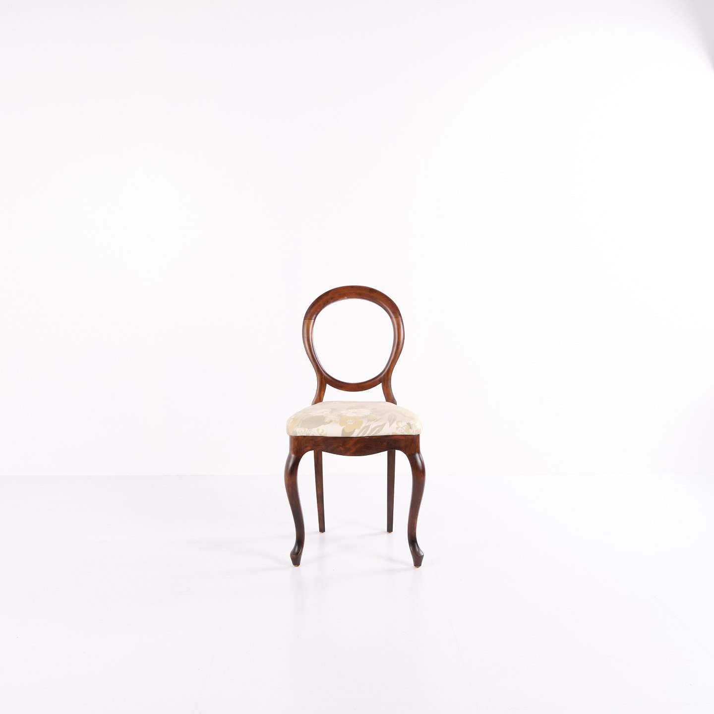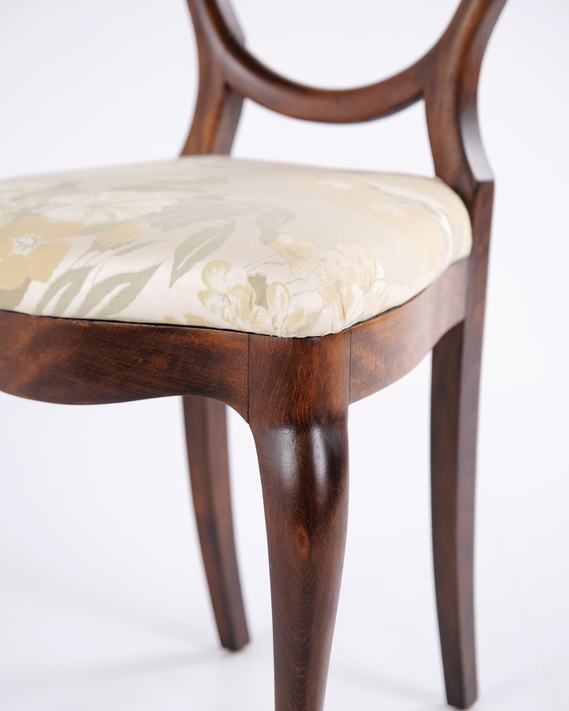 Set of four salon/dining chairs from the 1860s, made of mahogany and upholstered in light floral fabric. Rococo-inspired design with carved details and classic proportions. Elegant chairs for dining rooms, living spaces or hallways.